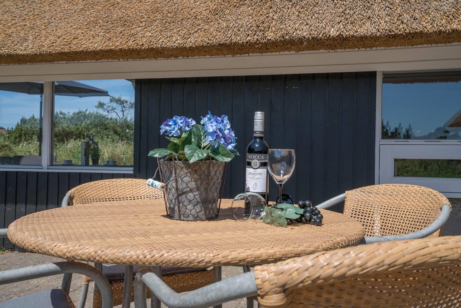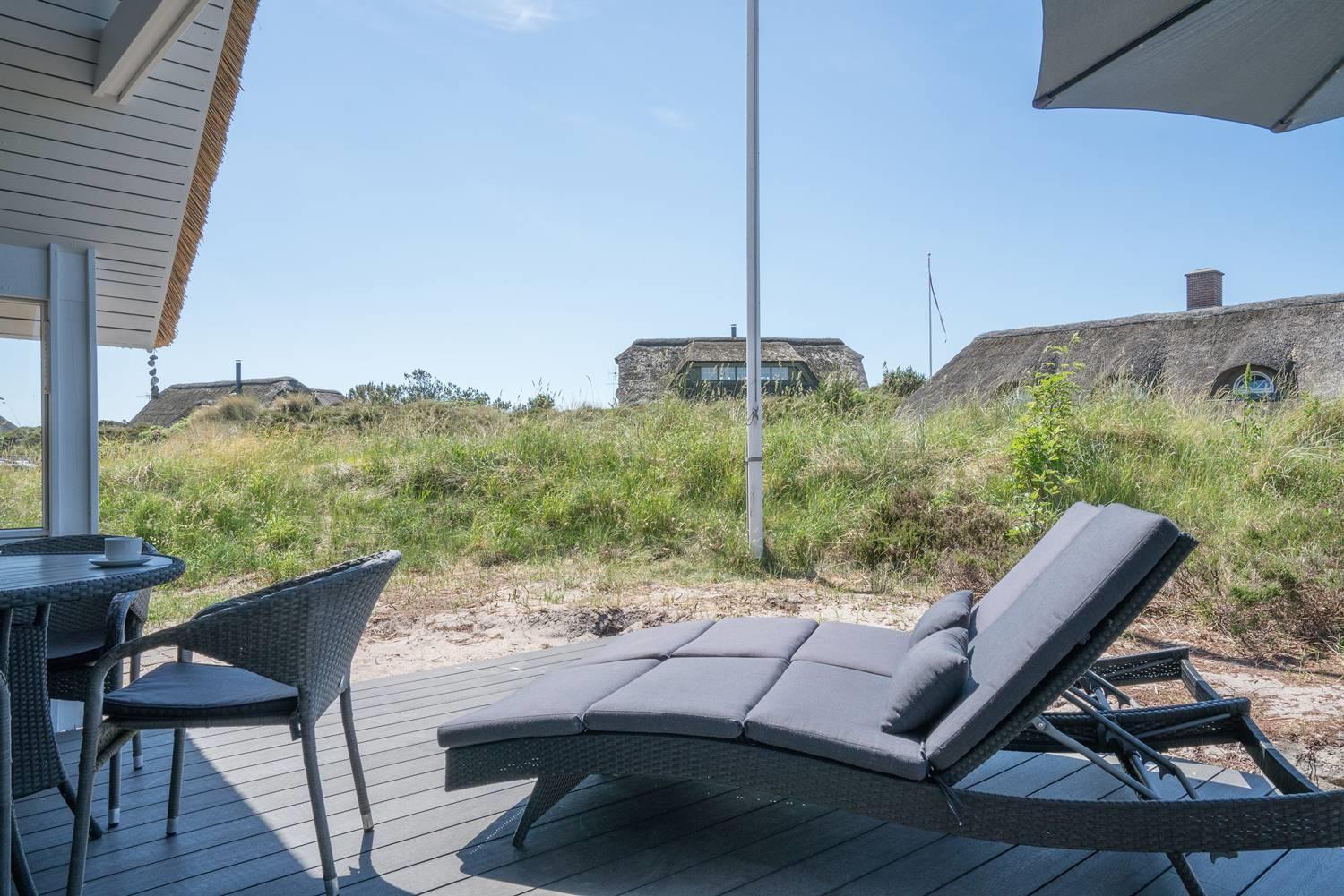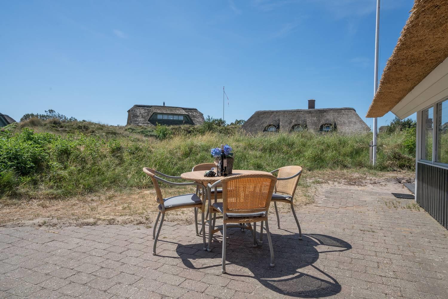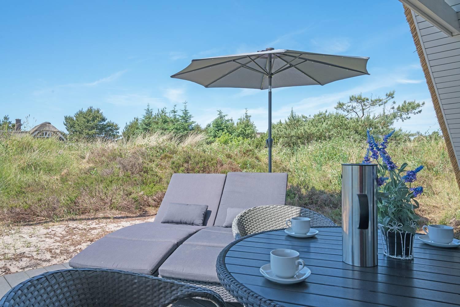 I stuen kan du tænde op i brændeovnen og nyde de hyggelige aftener med spil, bøger eller bare ro og samvær. Herfra er der direkte udgang til en hyggelig, delvist overdækket terrasse – perfekt til solrige dage og rolige aftener med et glas vin i hånden. Liggestolene står klar – det eneste du skal gøre, er at læne dig tilbage og nyde ferien.