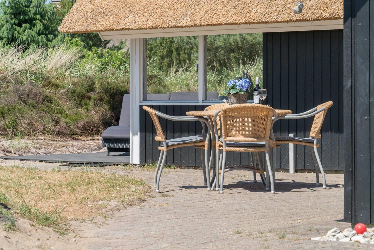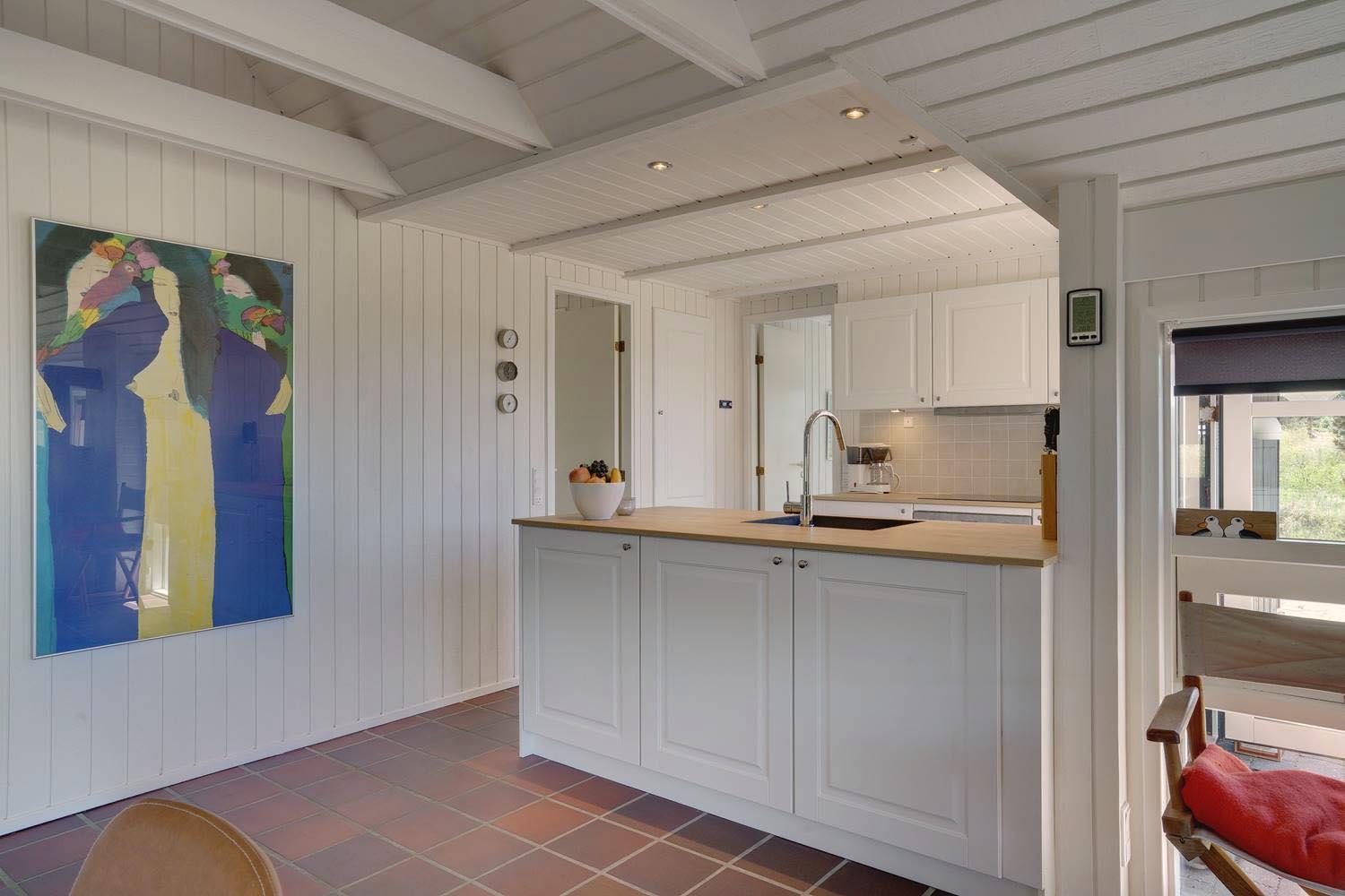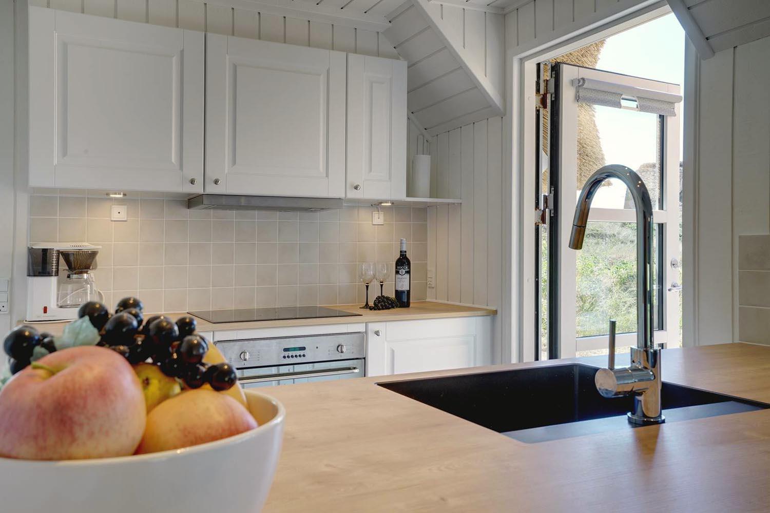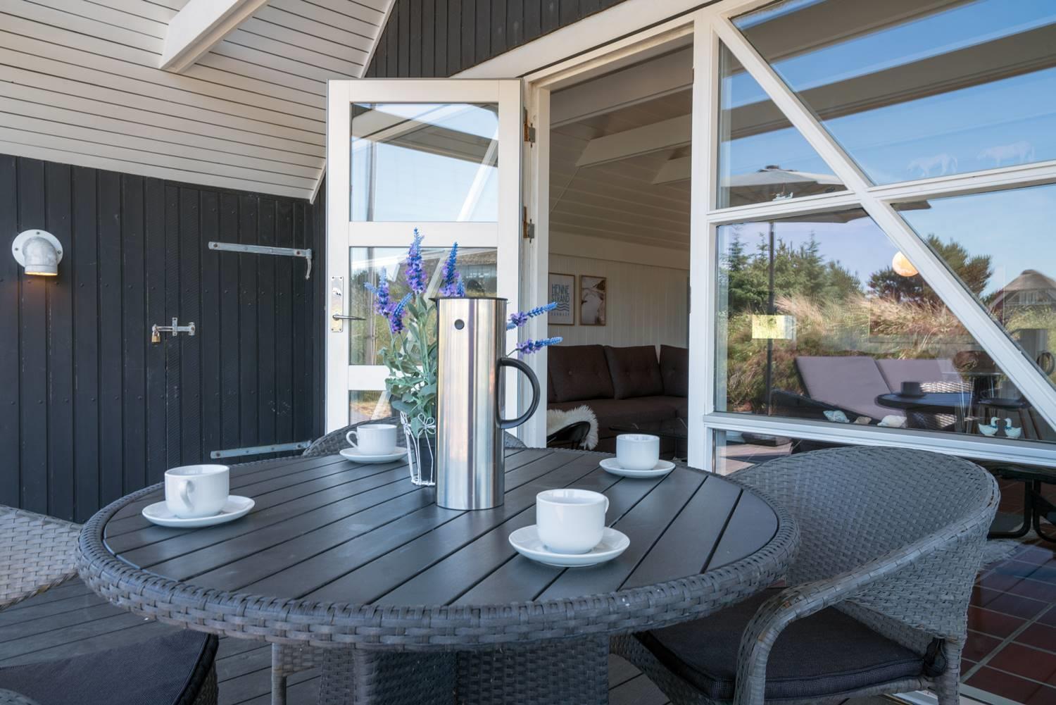I stuen kan du tænde op i brændeovnen og nyde de hyggelige aftener med spil, bøger eller bare ro og samvær. Herfra er der direkte udgang til en hyggelig, delvist overdækket terrasse – perfekt til solrige dage og rolige aftener med et glas vin i hånden. Liggestolene står klar – det eneste du skal gøre, er at læne dig tilbage og nyde ferien.