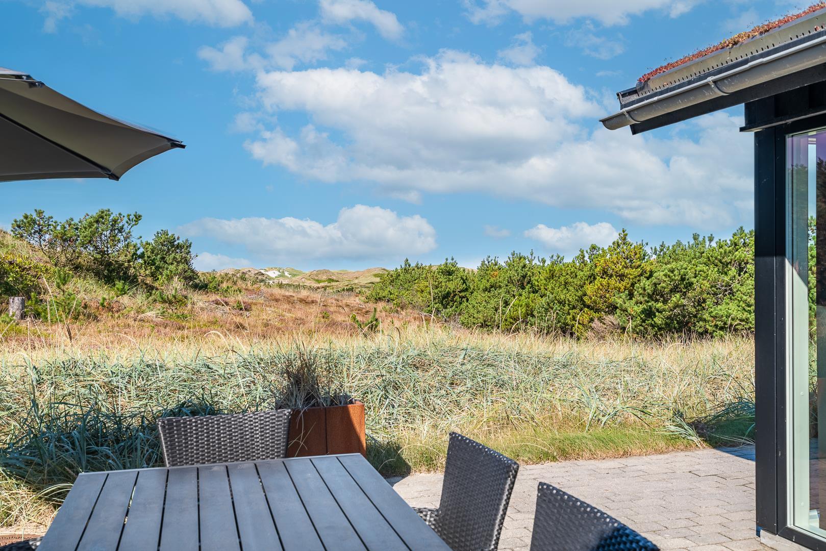 Udendørs område omkring sommerhuset på Timianvej 26 er skabt til afslapning i rolige, naturskønne rammer. Den store terrasse ligger med direkte udsigt til de vestjyske klitter og indbyder til både solbadning, måltider i det fri og hyggelige grillaftener. Her får I jeres eget private spot midt i naturen – med fred og frisk havluft som baggrund.