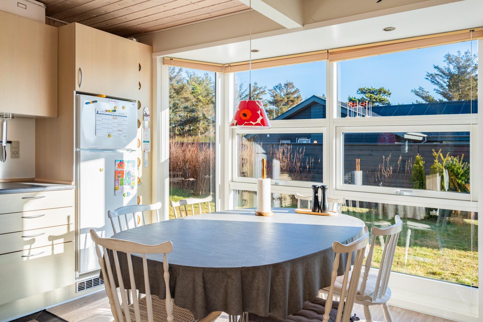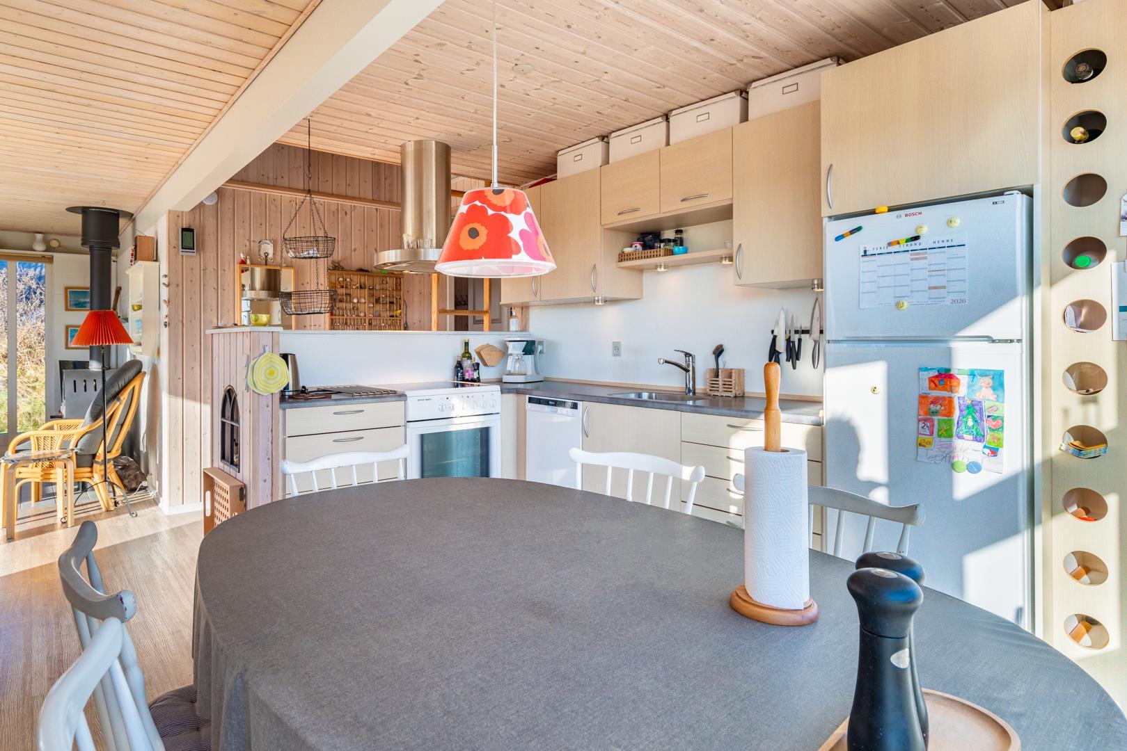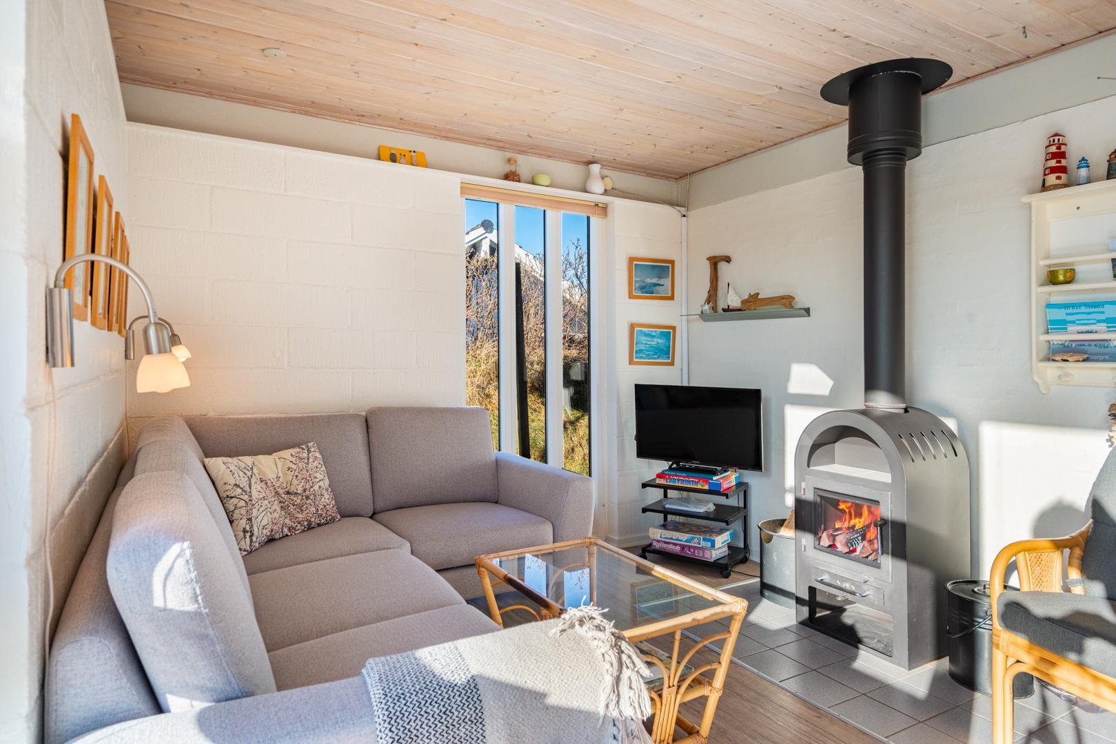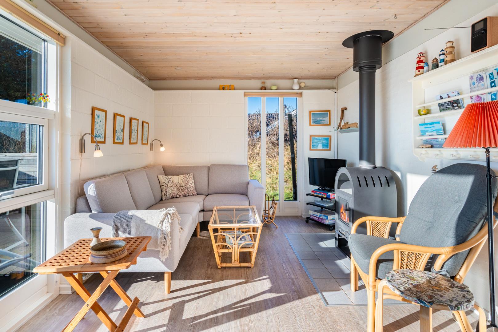 Sommerhuset byder på en lys og indbydende atmosfære. Det åbne opholds- og spiseområde er husets samlingspunkt, hvor I kan slappe af efter en dag ved stranden. Tænd op i brændeovnen og nyd den klassiske danske sommerhusstemning, mens varmepumpen sørger for et behageligt indeklima hele året.