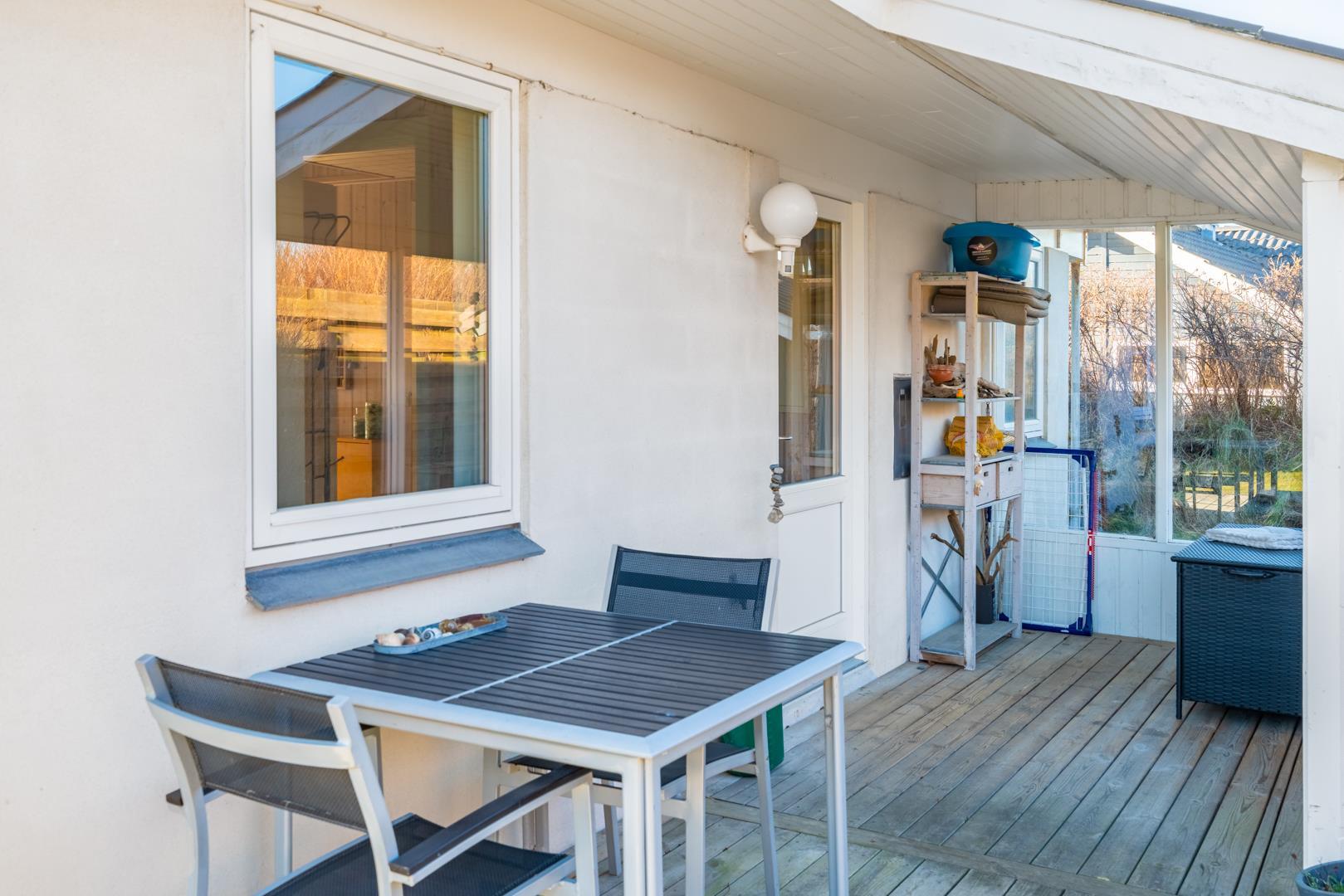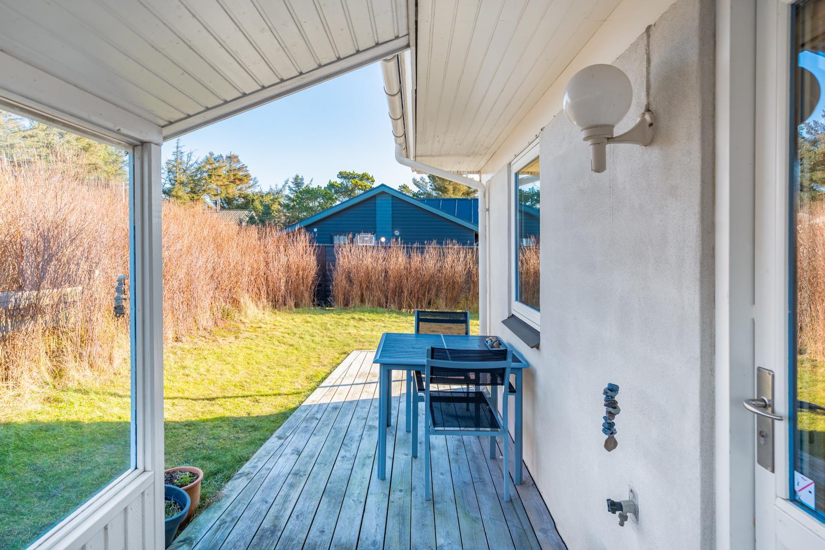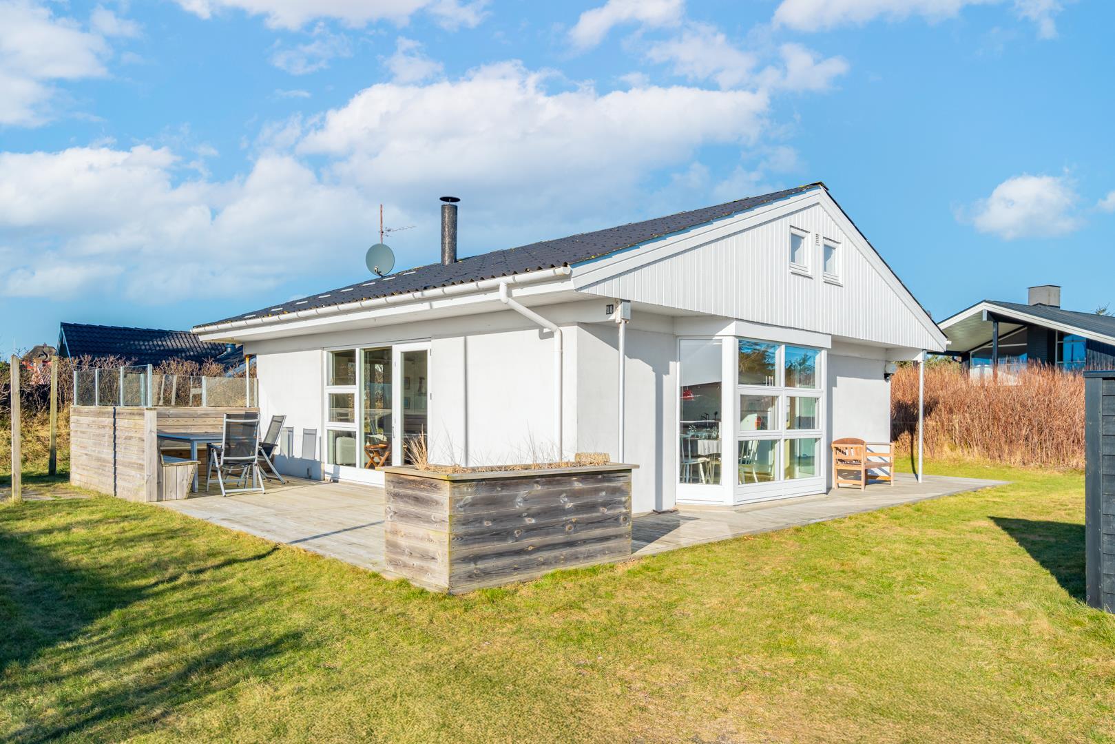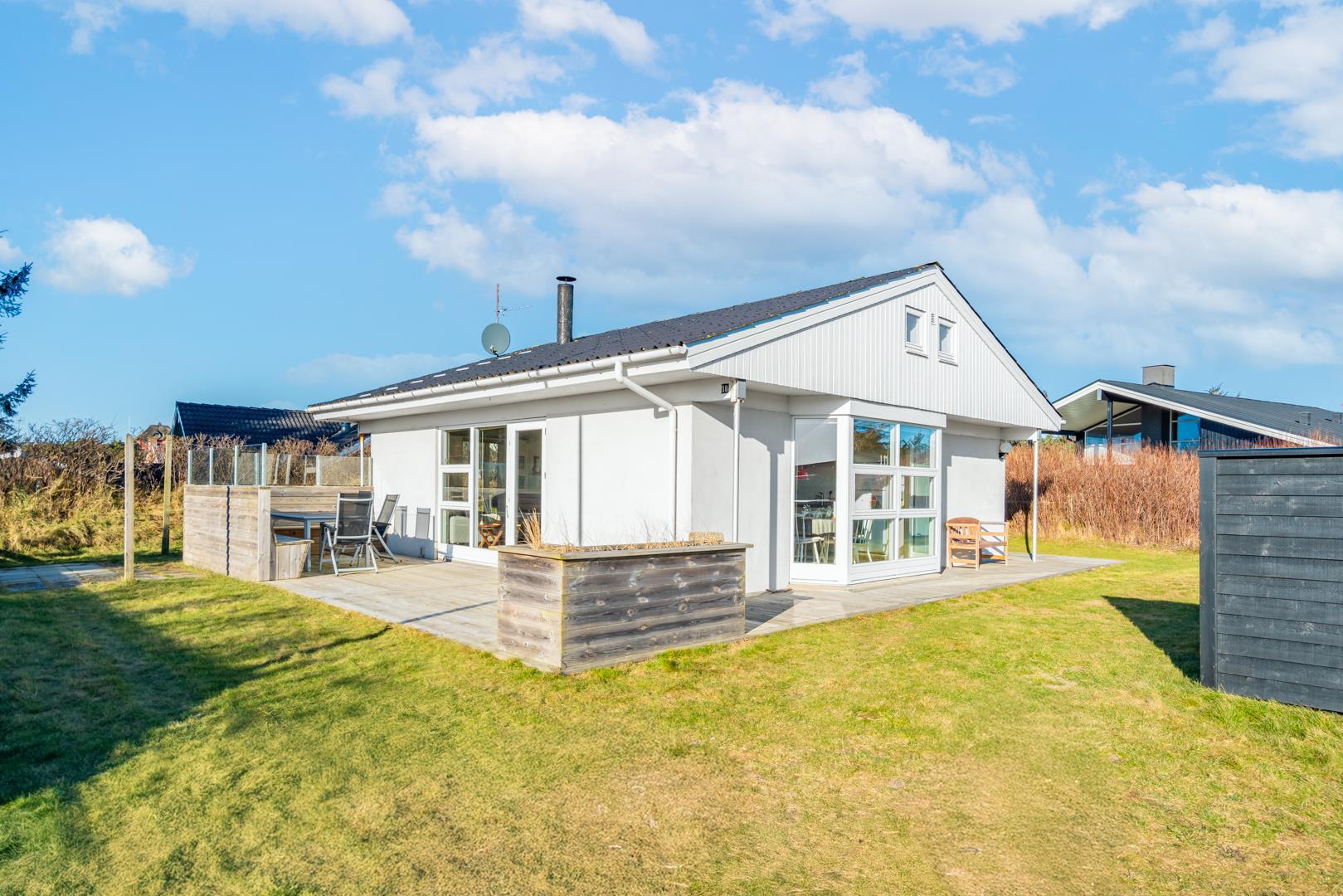 Udendørsområdet giver gode muligheder for at nyde ferien ved Vesterhavet. Start dagen med en kop kaffe på terrassen i den friske havluft, eller lad aftenen falde roligt på plads efter en gåtur langs stranden.