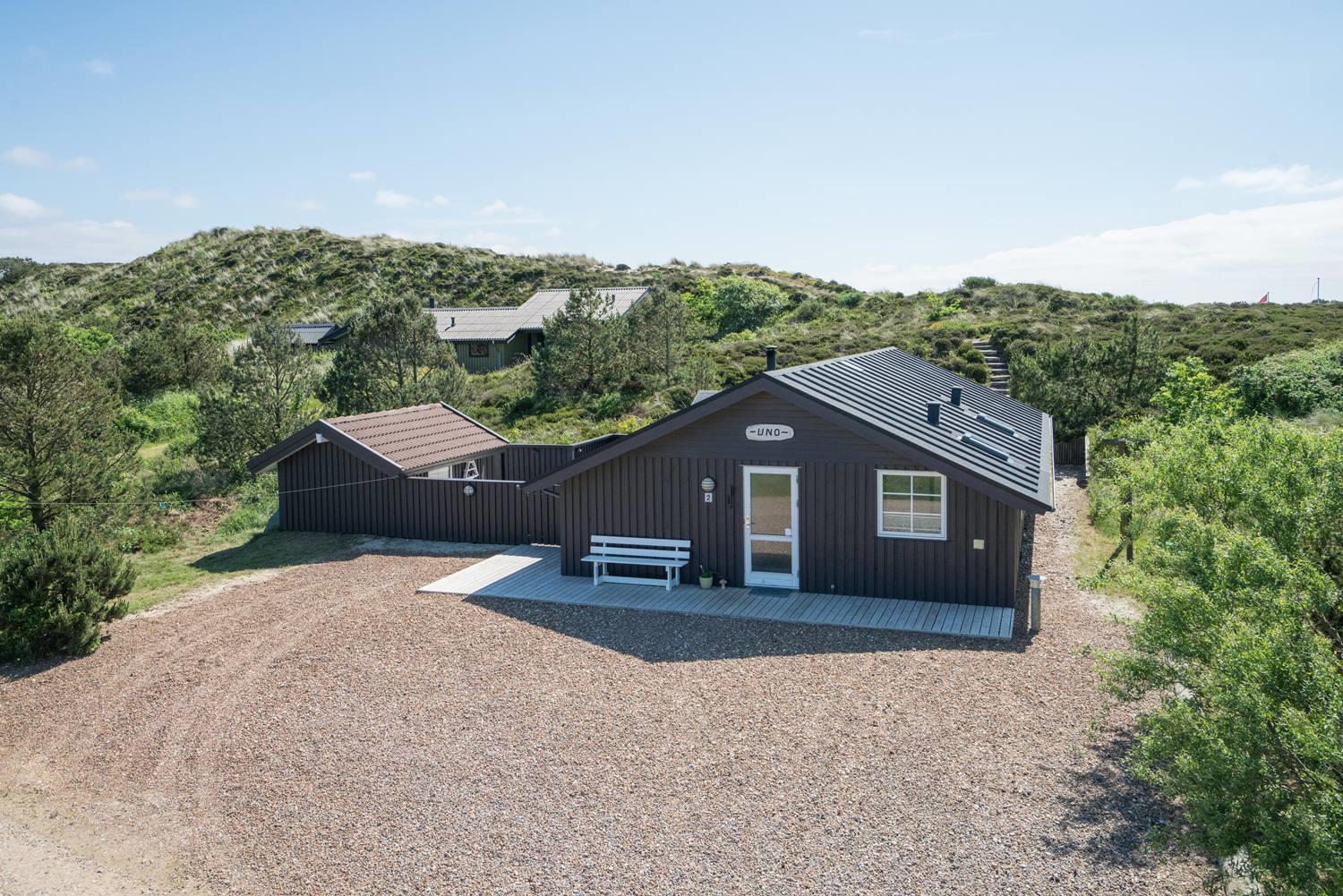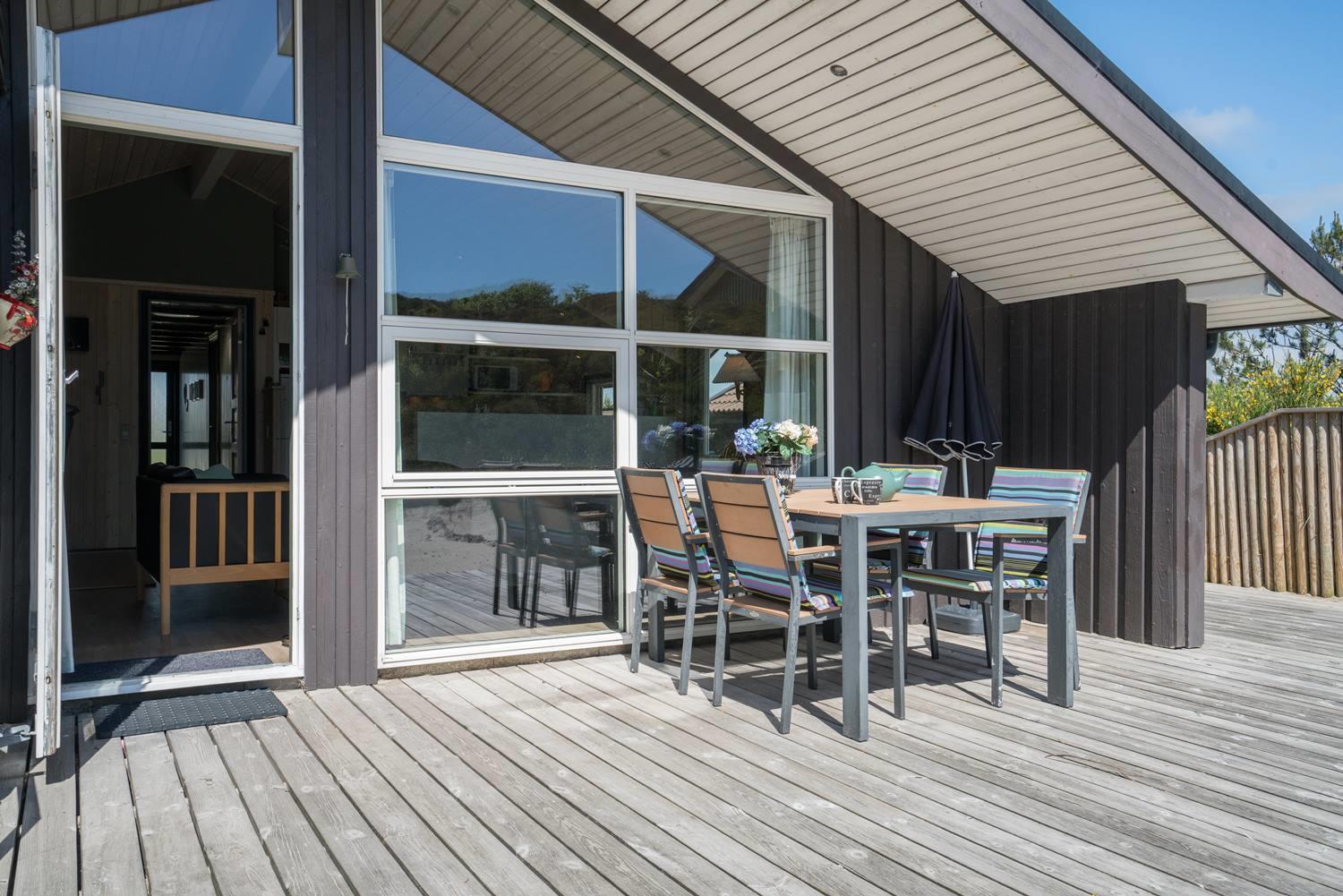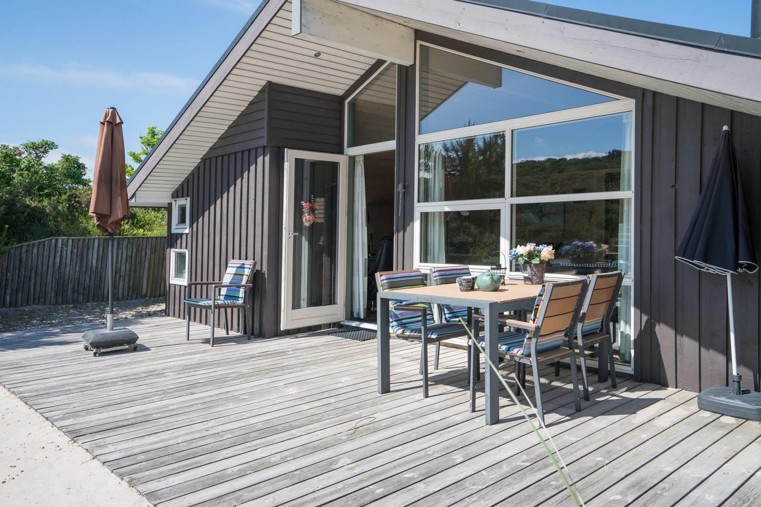 Hyggeligt og velholdt feriehus på klitgrund nær Henne Strand med to badeværelser og stor lukket terrasse.