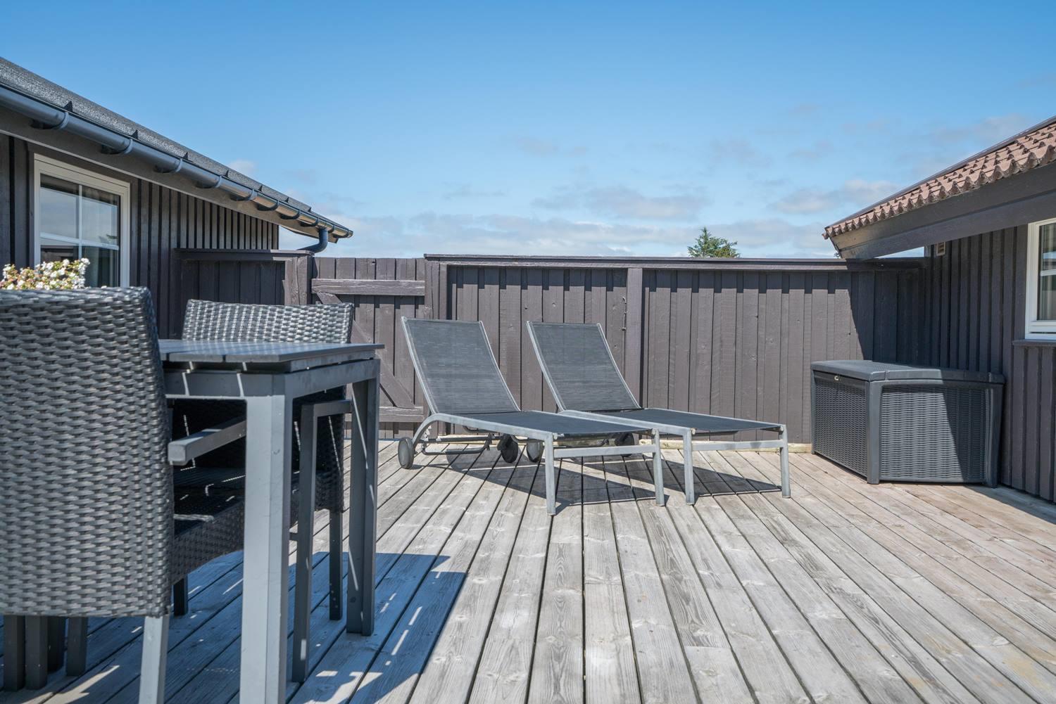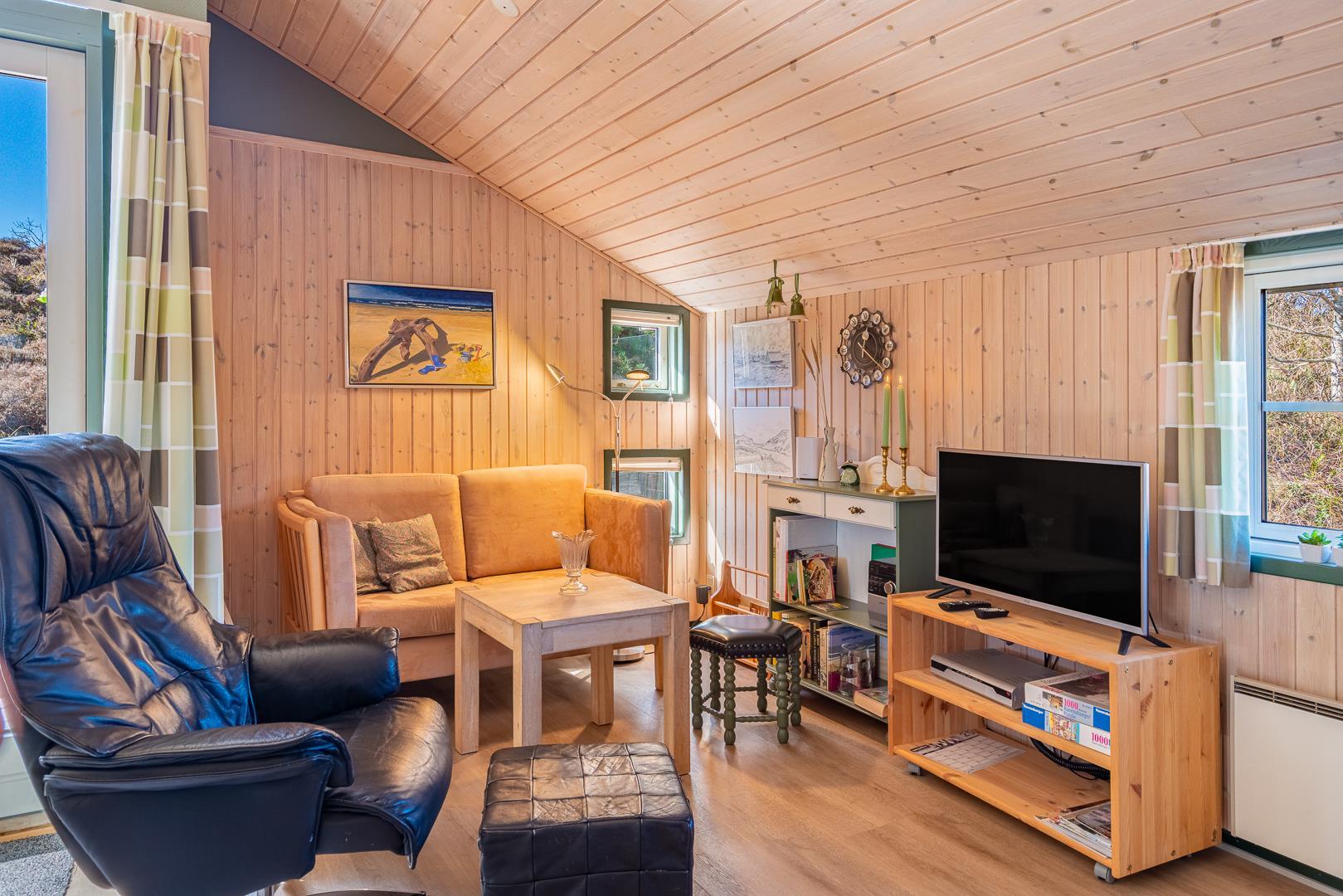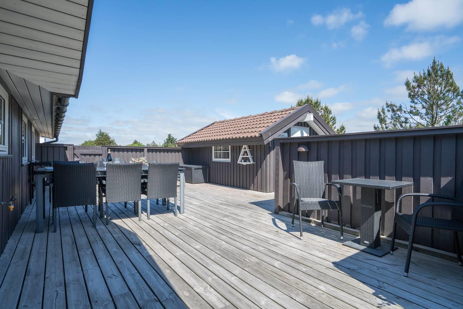 Hyggeligt og velholdt feriehus på klitgrund nær Henne Strand med to badeværelser og stor lukket terrasse.