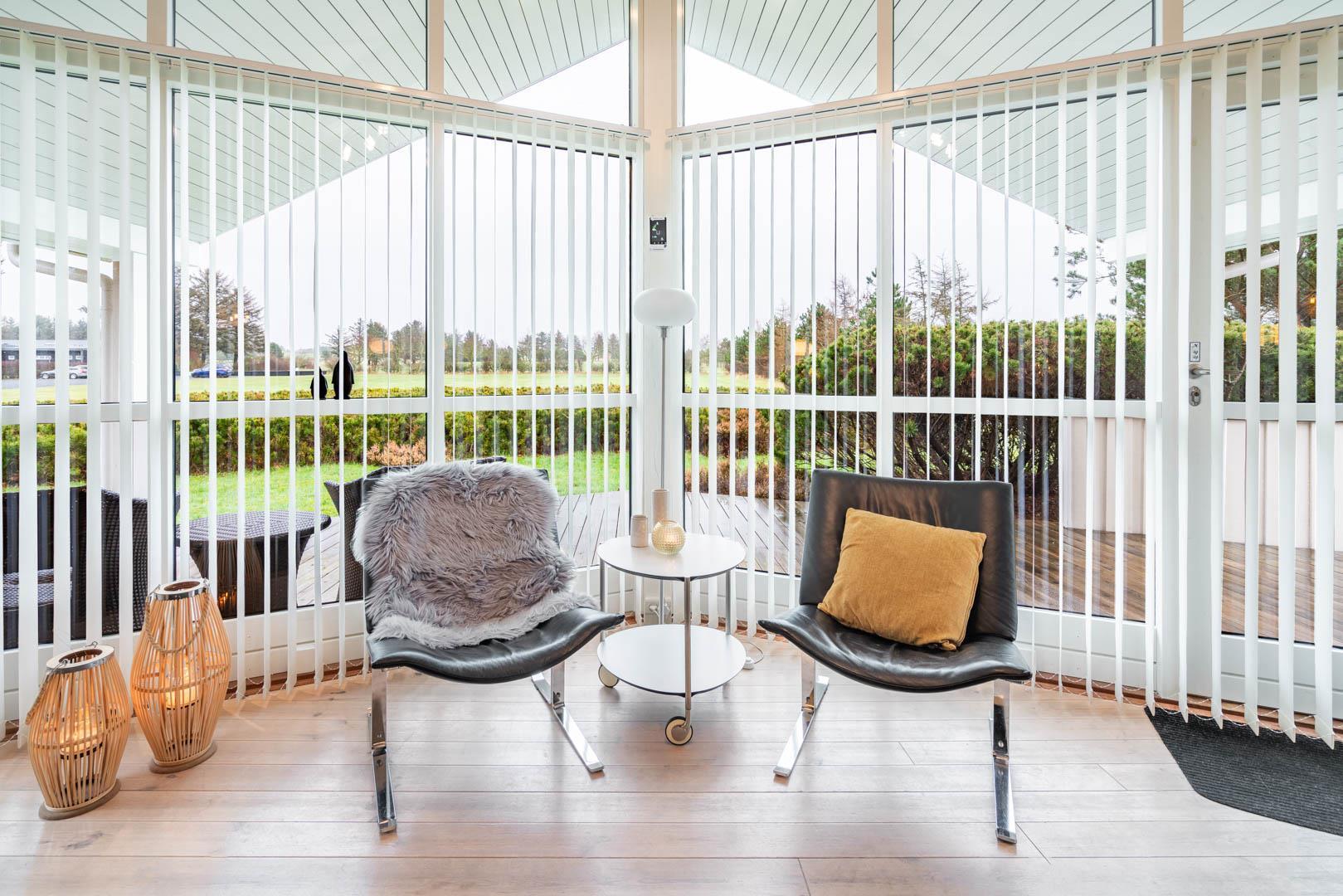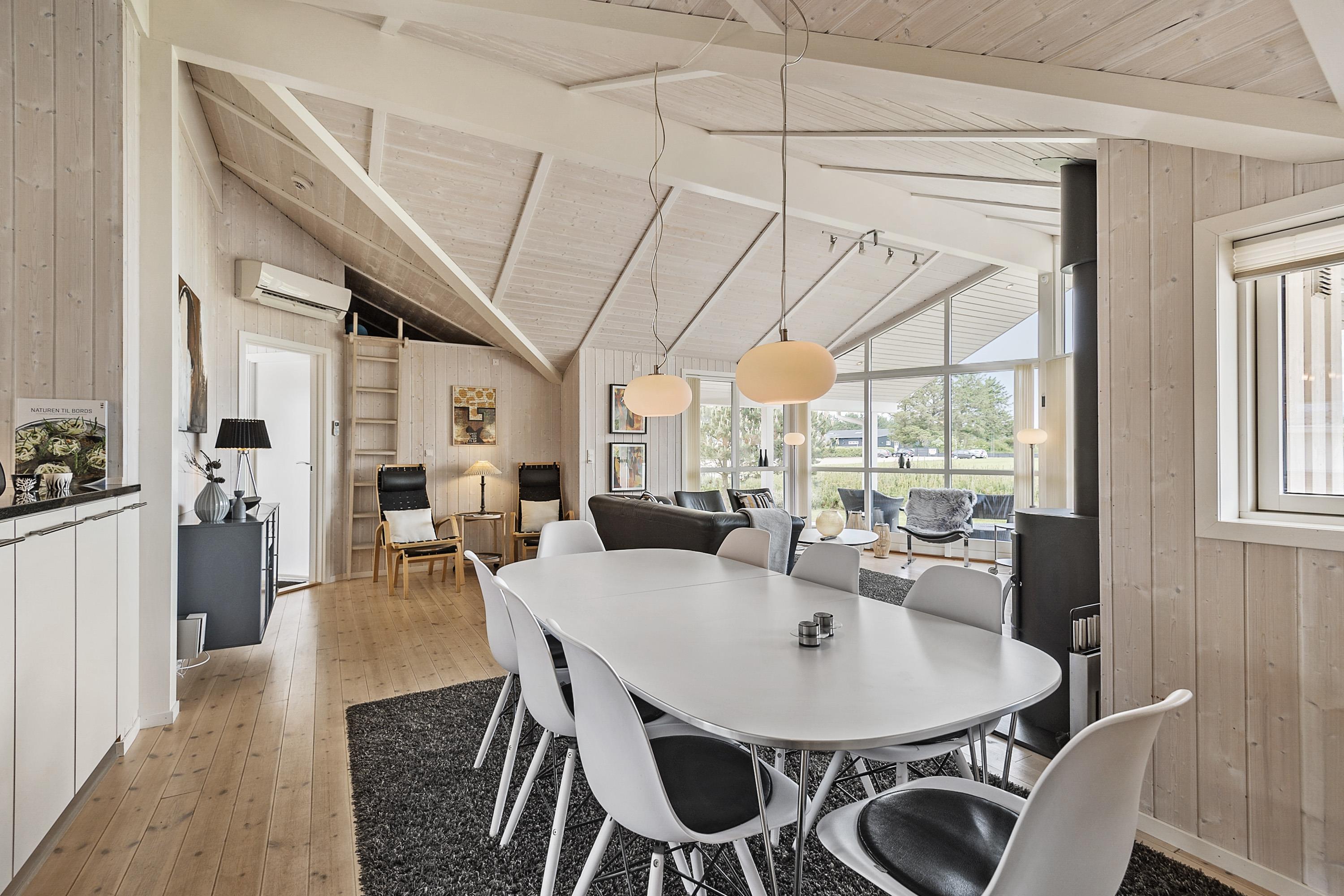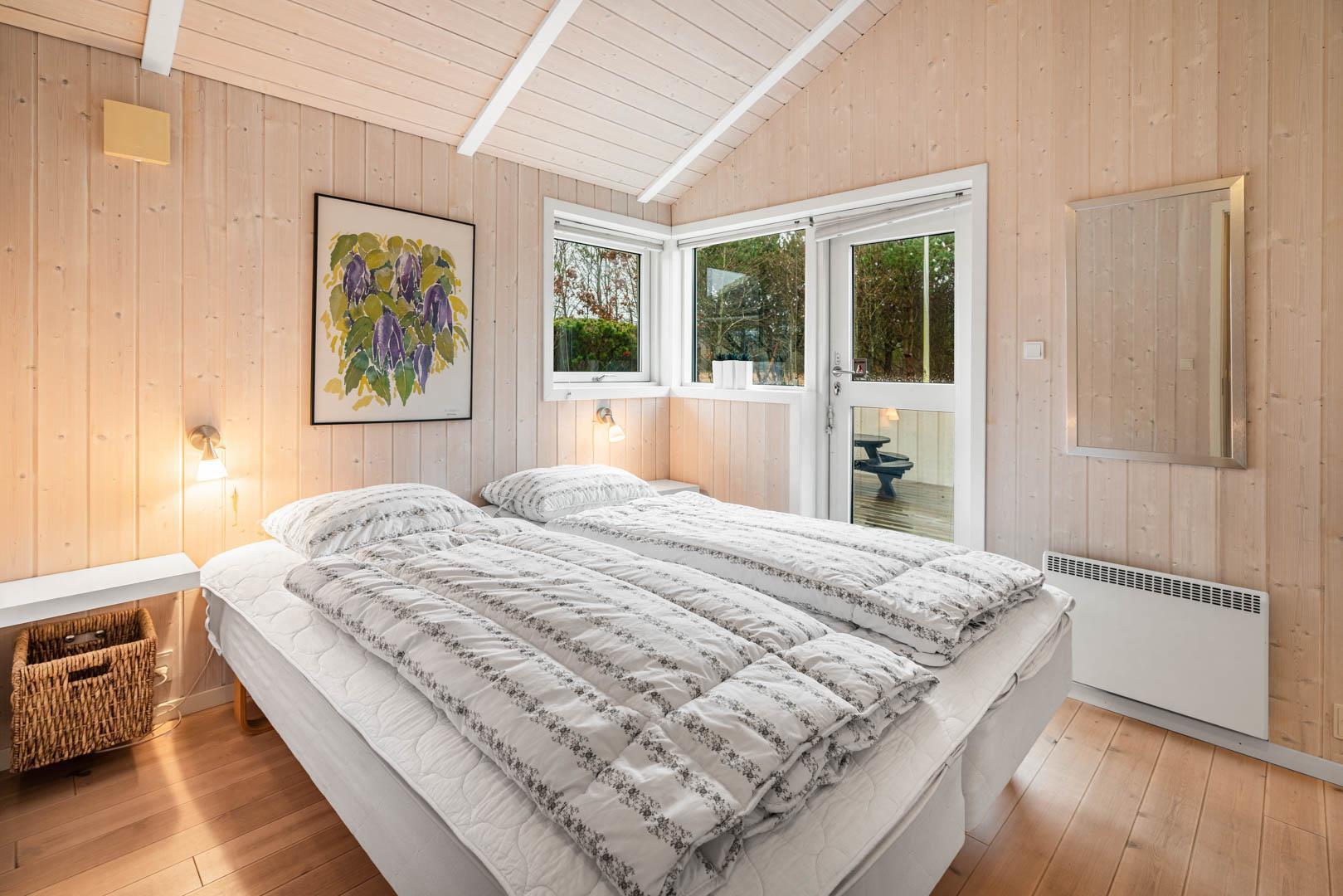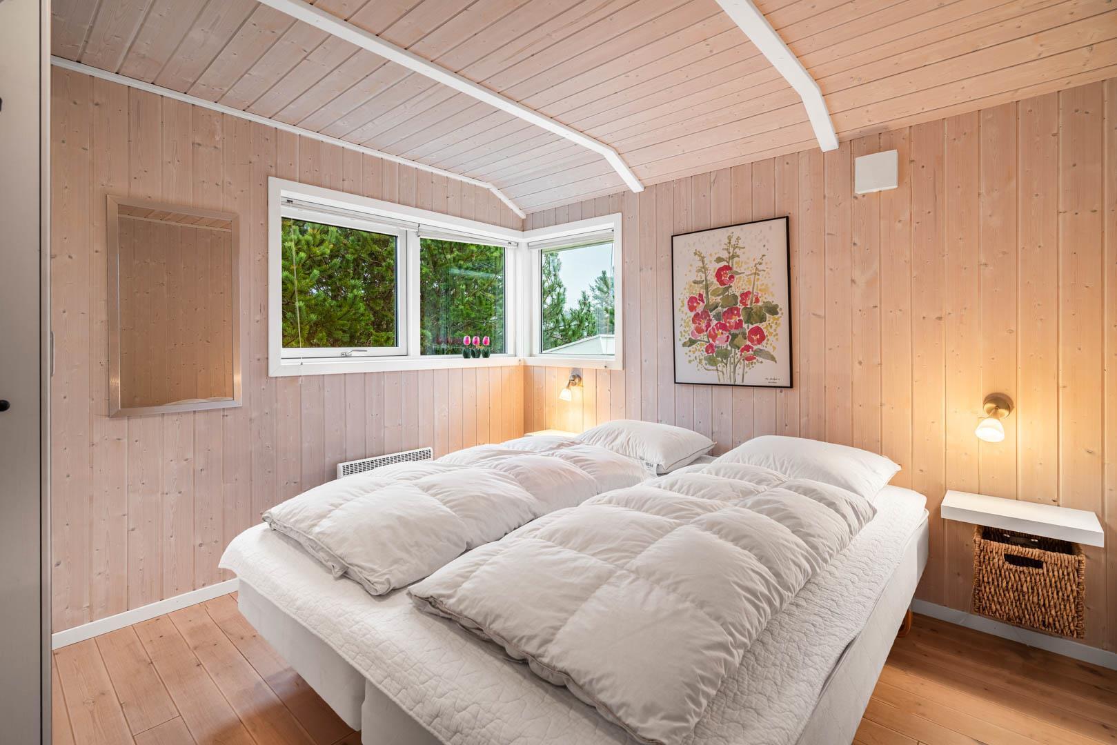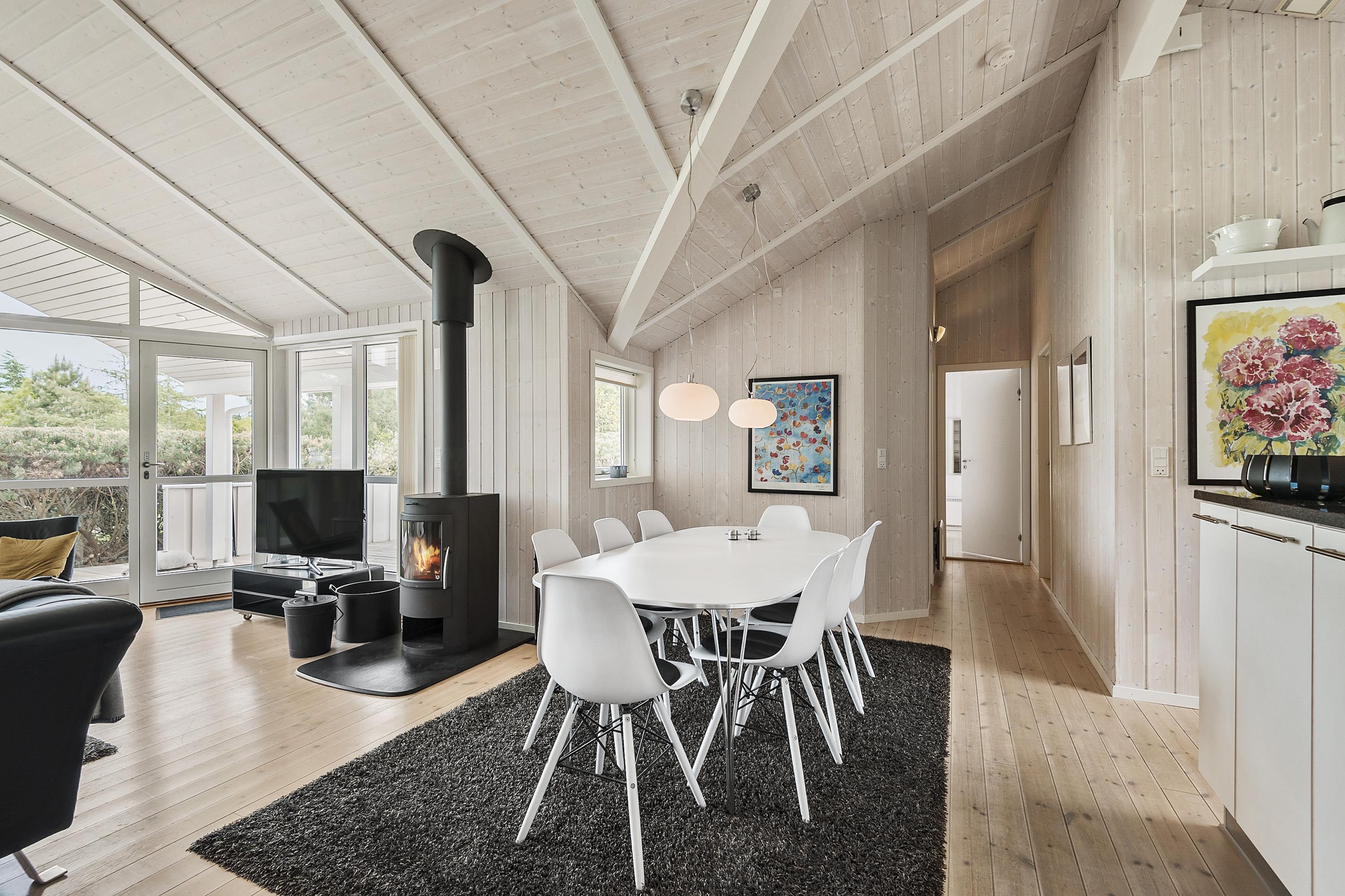 Den hyggelige og hjemlige indretning sætter rammerne for ferien, og med lyse farver på vægge og højt til loftet føles huset ekstra rummeligt. Der er 2 gode badeværelser - begge med gulvvarme. Det største har spabad og sauna. I stuen er der bl.a. brændeovn, som kan give den helt rigtige feriestemning. Der er 4 soveværelser, - 2 mindre soverum med hver 1 skab og 2 større rum med rigtig god opbevaringsplads.
