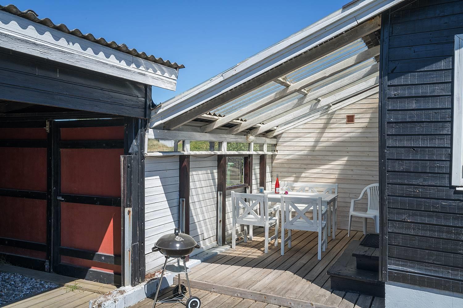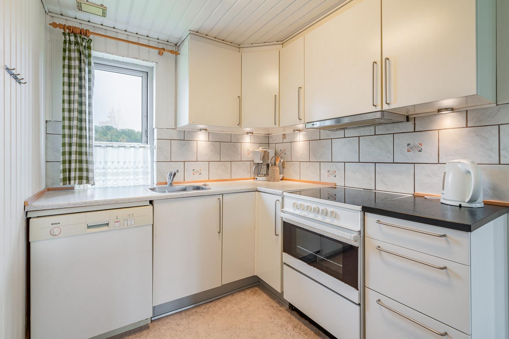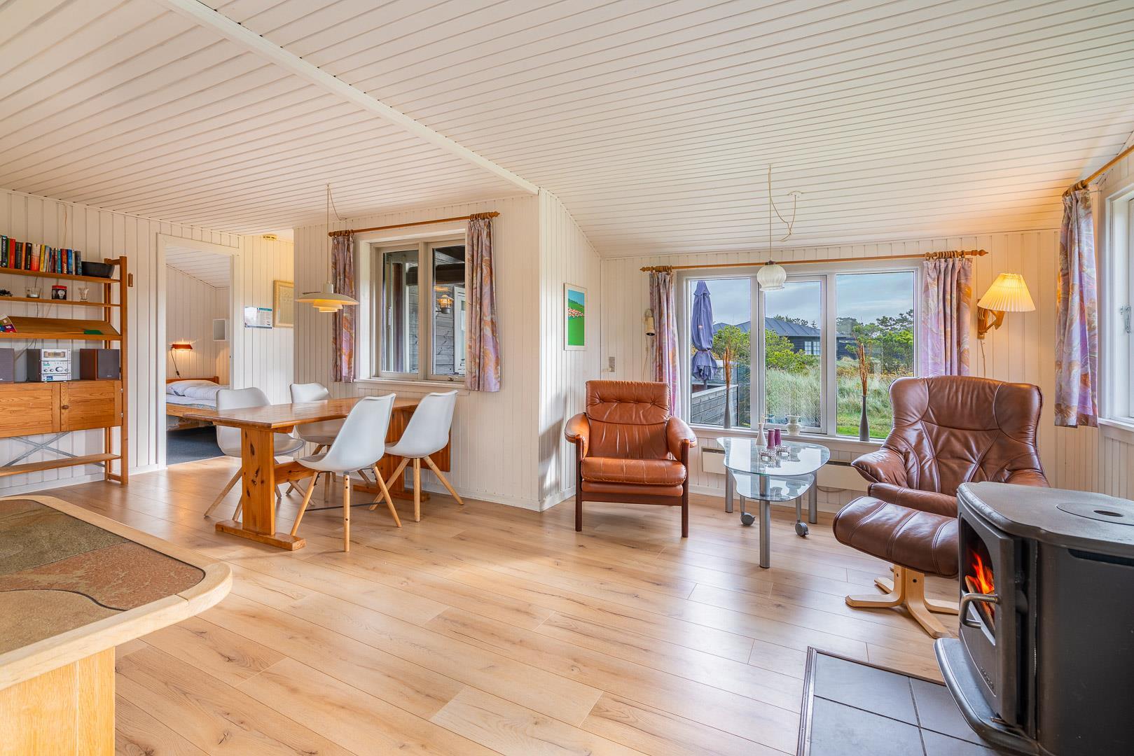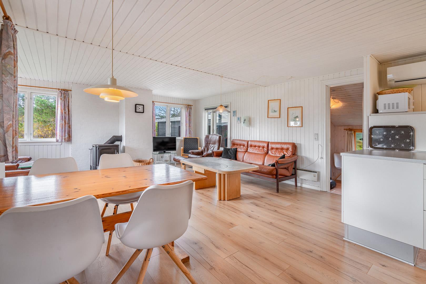 Velbeliggende feriehus på hjørnegrund tæt på vand og by. Ældre, men velholdt feriehus med blandet møblering. Stuen er lys med brændeovn og fladskærms TV i åben kombination til spisepladsen og køkkenet med mikroovn og opvaskemaskine. I huset forefindes 1 soverum med dobbeltseng og skabe samt 1 værelse med enkelt senge og 1 skab. Desuden værelse med sovesofa. Ud over badeværelse med brusekabine, findes mindre ekstra toilet, håndvask og håndbruser. Via køkken adgang til sauna og vaskemaskine. Miljøvenlig og strømbesparende varmepumpe til de kolde aftener. Udendørs er der carport til bilen. Dejlig overdækket terrasse, hvor man kan sidde de fleste dage samt mindre terrasse mod syd med lille overdækning. Huset er ikke for de gang besværede - der er mange trin i huset. Fra huset er der sti til stranden.