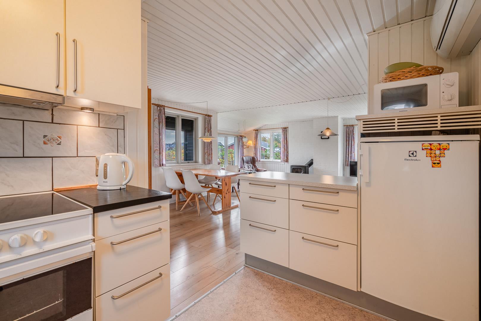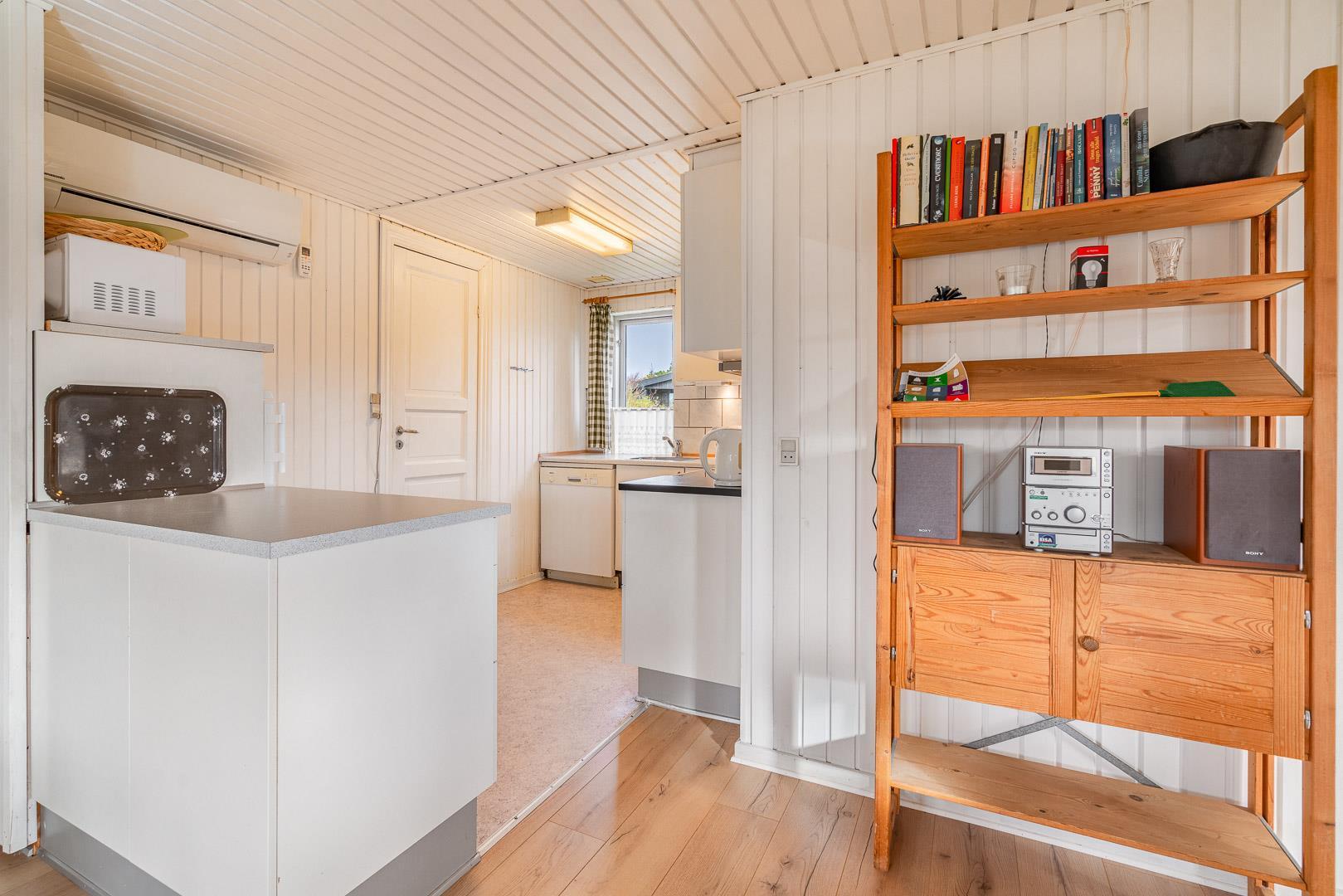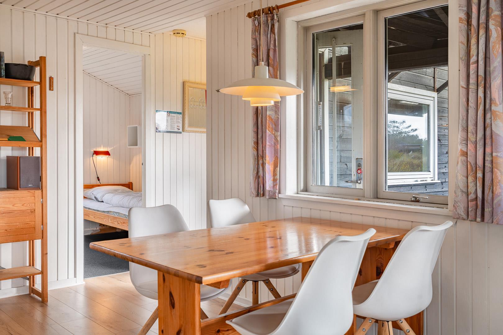 Velbeliggende feriehus på hjørnegrund tæt på vand og by. Ældre, men velholdt feriehus med blandet møblering. Stuen er lys med brændeovn og fladskærms TV i åben kombination til spisepladsen og køkkenet med mikroovn og opvaskemaskine. I huset forefindes 1 soverum med dobbeltseng og skabe samt 1 værelse med enkelt senge og 1 skab. Desuden værelse med sovesofa. Ud over badeværelse med brusekabine, findes mindre ekstra toilet, håndvask og håndbruser. Via køkken adgang til sauna og vaskemaskine. Miljøvenlig og strømbesparende varmepumpe til de kolde aftener. Udendørs er der carport til bilen. Dejlig overdækket terrasse, hvor man kan sidde de fleste dage samt mindre terrasse mod syd med lille overdækning. Huset er ikke for de gang besværede - der er mange trin i huset. Fra huset er der sti til stranden.