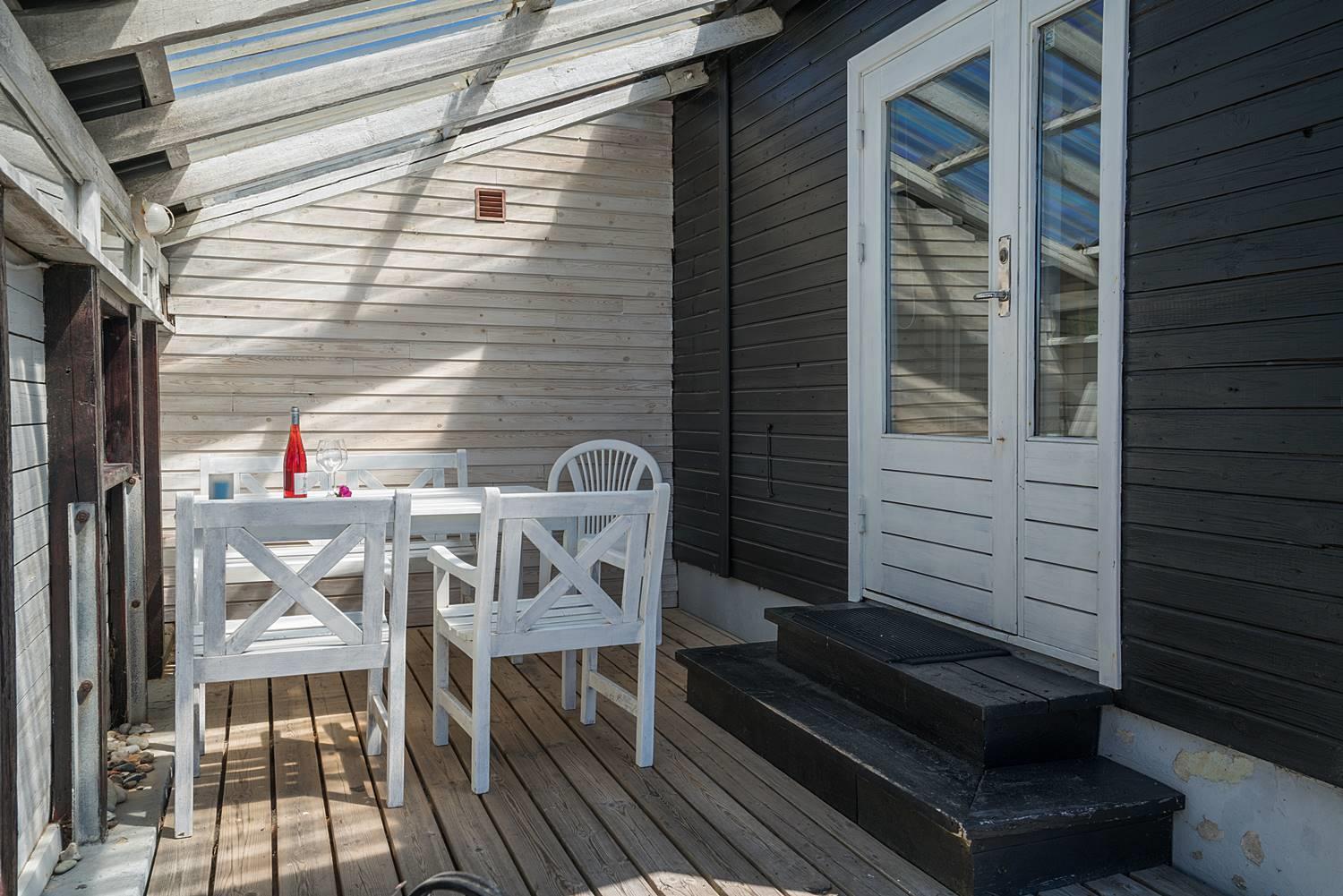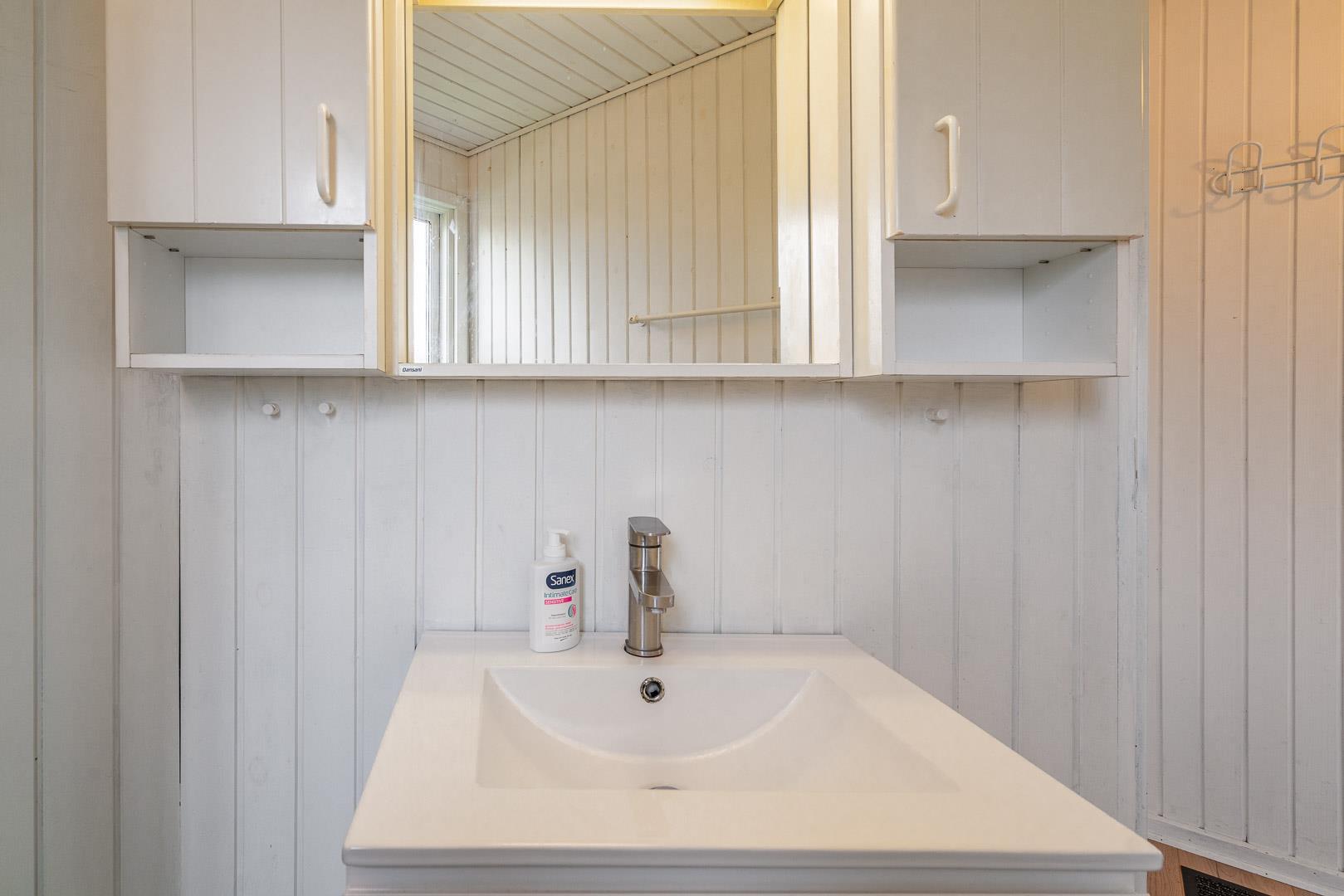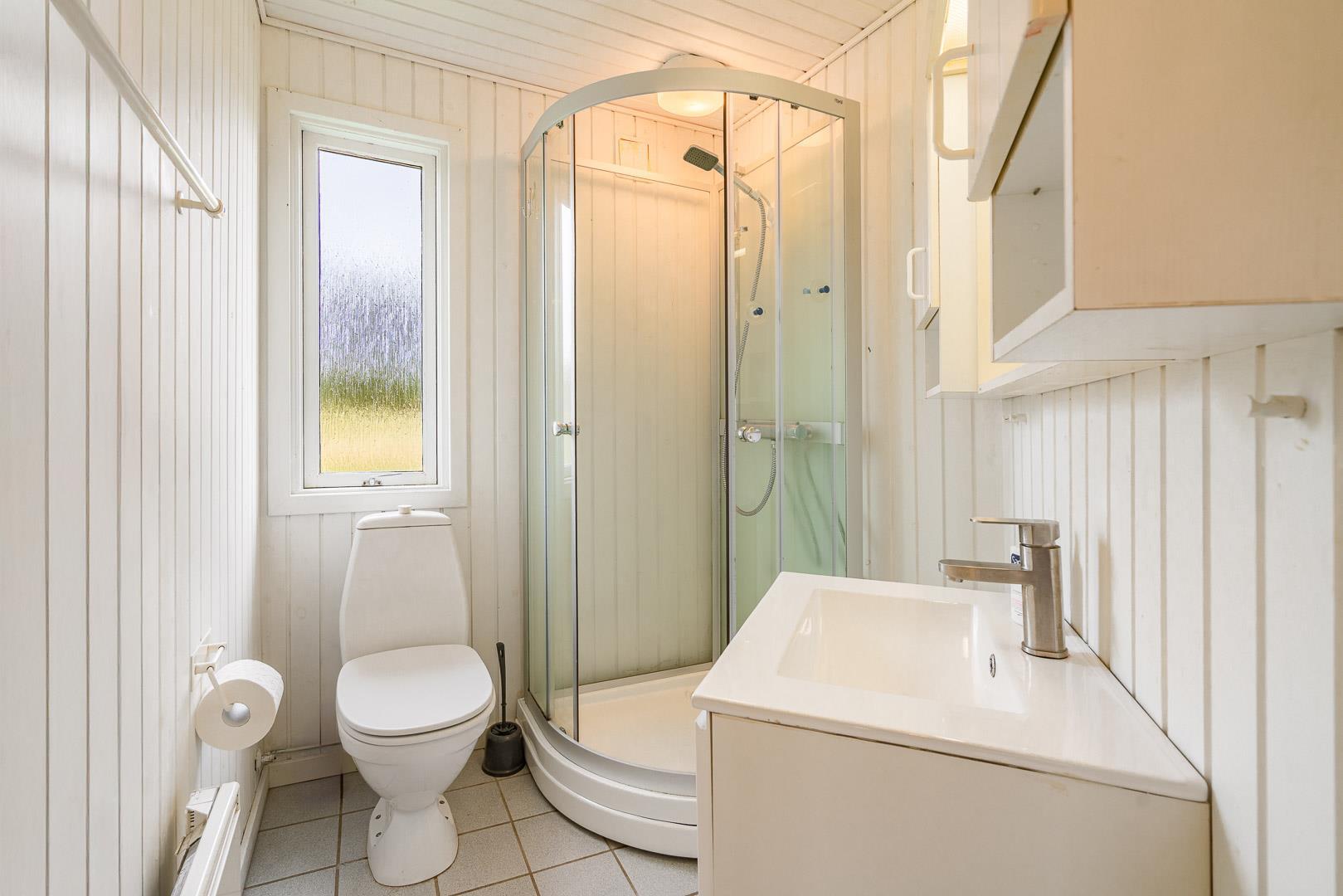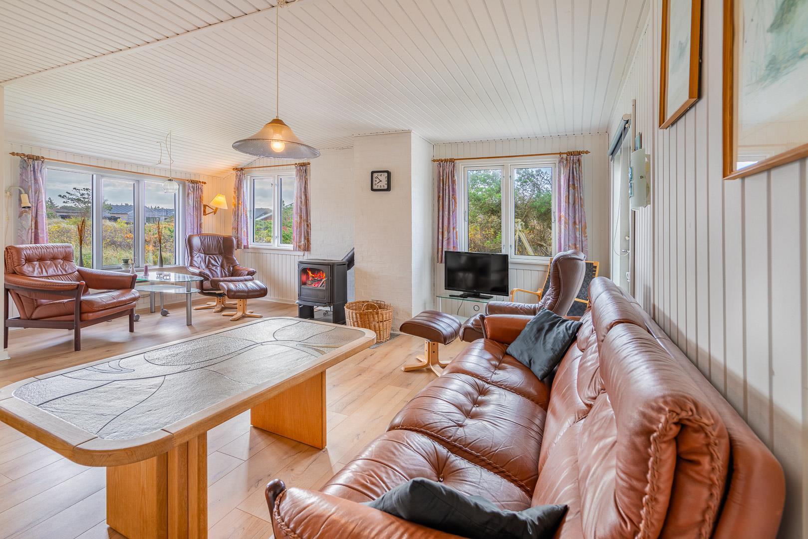 Velbeliggende feriehus på hjørnegrund tæt på vand og by. Ældre, men velholdt feriehus med blandet møblering. Stuen er lys med brændeovn og fladskærms TV i åben kombination til spisepladsen og køkkenet med mikroovn og opvaskemaskine. I huset forefindes 1 soverum med dobbeltseng og skabe samt 1 værelse med enkelt senge og 1 skab. Desuden værelse med sovesofa. Ud over badeværelse med brusekabine, findes mindre ekstra toilet, håndvask og håndbruser. Via køkken adgang til sauna og vaskemaskine. Miljøvenlig og strømbesparende varmepumpe til de kolde aftener. Udendørs er der carport til bilen. Dejlig overdækket terrasse, hvor man kan sidde de fleste dage samt mindre terrasse mod syd med lille overdækning. Huset er ikke for de gang besværede - der er mange trin i huset. Fra huset er der sti til stranden.