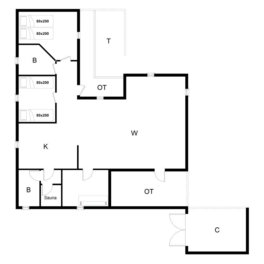Sengestørrelse: 1 dobbeltseng med 2 madrasser 80 x 200 cm + 2 enkeltsenge 80 x 200 cm + 1 sovesofa.