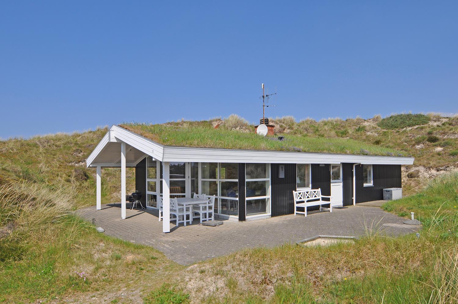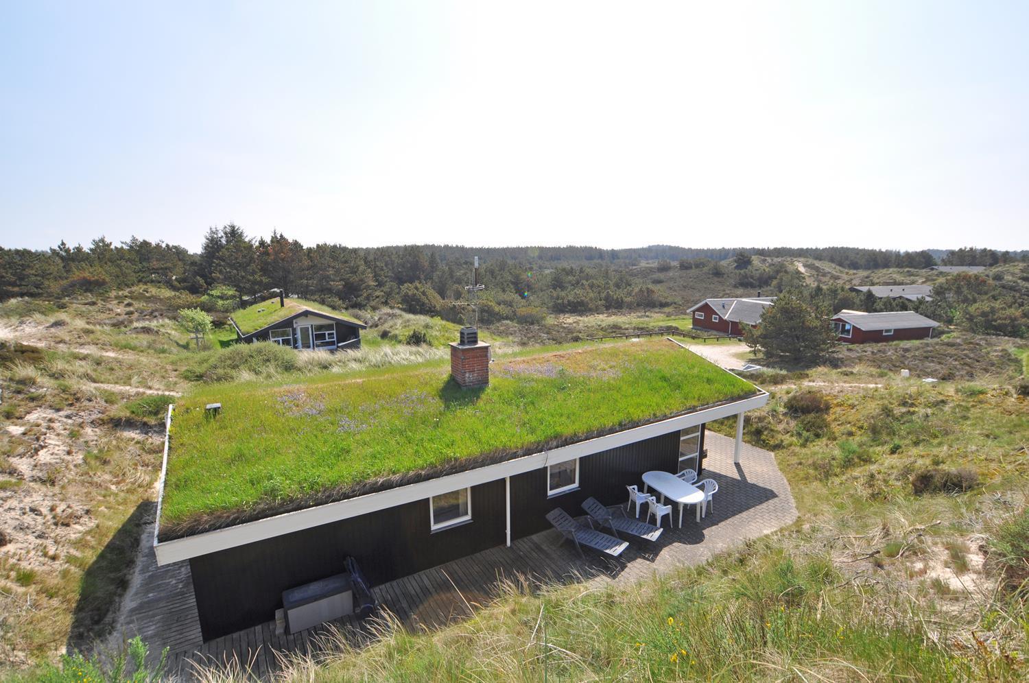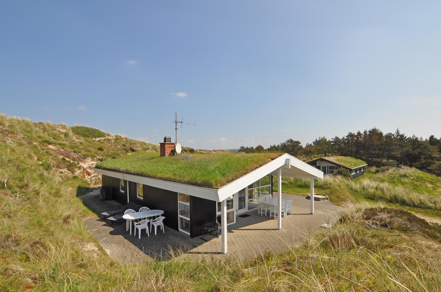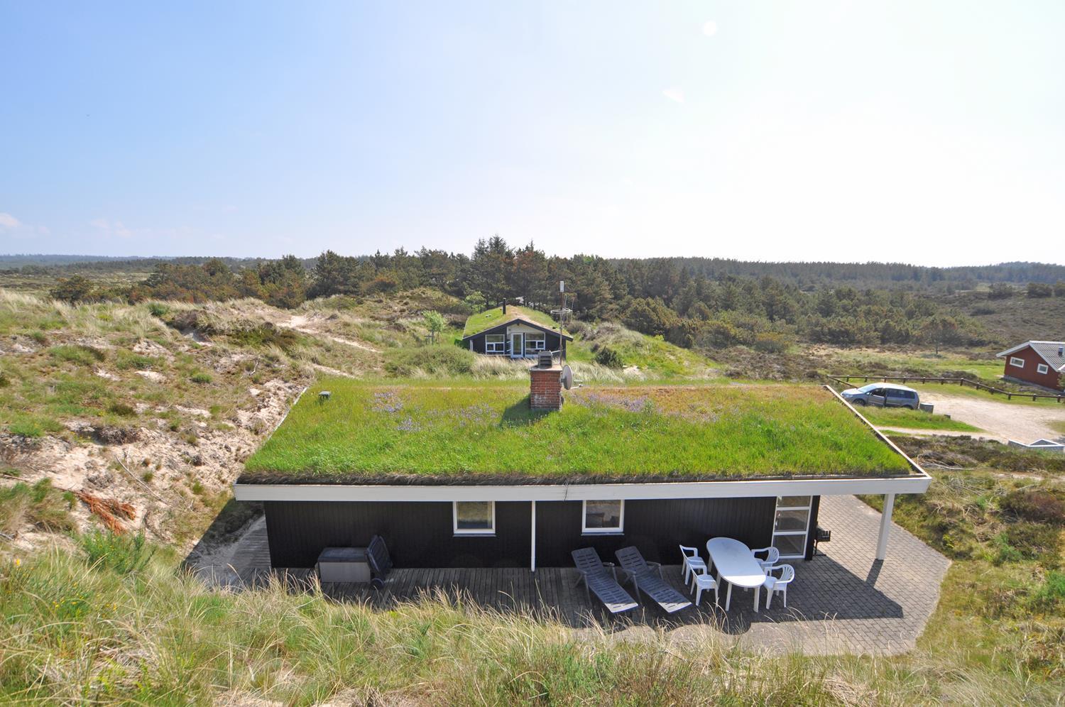 Feriehuset er lyst og indbydende og ligger smukt placeret i en stor klit, som skaber de perfekte rammer for en dejlig ferie – uanset årstid. Den energibesparende varmepumpe sikrer et behageligt indeklima året rundt.