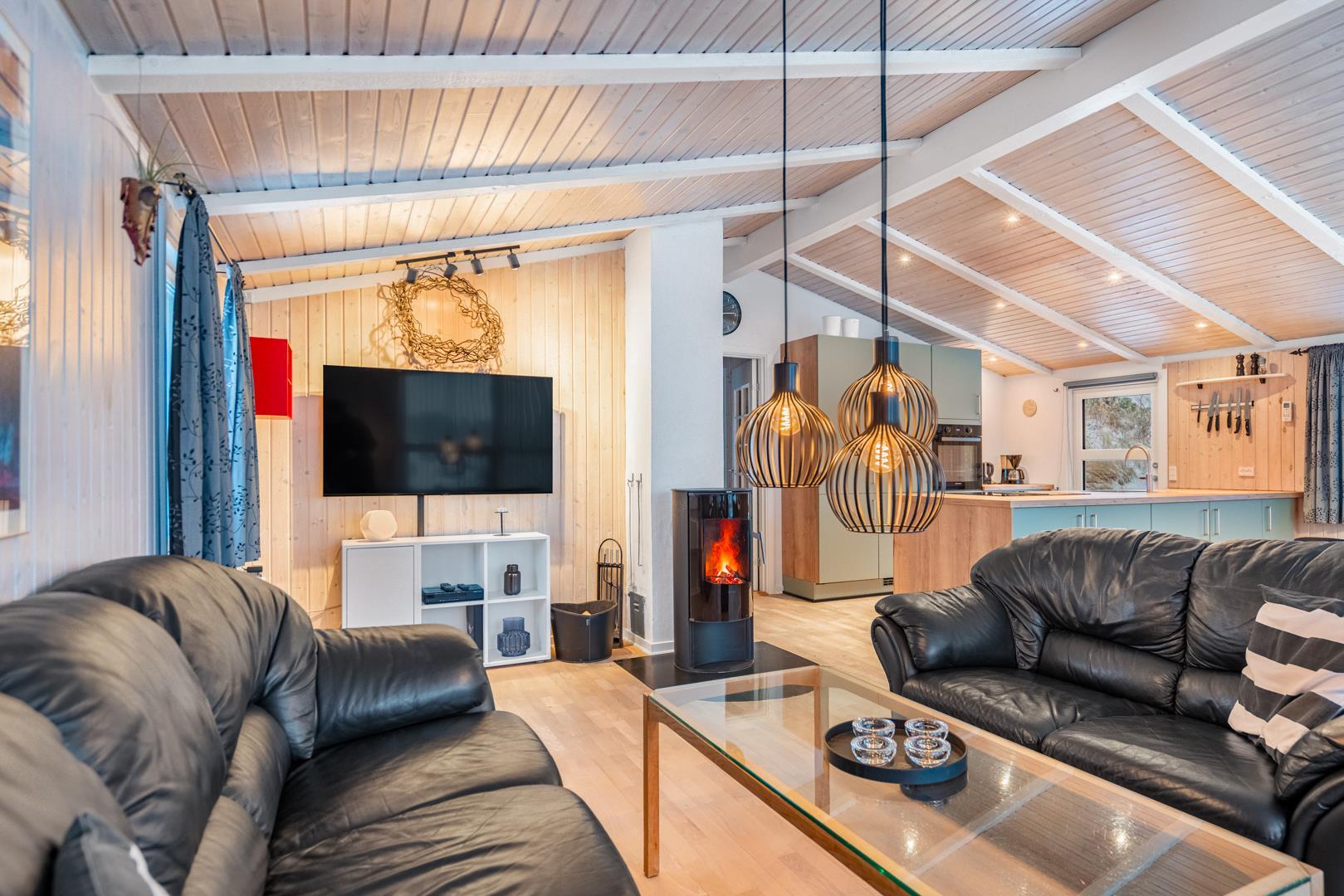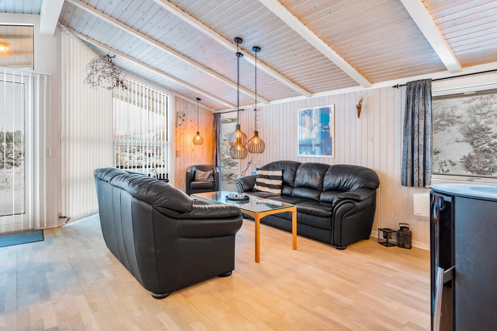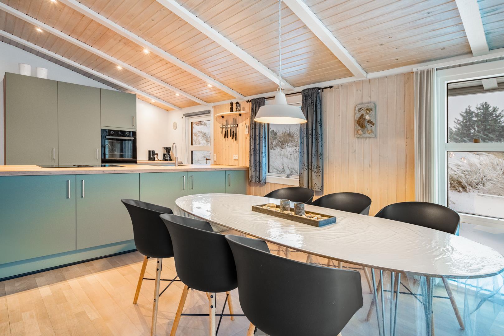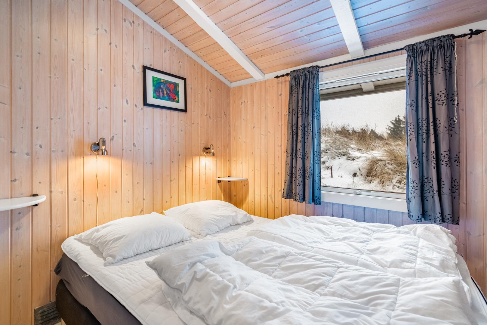 Feriehuset er lyst og indbydende og ligger smukt placeret i en stor klit, som skaber de perfekte rammer for en dejlig ferie – uanset årstid. Den energibesparende varmepumpe sikrer et behageligt indeklima året rundt.