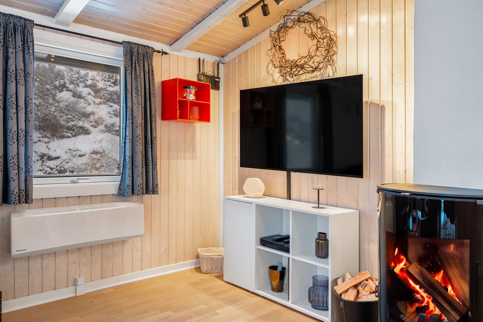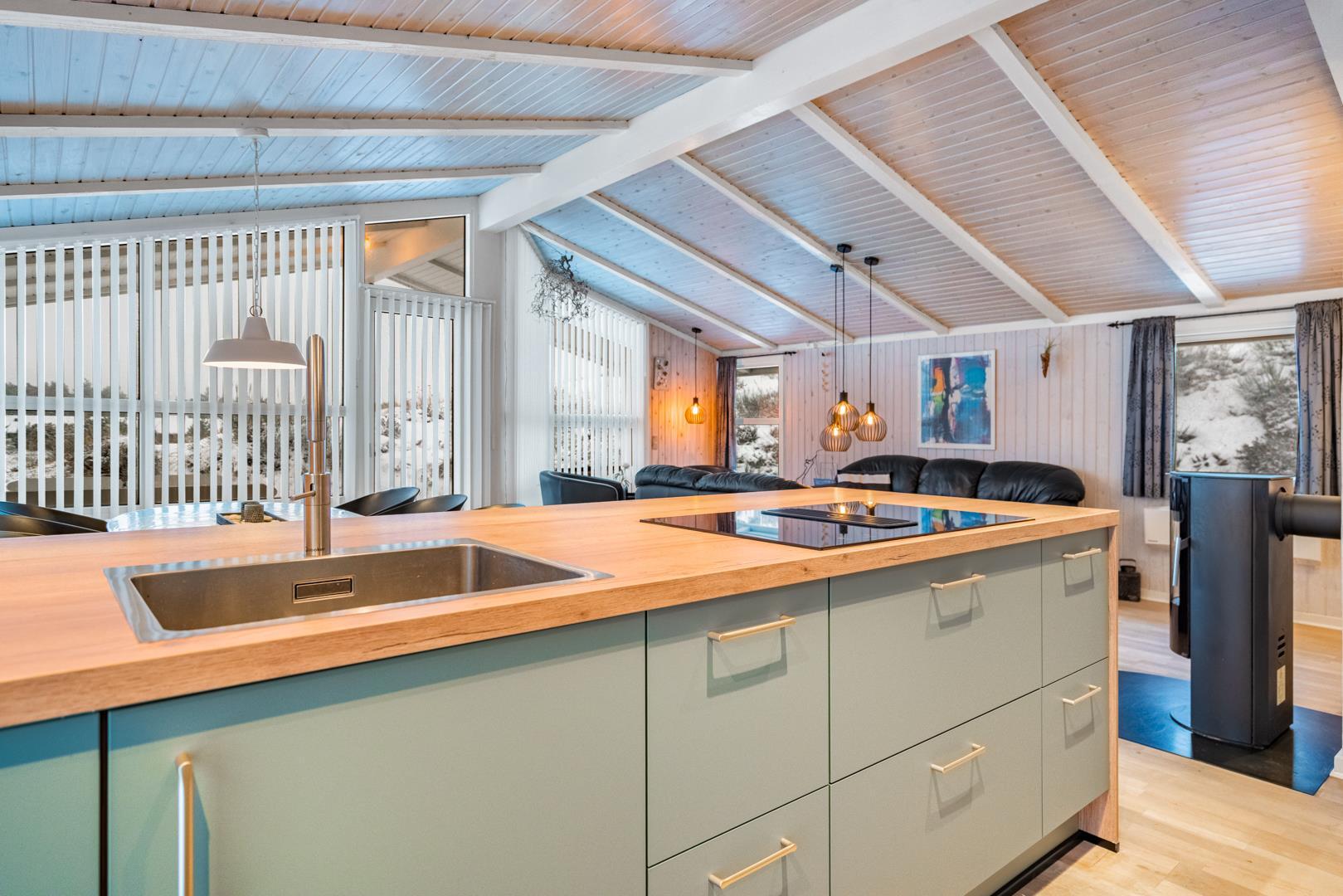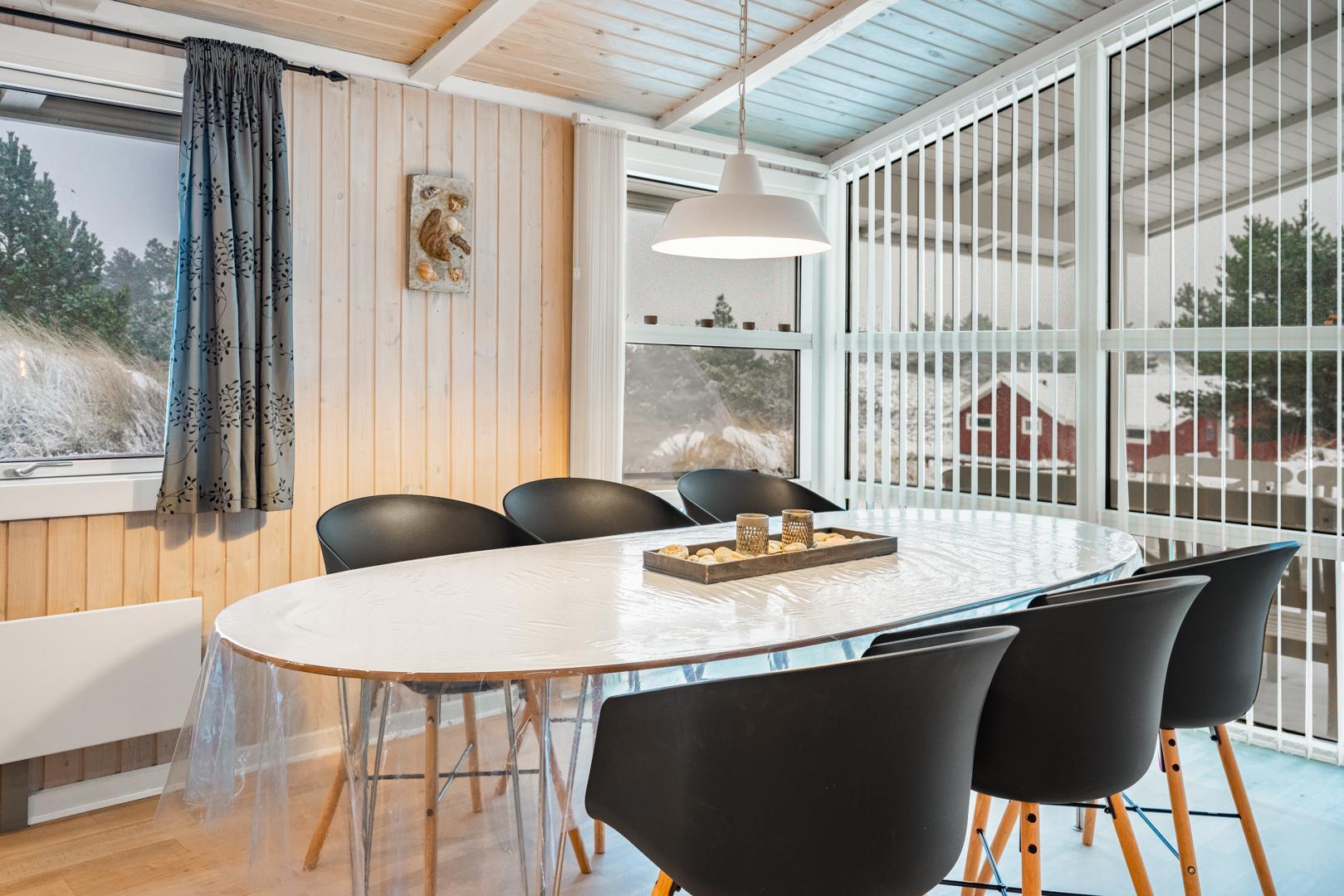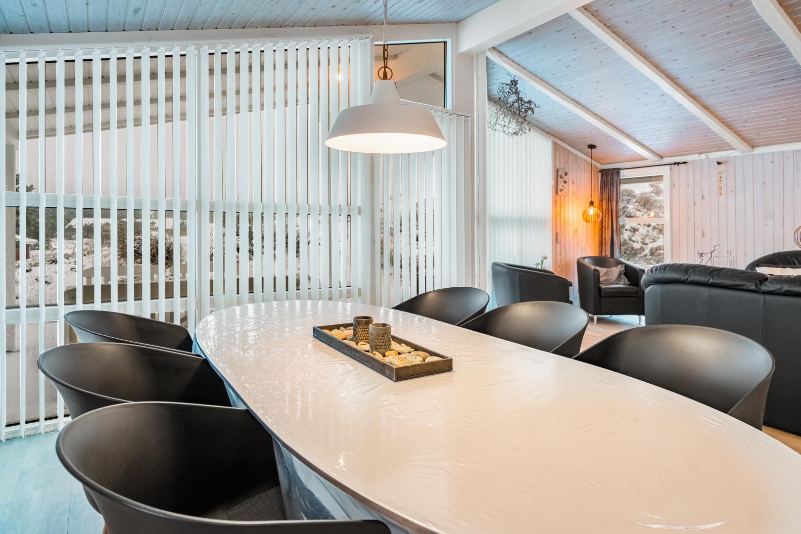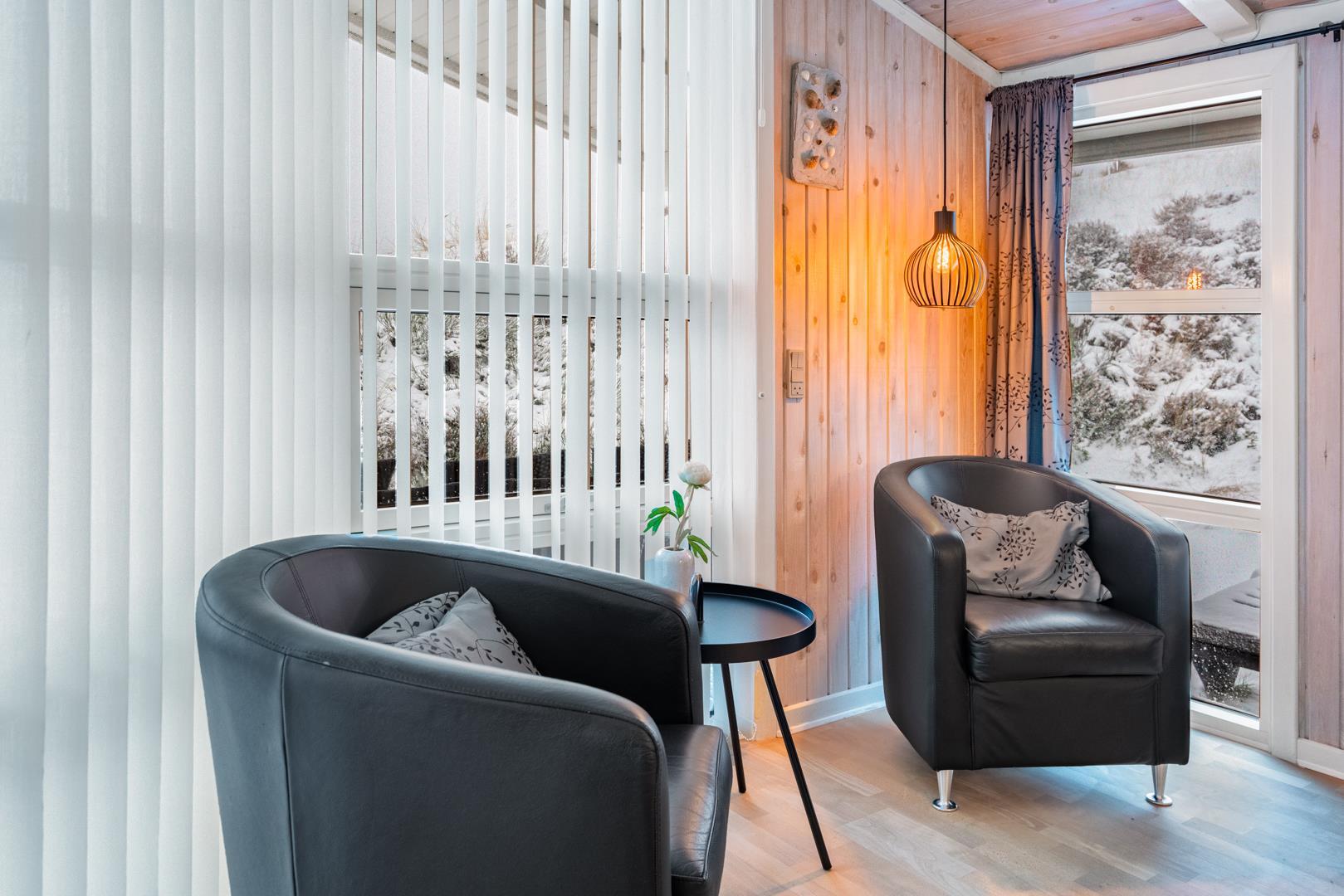 Feriehuset er lyst og indbydende og ligger smukt placeret i en stor klit, som skaber de perfekte rammer for en dejlig ferie – uanset årstid. Den energibesparende varmepumpe sikrer et behageligt indeklima året rundt.