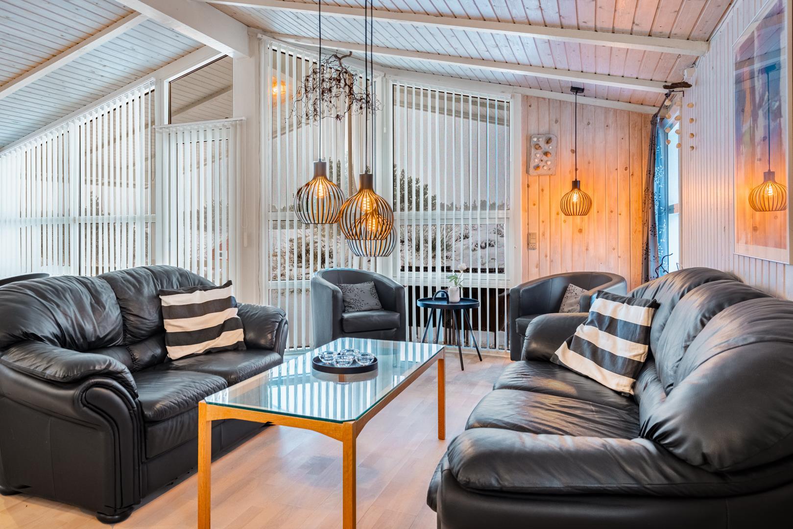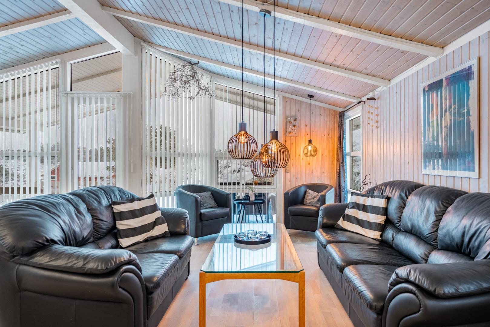 Huset byder på både åbne og overdækkede terrasser, hvor I kan nyde solen, udsigten og den friske luft i ugenerede omgivelser. Den hyggelige stue er indrettet med personligt og smagfuldt præg samt gode kvalitetsmøbler, og herfra er der direkte udgang til terrasserne – ideelt til afslapning og samvær.