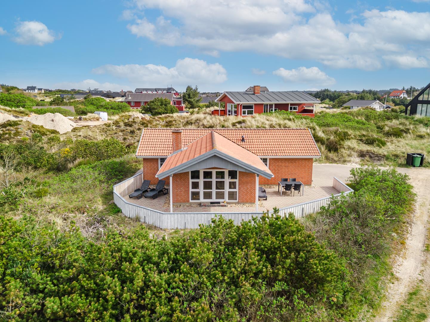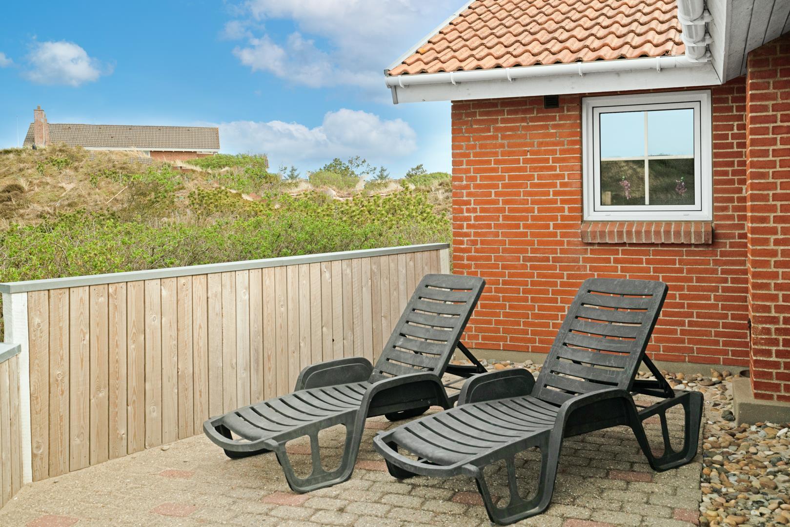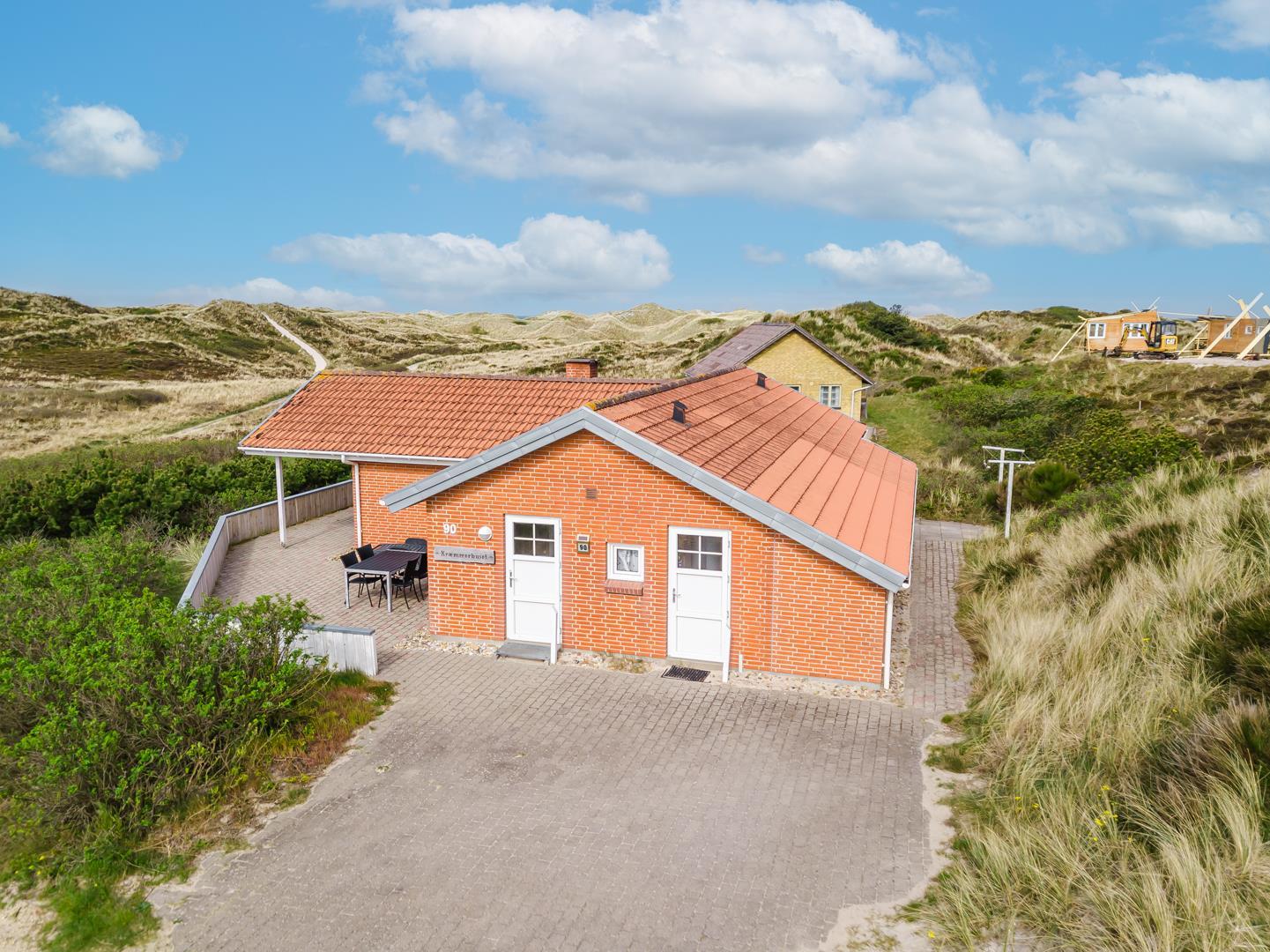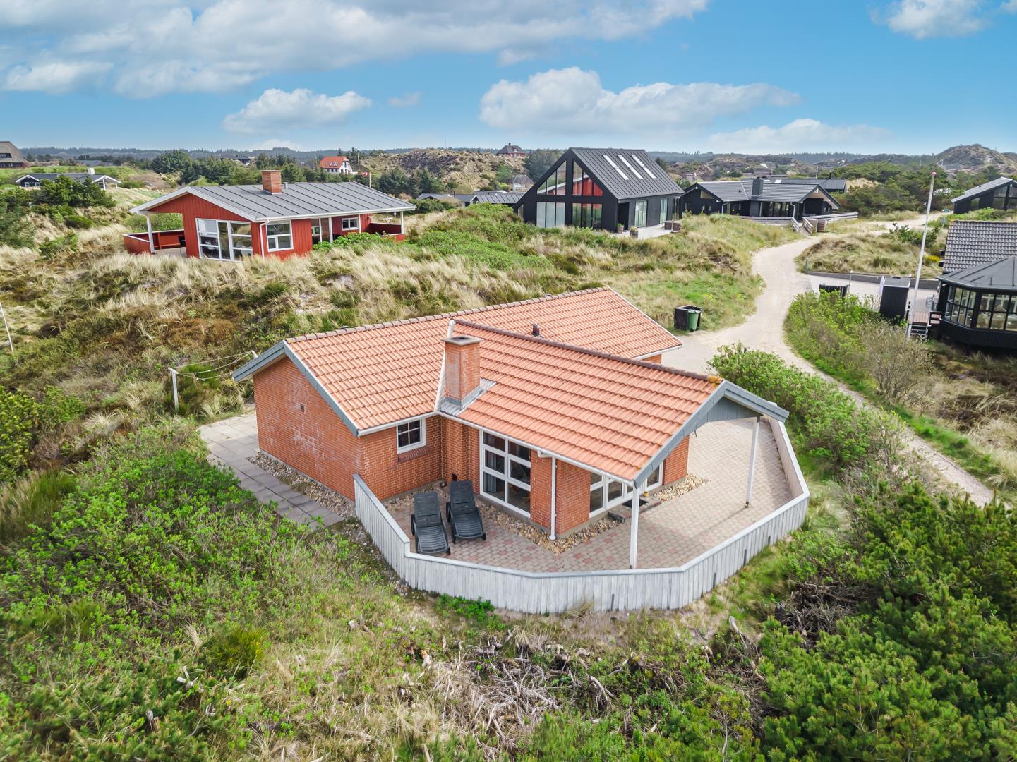 På en skøn, kuperet klitgrund for enden af blind vej helt fremme i klitterne, ligger dette dejlige feriehus. Hyggelig indrettet stue med udgang til skøn delvis overdækket terrasse, hvor den fantastiske udsigt ud over klitterne kan nydes. Fint badeværelse med spa og sauna samt ekstra toilet. 2 store soverum med dobbeltseng.