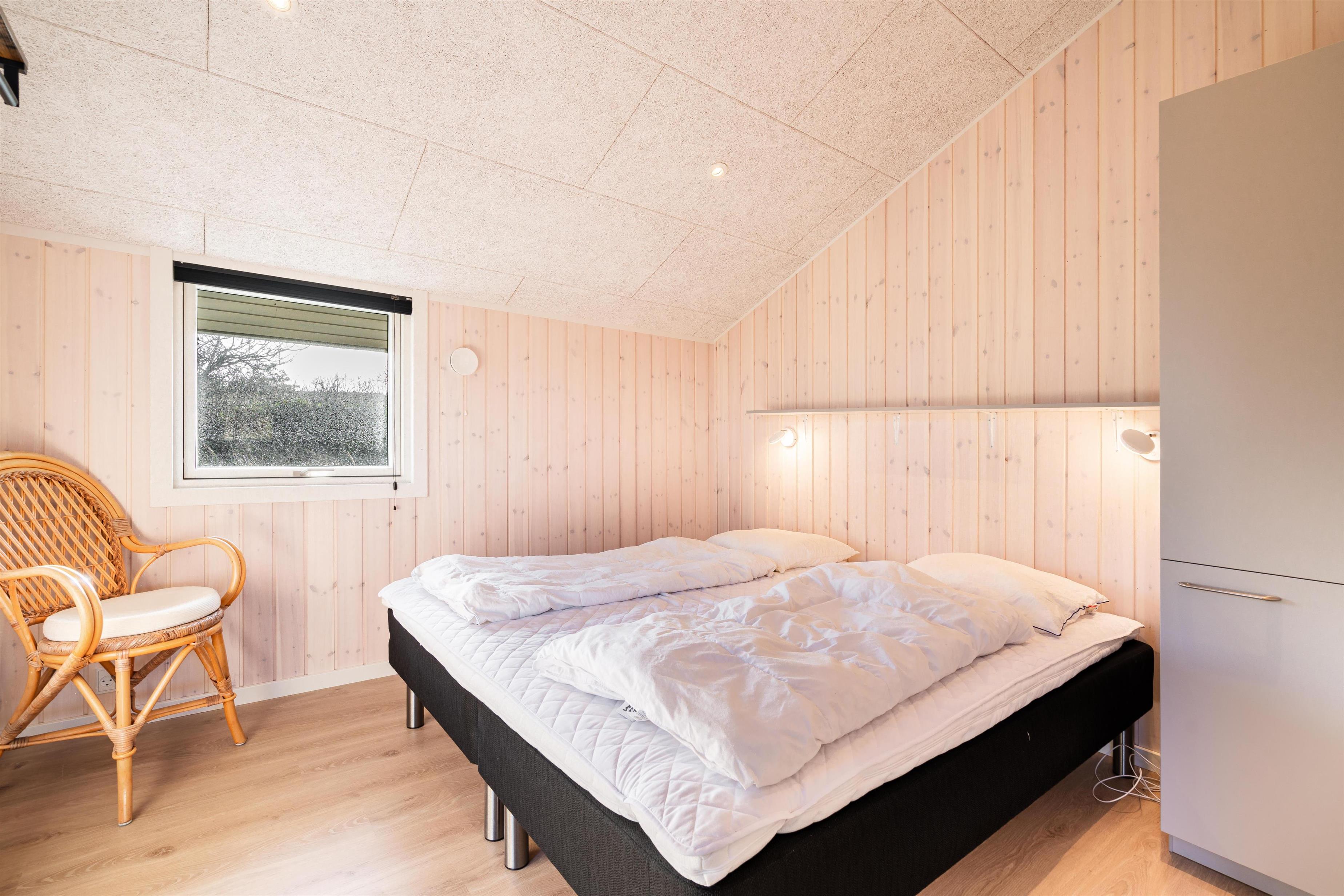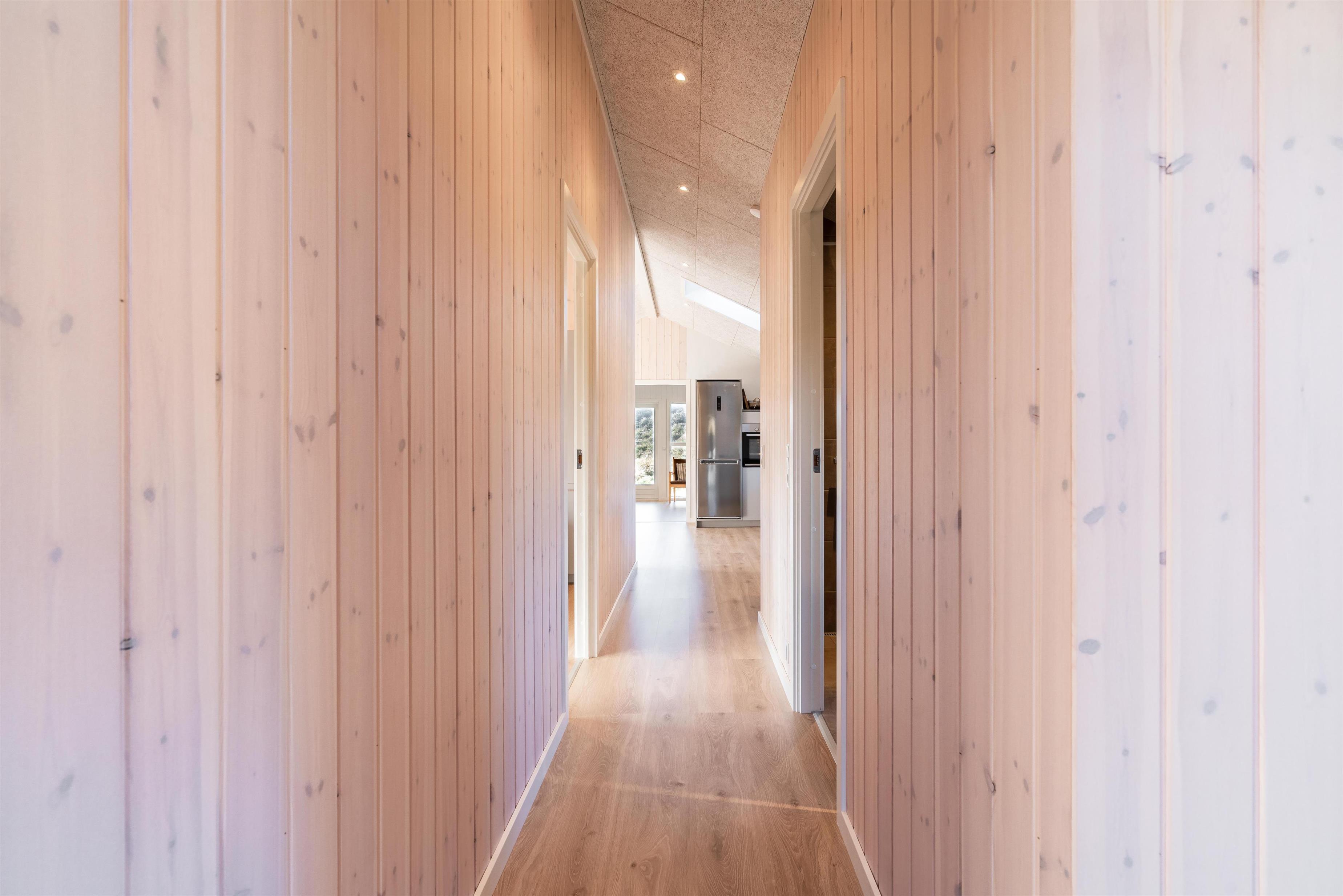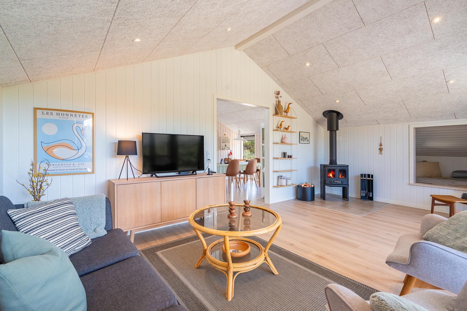 Når du træder ind i dette flotte ferie hus fremstår alt nyt og lækkert. Alt fra gulv til loft er nyt. Huset er lyst med køkken i åben forbindelse med den hyggelige stue, her kan ferien nydes foran brændeovnen med en god bog. Udover husets to soverum er der også en alkove i stuen. Et dejligt feriehus til den lille familie eller par.