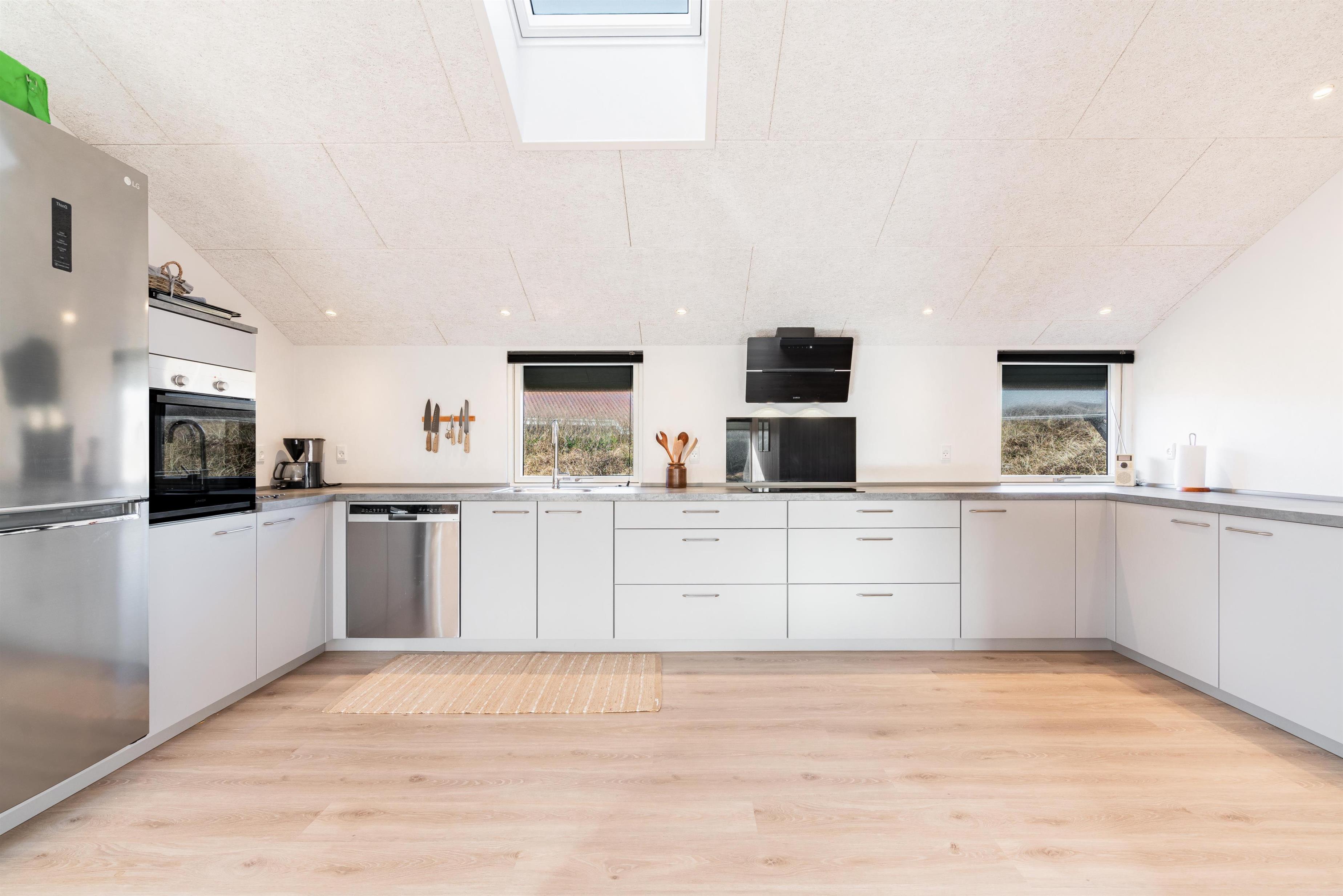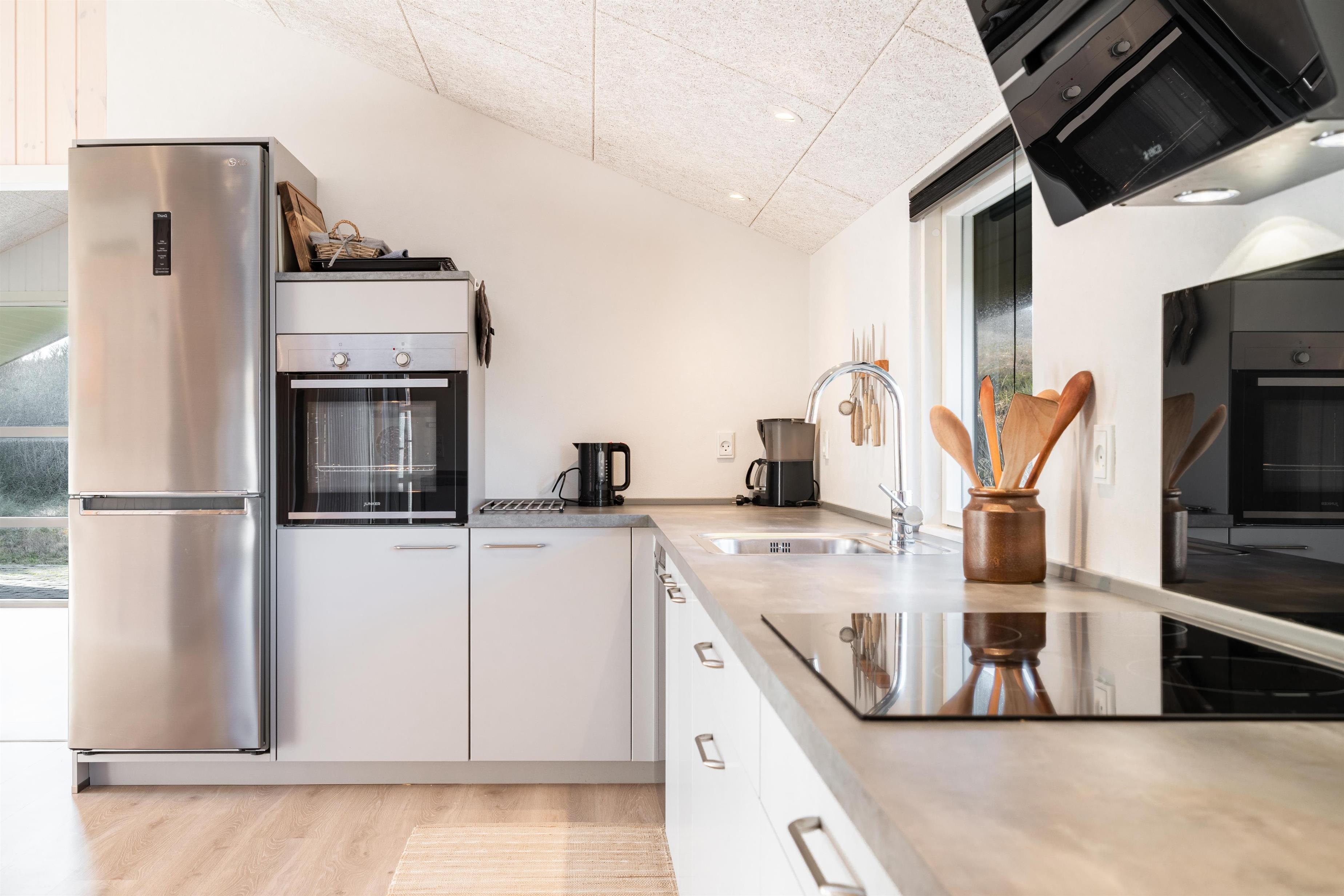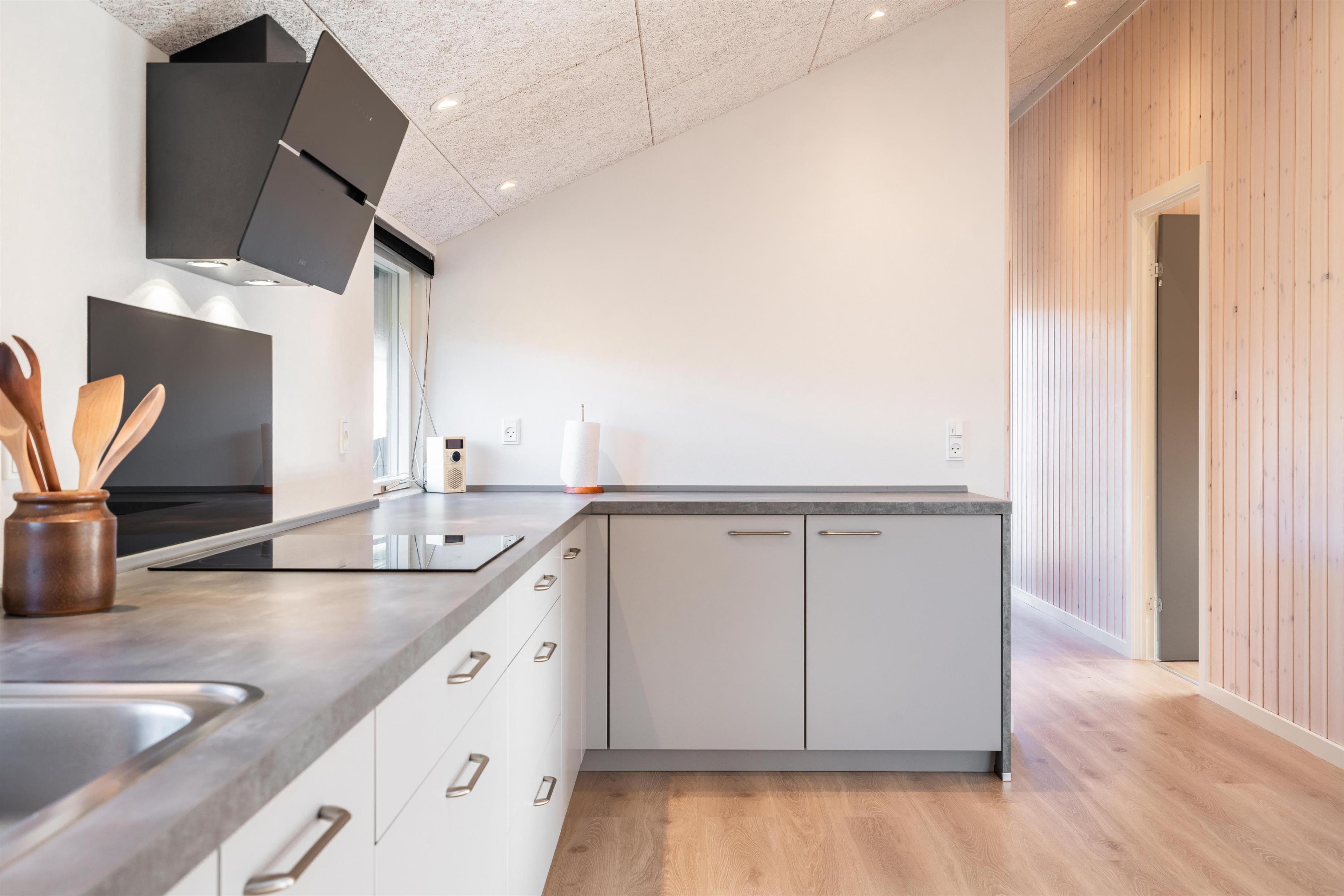 Når du træder ind i dette flotte ferie hus fremstår alt nyt og lækkert. Alt fra gulv til loft er nyt. Huset er lyst med køkken i åben forbindelse med den hyggelige stue, her kan ferien nydes foran brændeovnen med en god bog. Udover husets to soverum er der også en alkove i stuen. Et dejligt feriehus til den lille familie eller par.