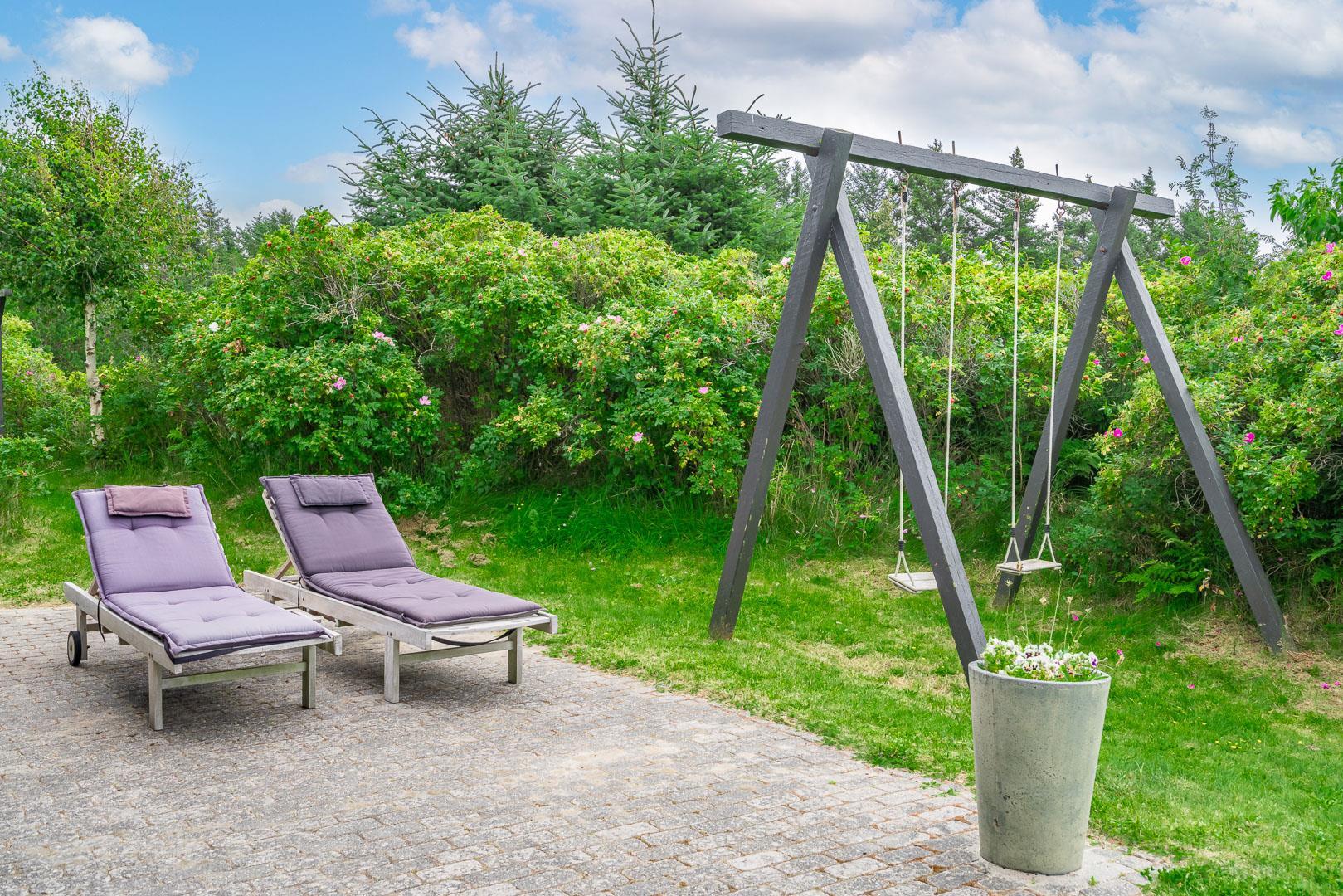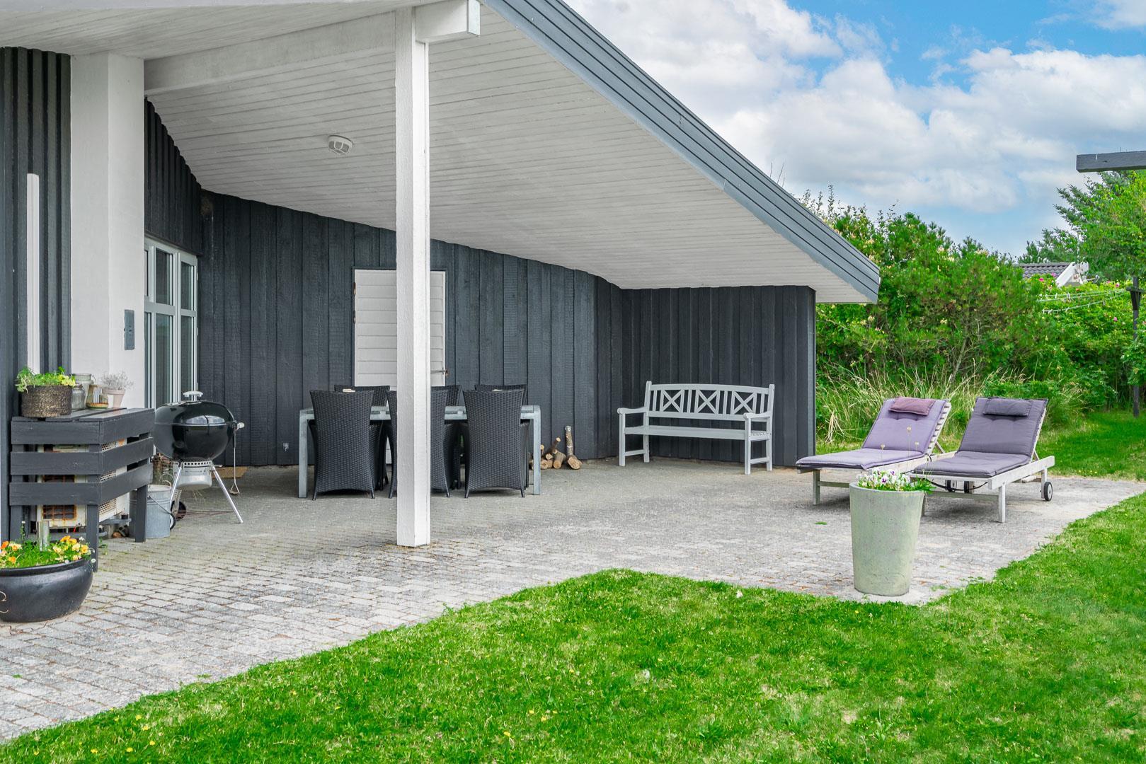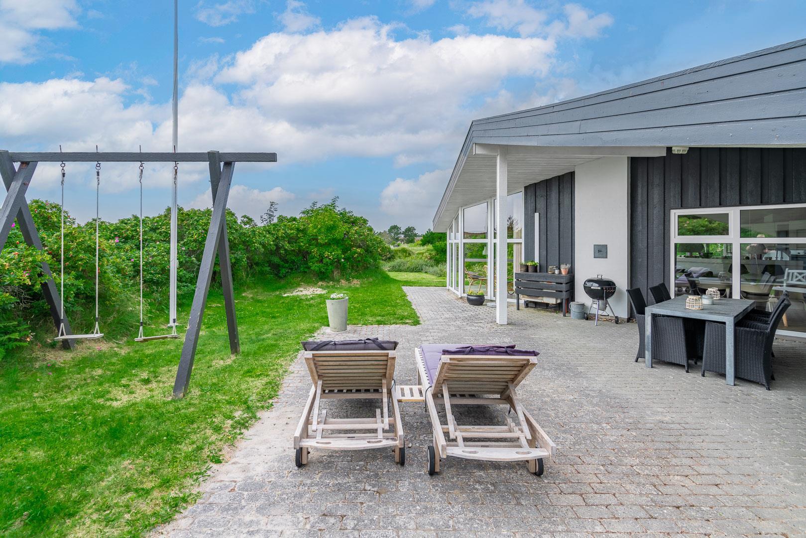 Fra opholdsrummet er der direkte udgang til de indbydende terrasser, der snor sig stort set hele vejen rundt om huset. Tænd op i grillen, slæng dig i solen og lad børnene boltre sig på græsplænen på den smukke grund, der byder på både gyngestativ og sandkasse.