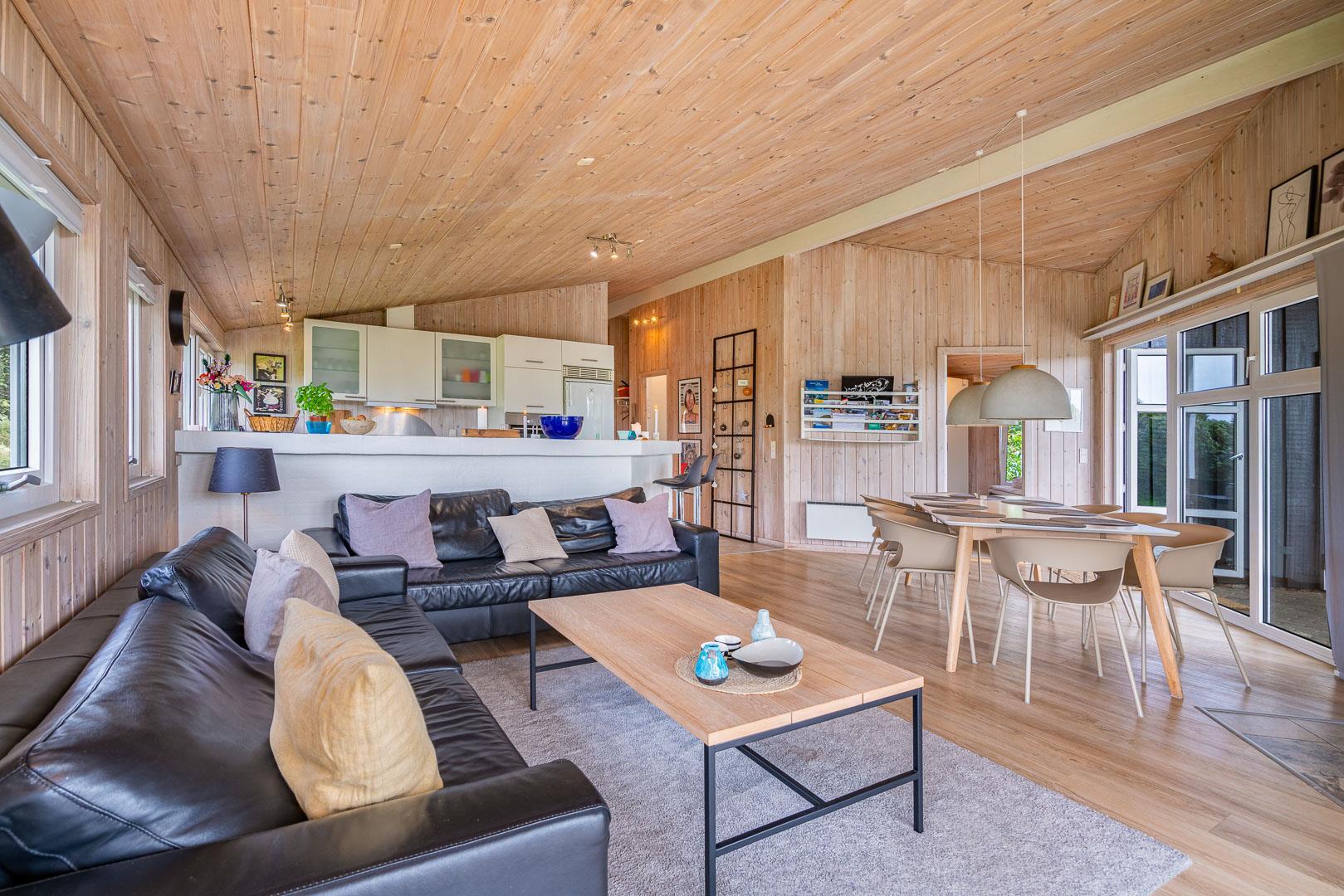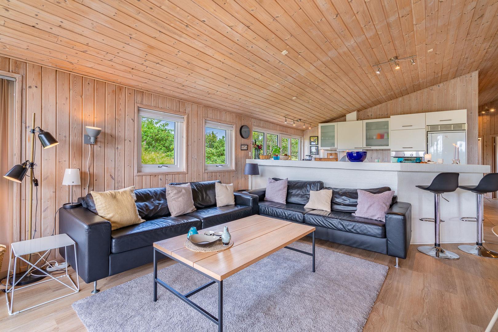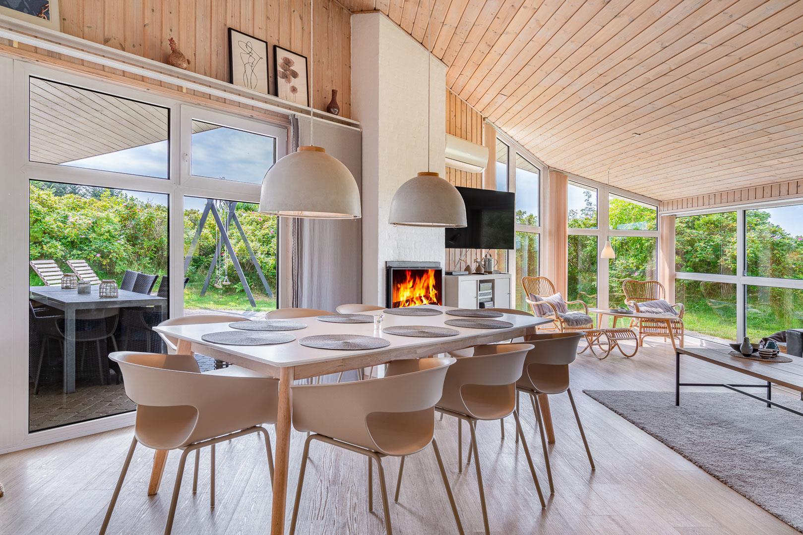 Sommerhuset er funktionelt indrettet med store glaspartier, der inviterer dagslyset indenfor. Møblerne og interiøret er tidssvarende, lofterne går til kip og den hyggeligt knitrende brændeovn er flot integreret.