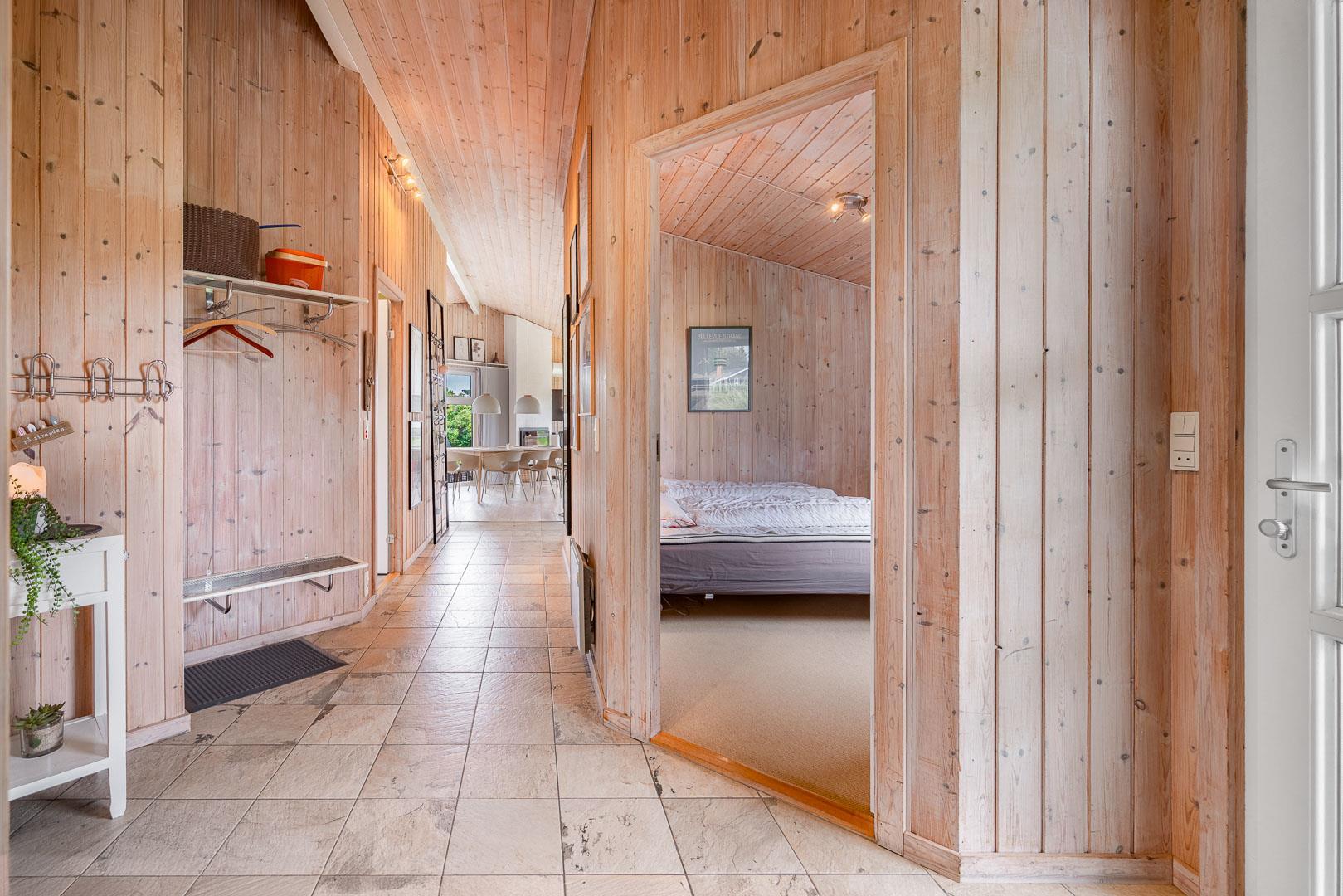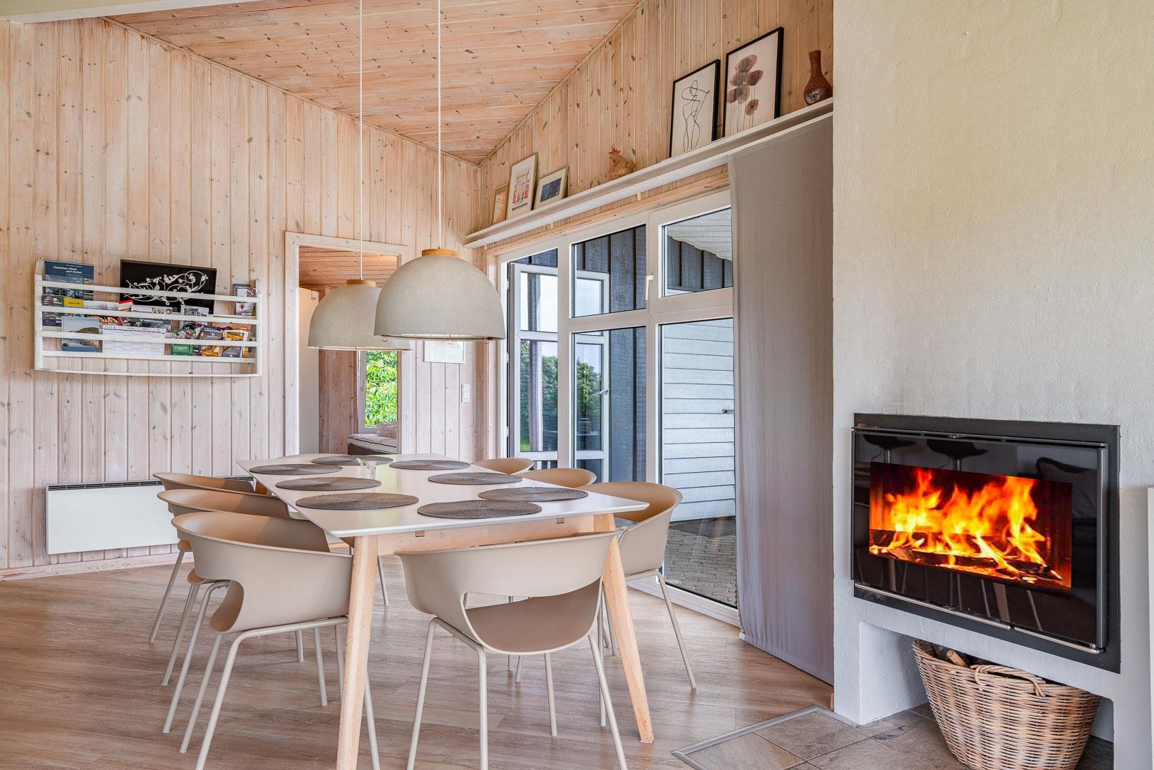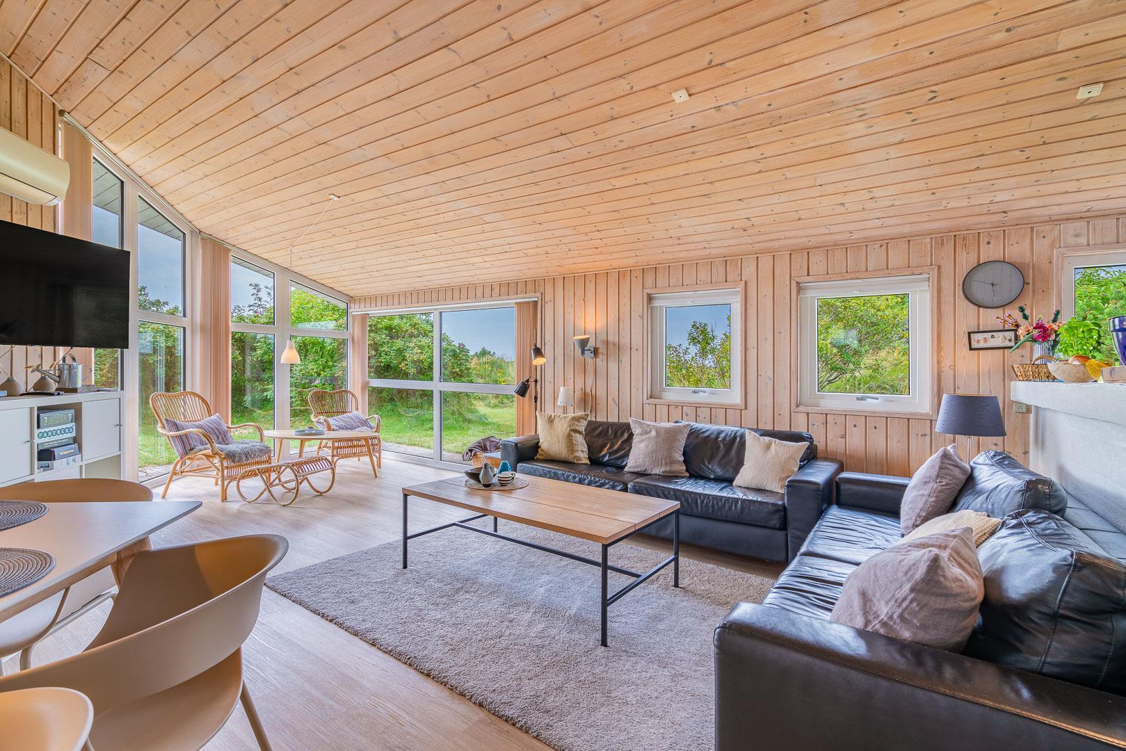 Sommerhuset er funktionelt indrettet med store glaspartier, der inviterer dagslyset indenfor. Møblerne og interiøret er tidssvarende, lofterne går til kip og den hyggeligt knitrende brændeovn er flot integreret.