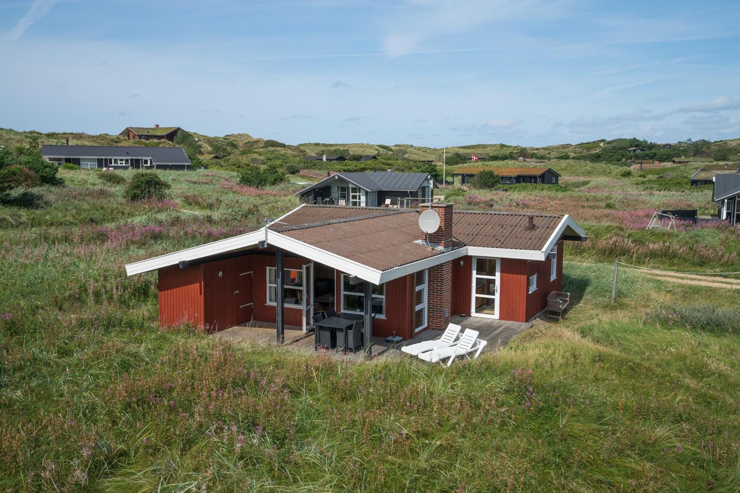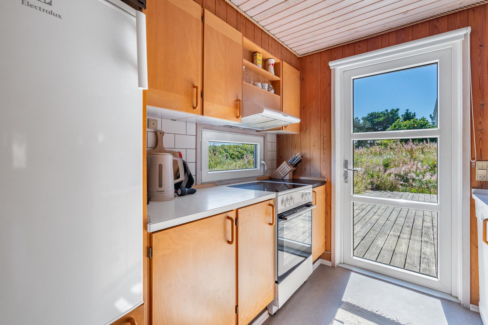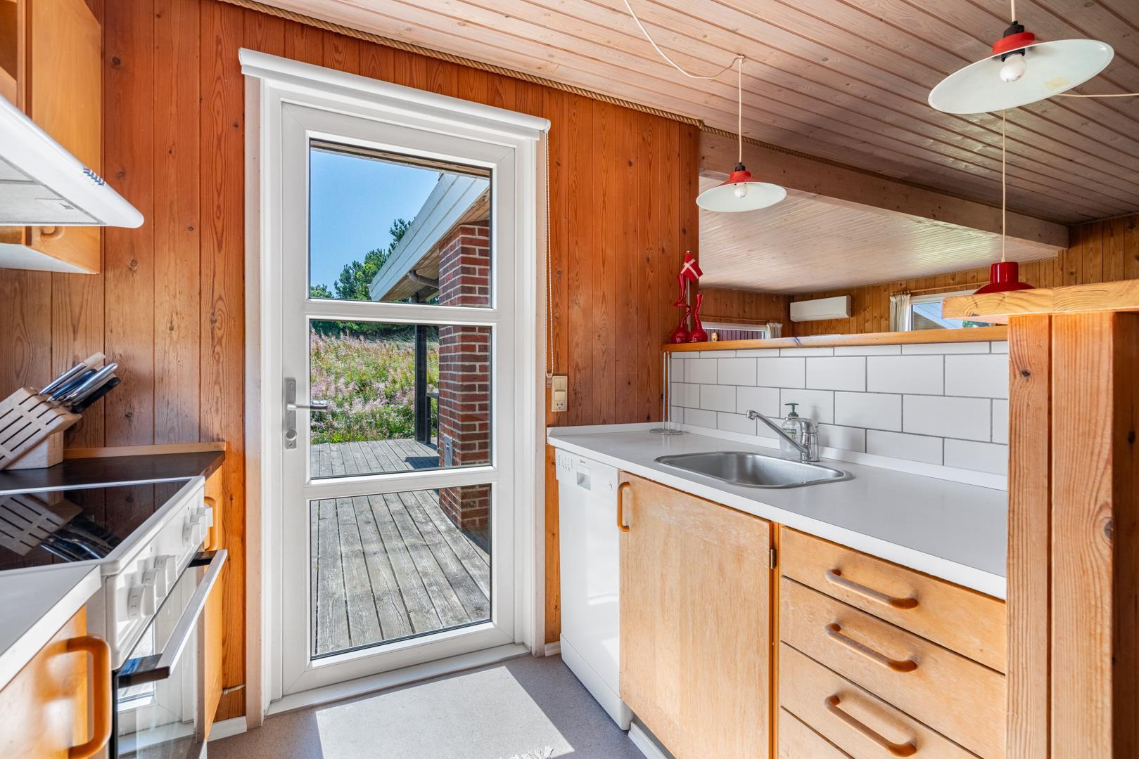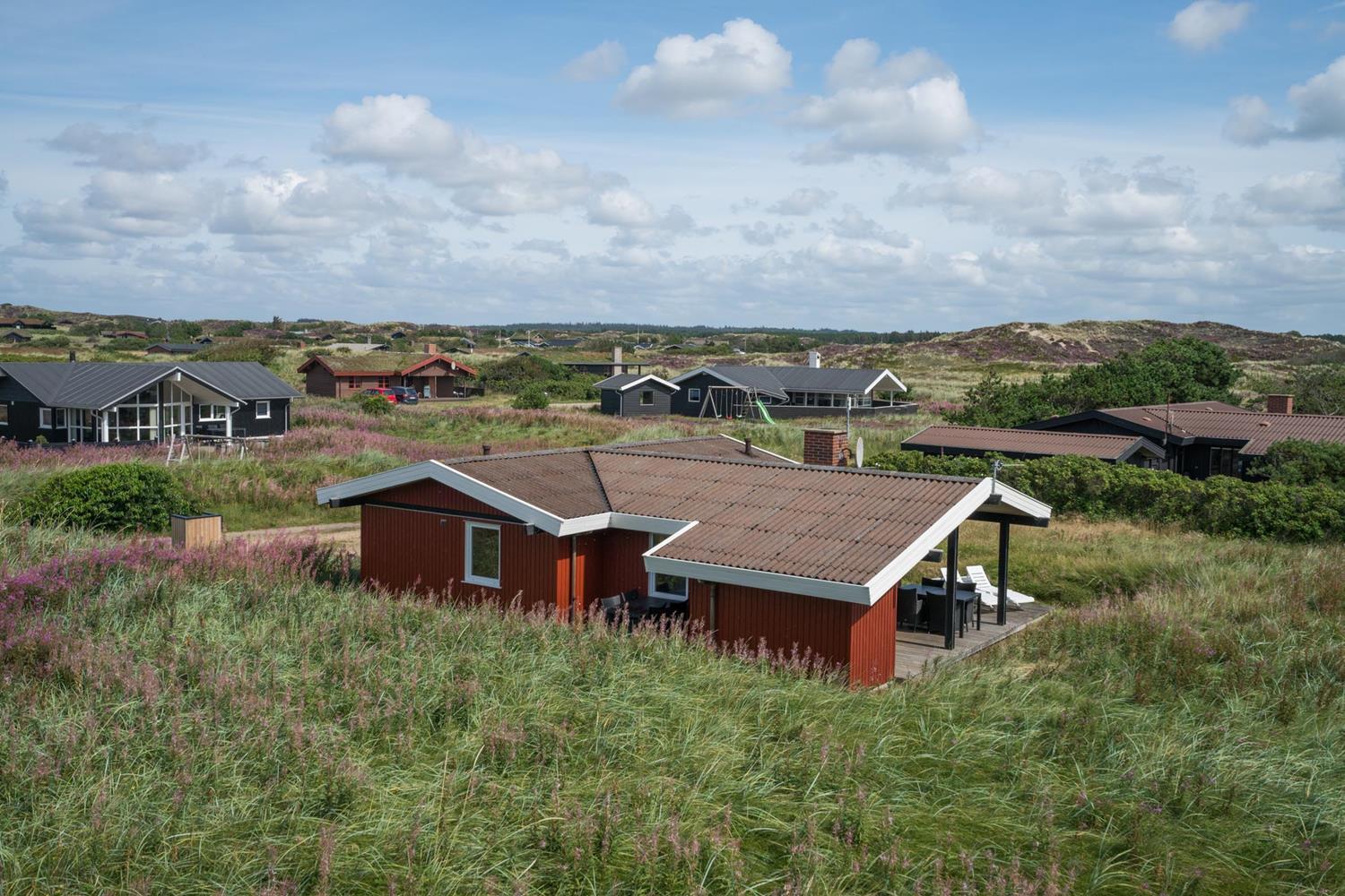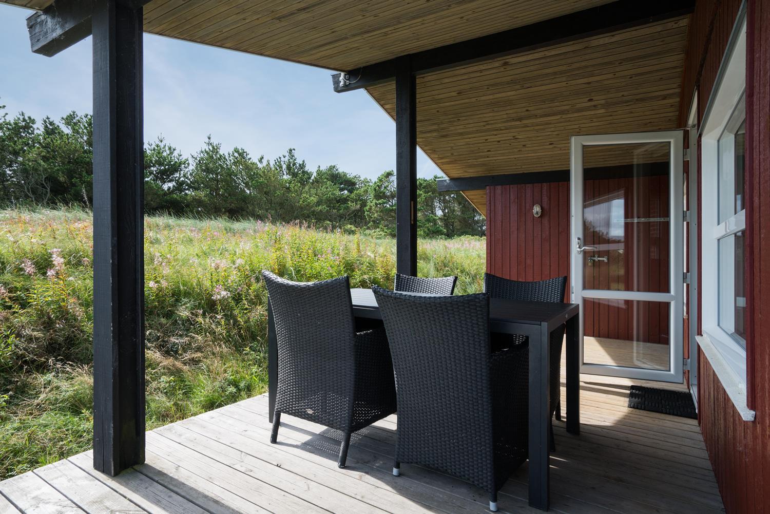 Hyggeligt feriehus beliggende på en lettere kuperet naturgrund tæt ved Henne Mølle Å og fredet hedeområde. Køkken i åben forbindelse til stue med udgang til delvis overdækket træ-terrasse som dækker 3 sider af huset. Fra køkkenet er der udgang til morgenterrassen.