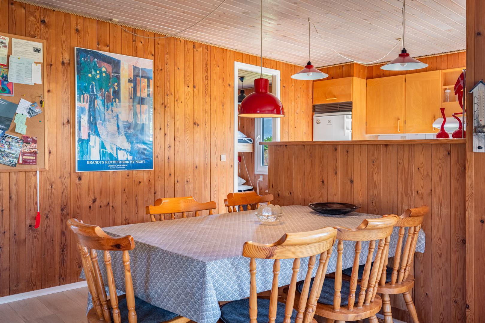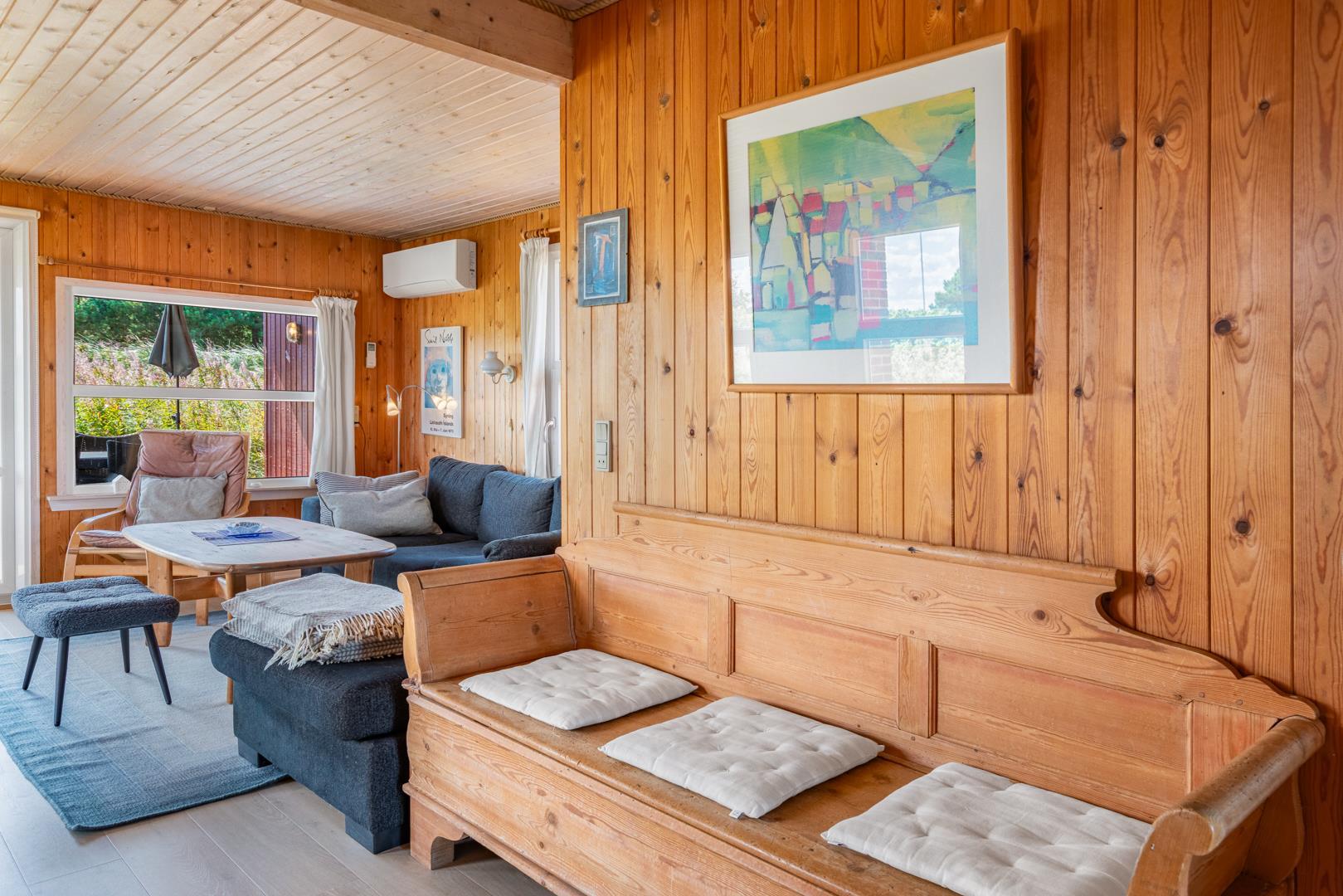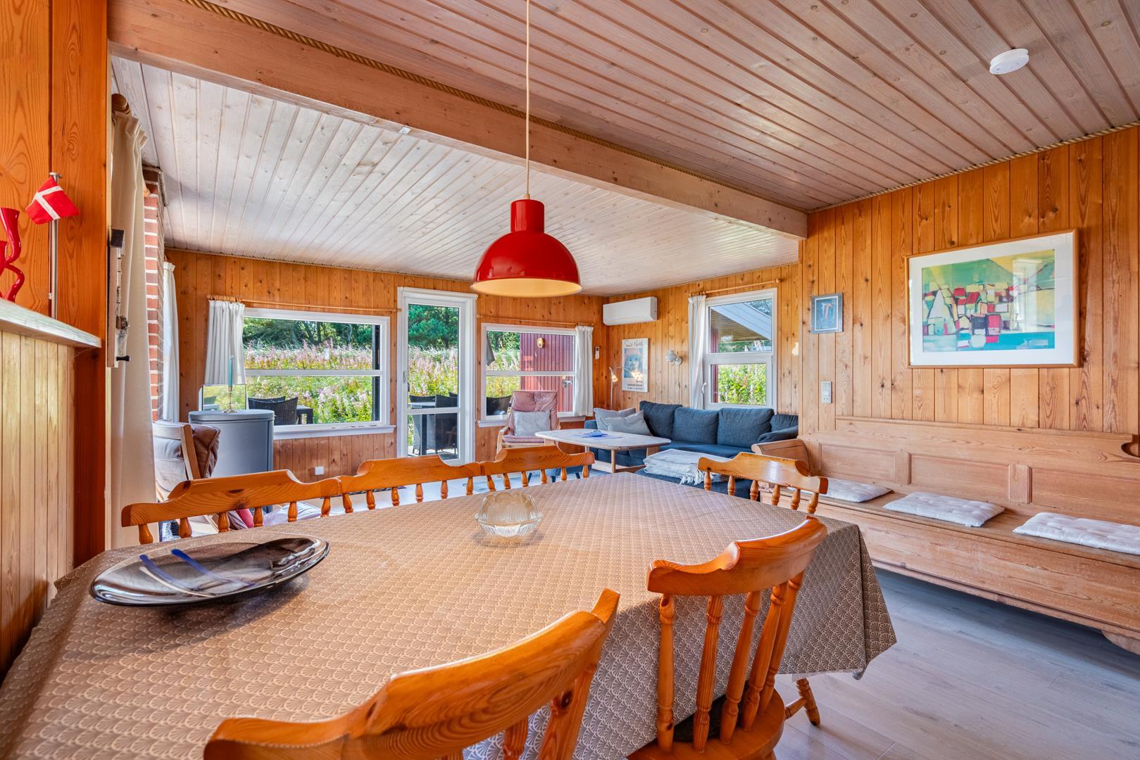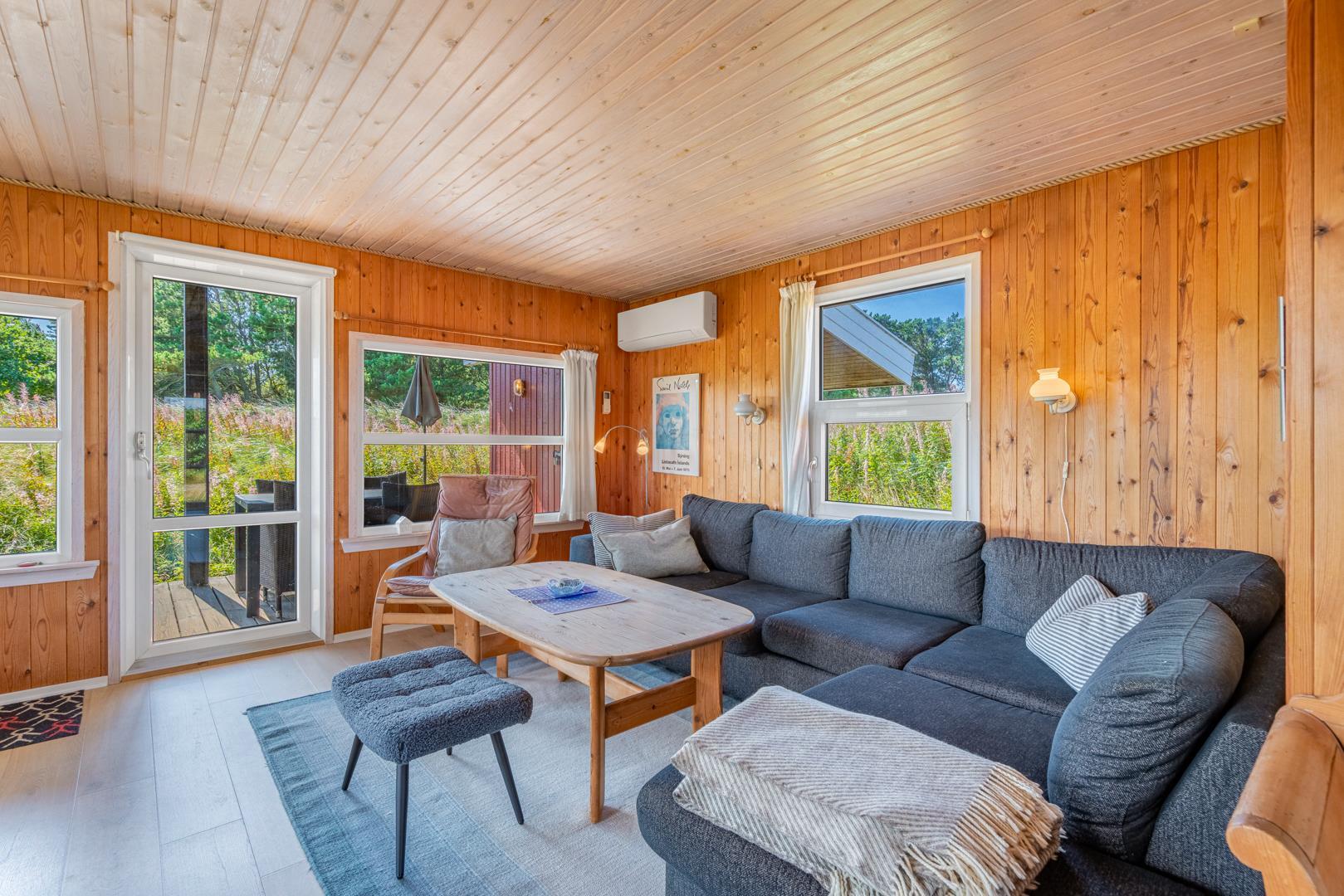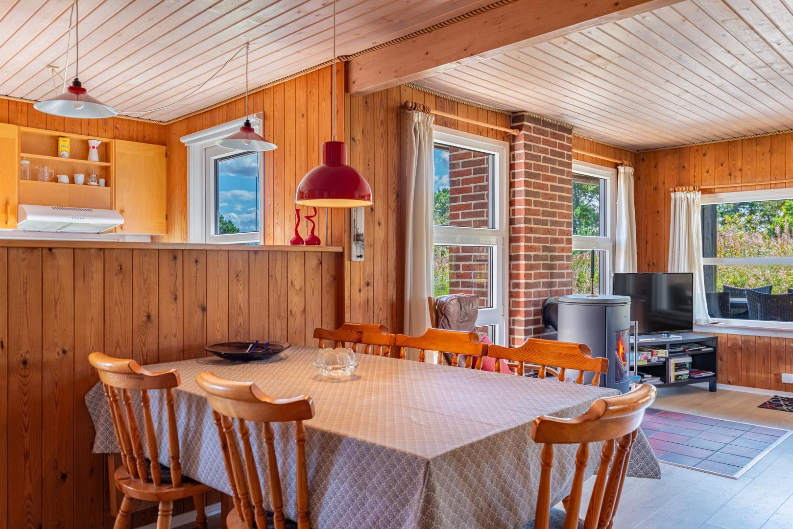 Hyggeligt feriehus beliggende på en lettere kuperet naturgrund tæt ved Henne Mølle Å og fredet hedeområde. Køkken i åben forbindelse til stue med udgang til delvis overdækket træ-terrasse som dækker 3 sider af huset. Fra køkkenet er der udgang til morgenterrassen.