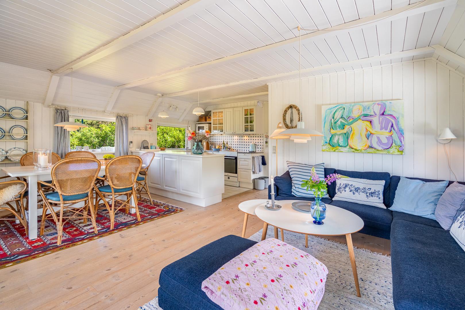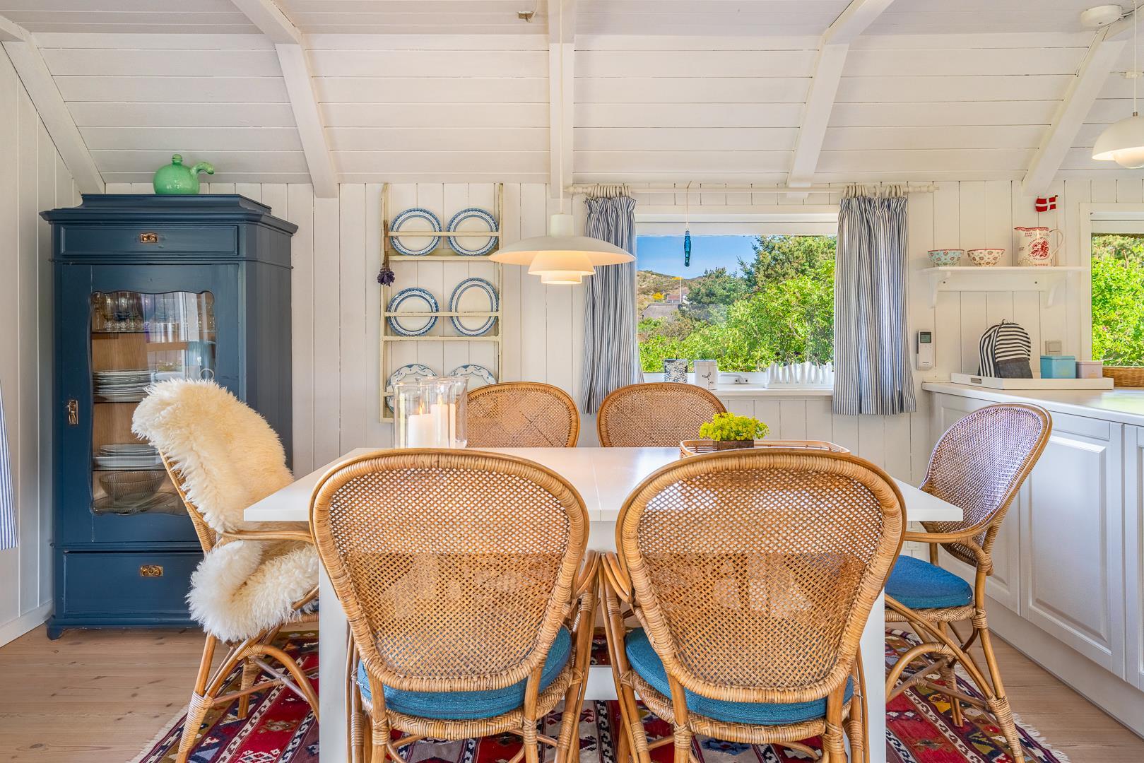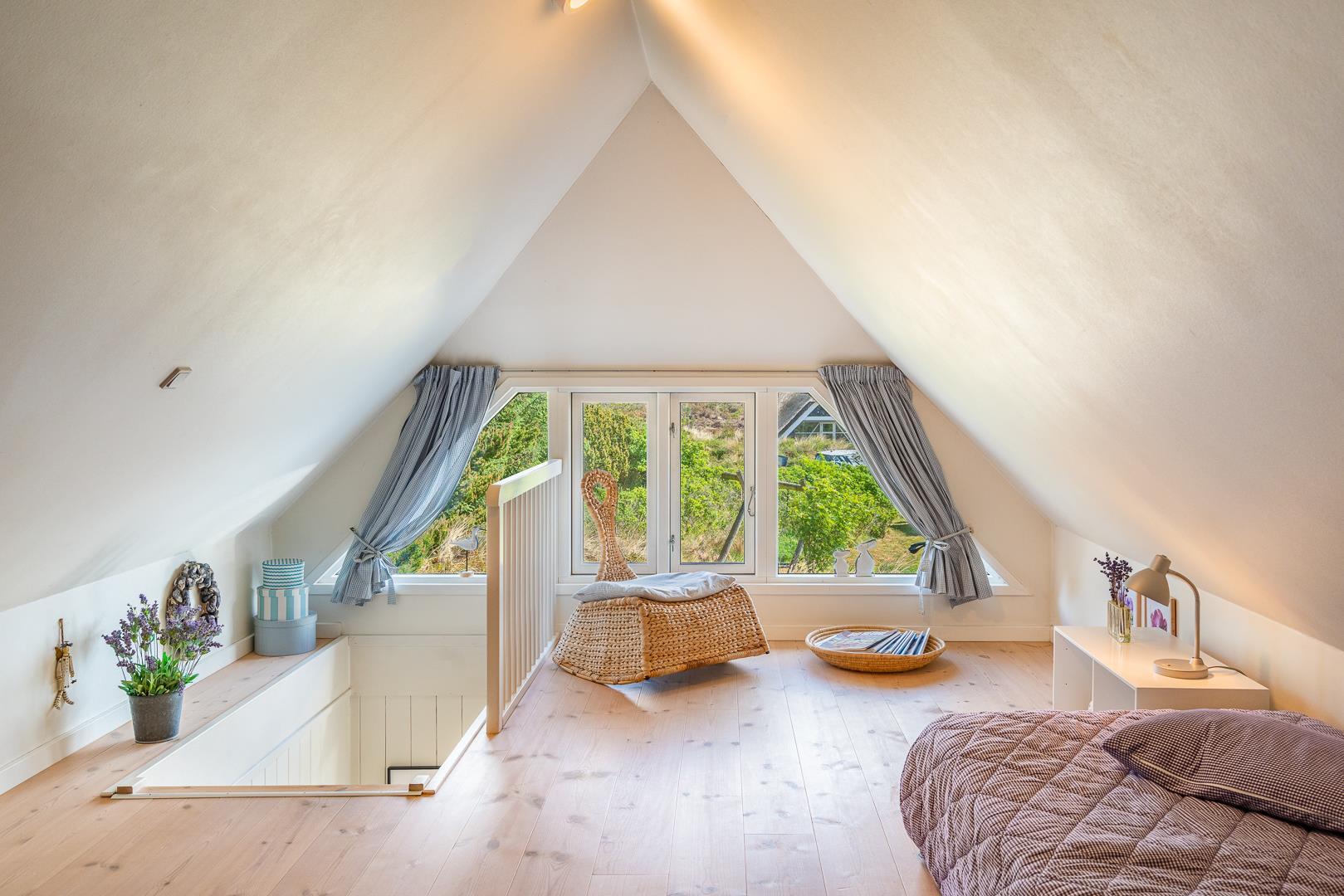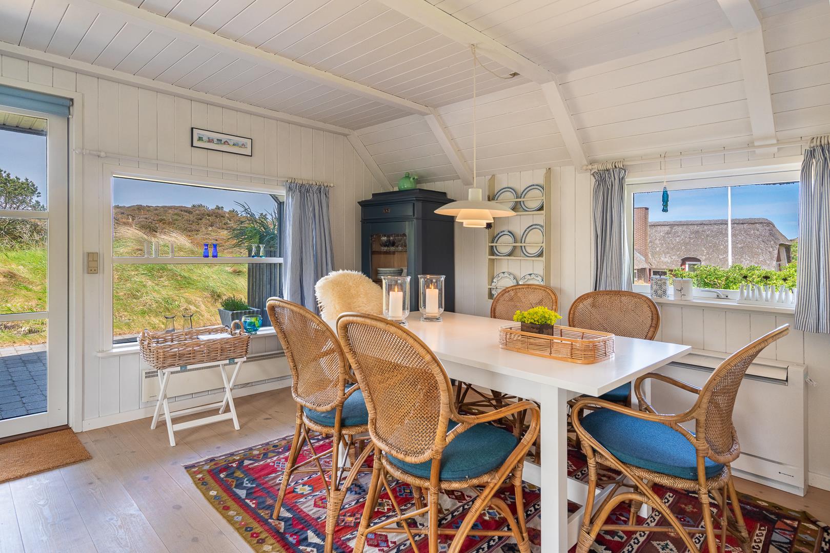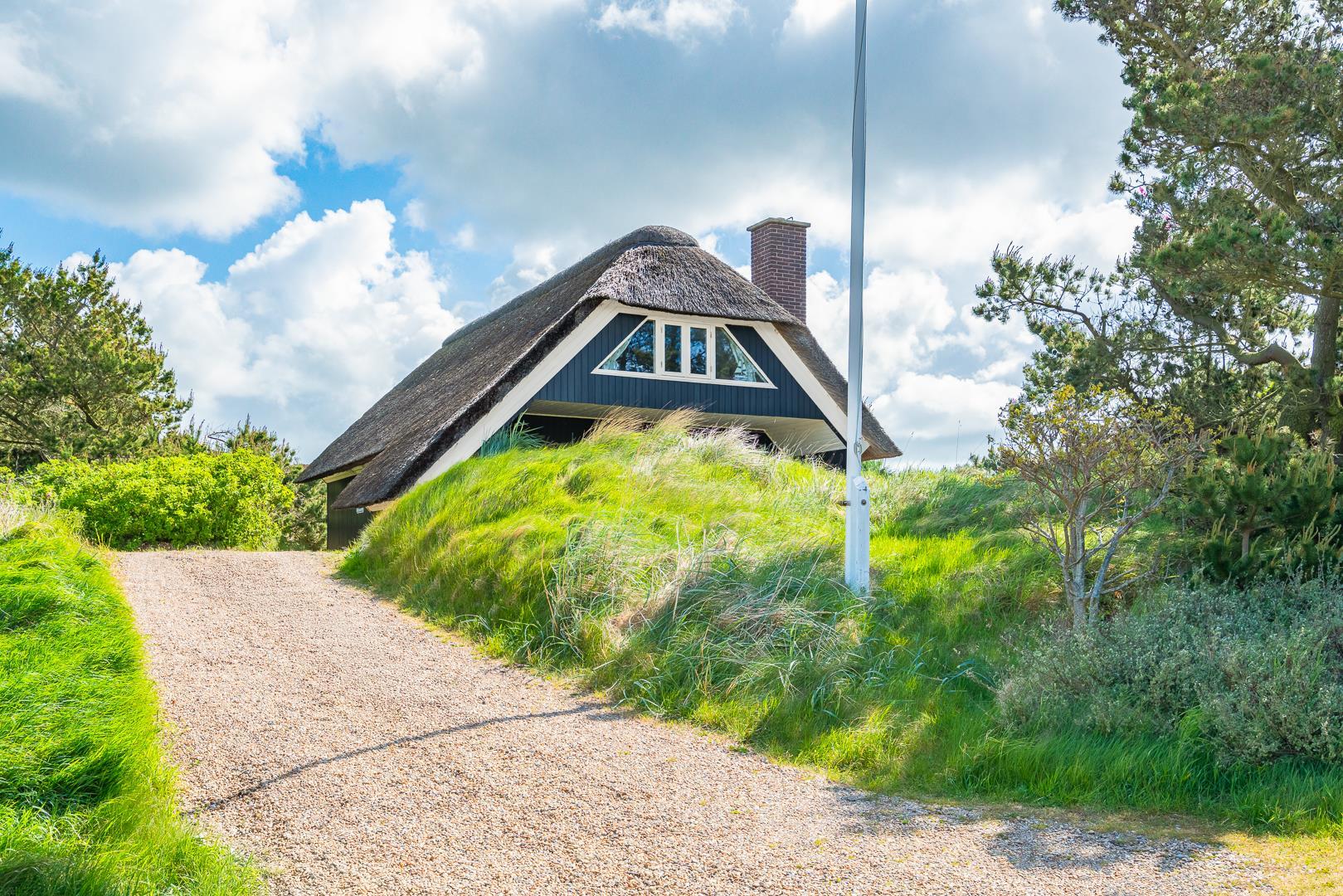 Sommerhus som emmer af rigtig dansk feriehygge! På en pragtfuld, kuperet og helt ugeneret klitgrund ligger dette skønne og velholdte feriehus med stråtag. Huset er overalt lyst, venligt og indrettet med nænsom hånd og med et personligt præg. På 1. sal er der repos med 2 ekstra sovepladser. Der er flere dejlige terrasser, hvoraf en er delvis overdækket. Dejligt badeværelse.