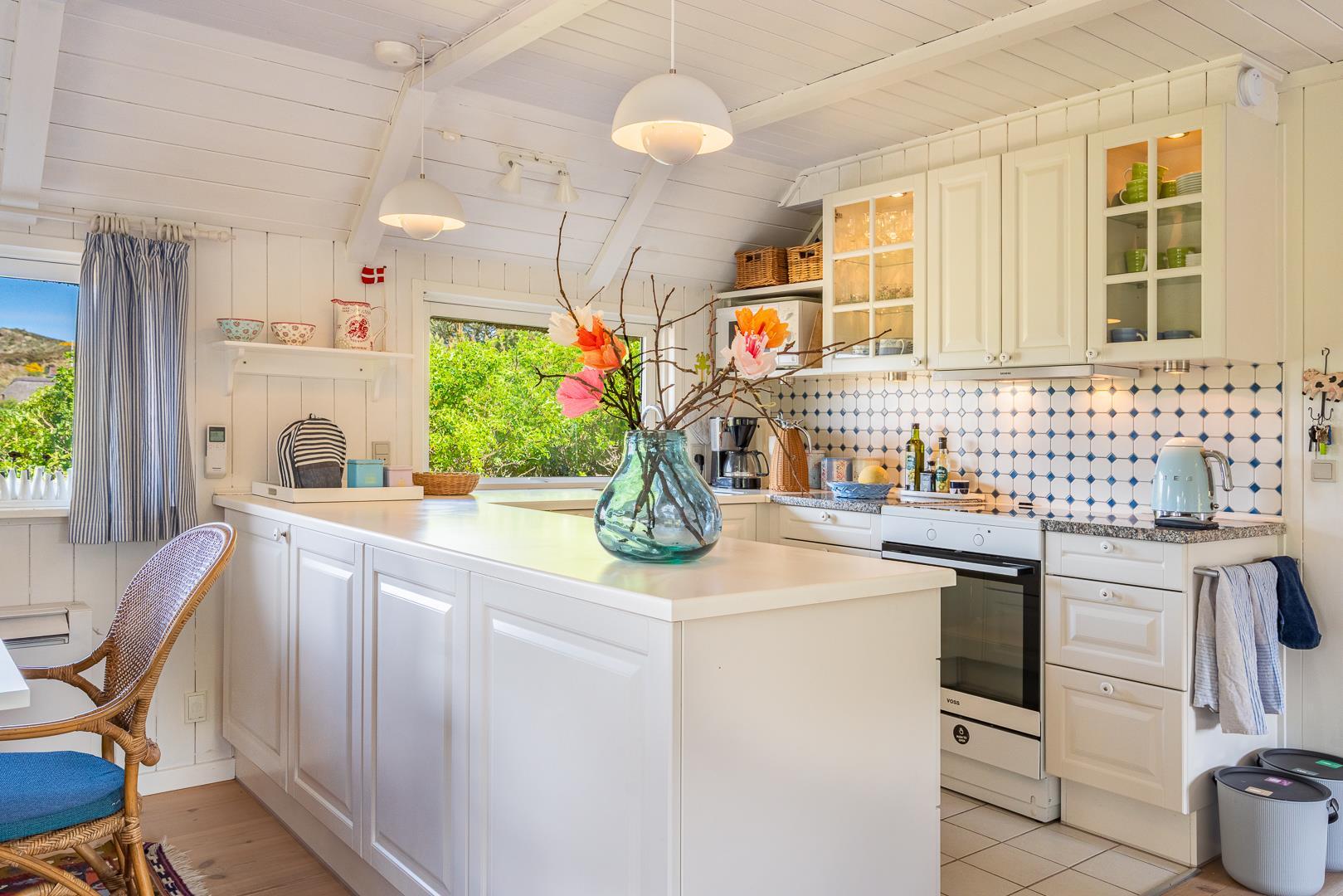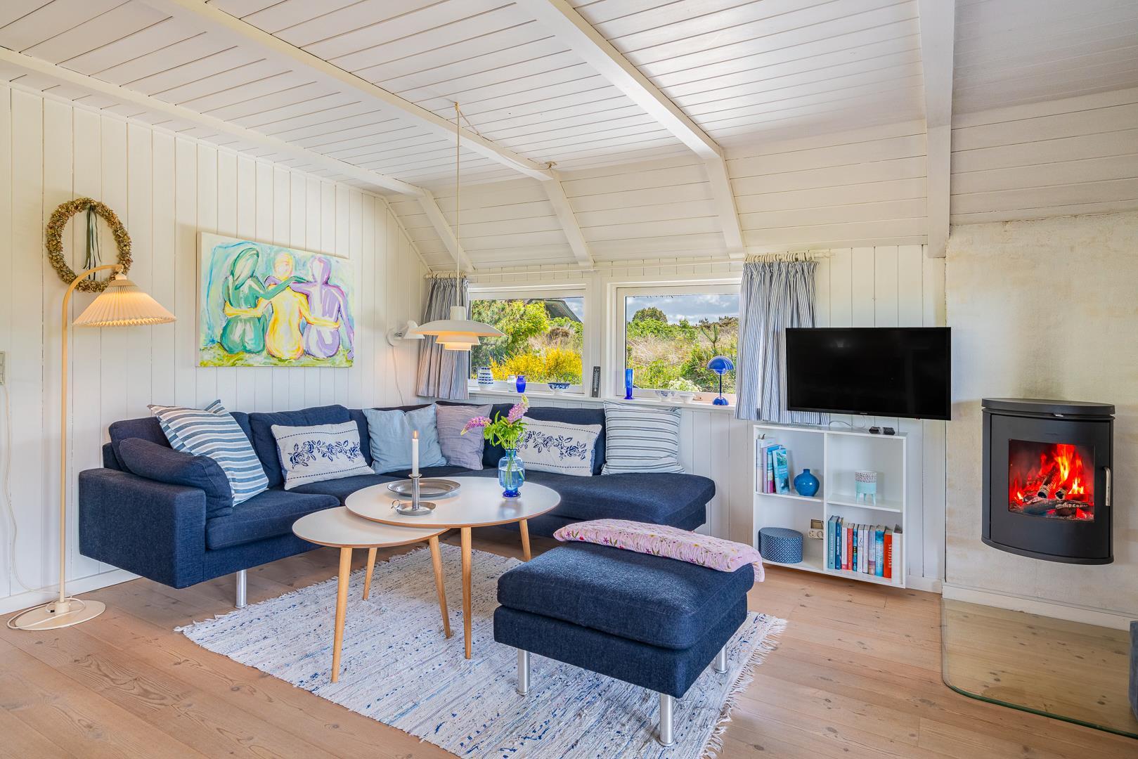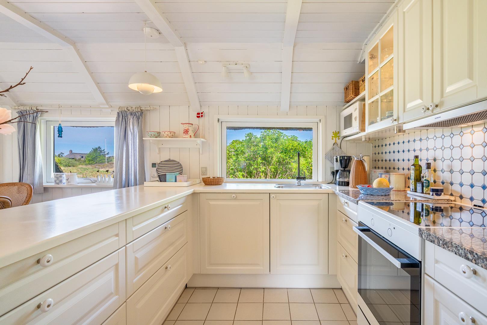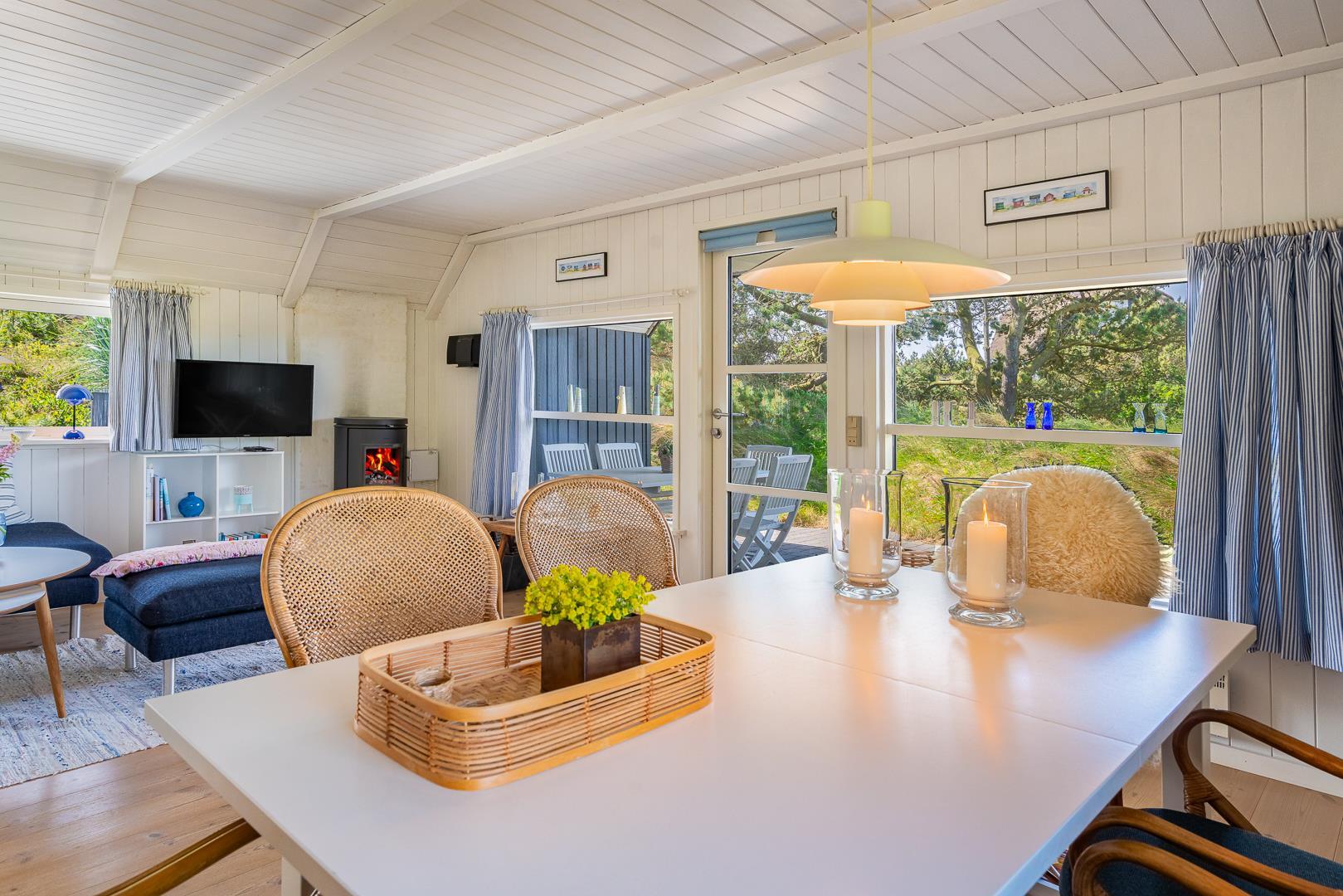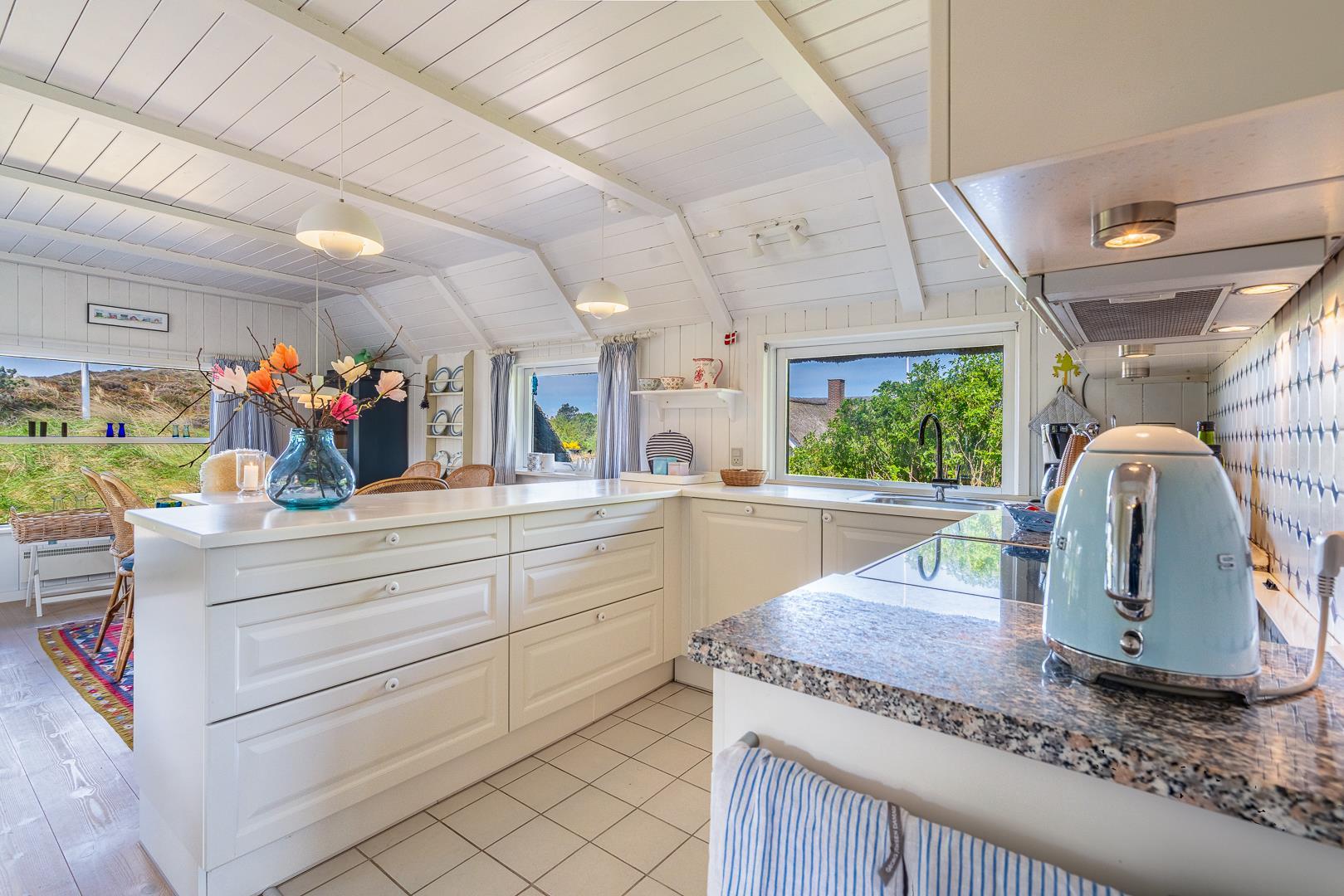 Sommerhus som emmer af rigtig dansk feriehygge! På en pragtfuld, kuperet og helt ugeneret klitgrund ligger dette skønne og velholdte feriehus med stråtag. Huset er overalt lyst, venligt og indrettet med nænsom hånd og med et personligt præg. På 1. sal er der repos med 2 ekstra sovepladser. Der er flere dejlige terrasser, hvoraf en er delvis overdækket. Dejligt badeværelse.