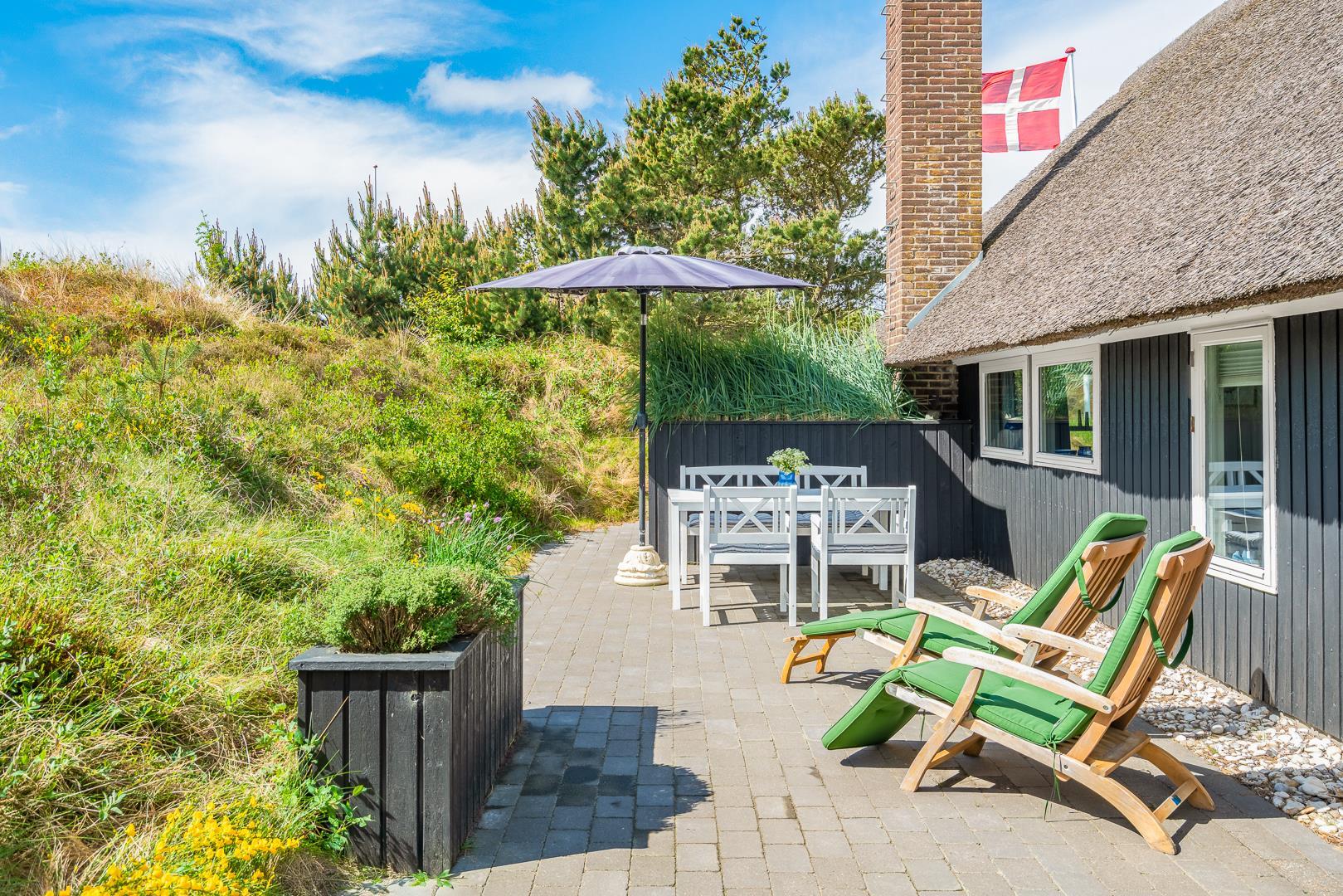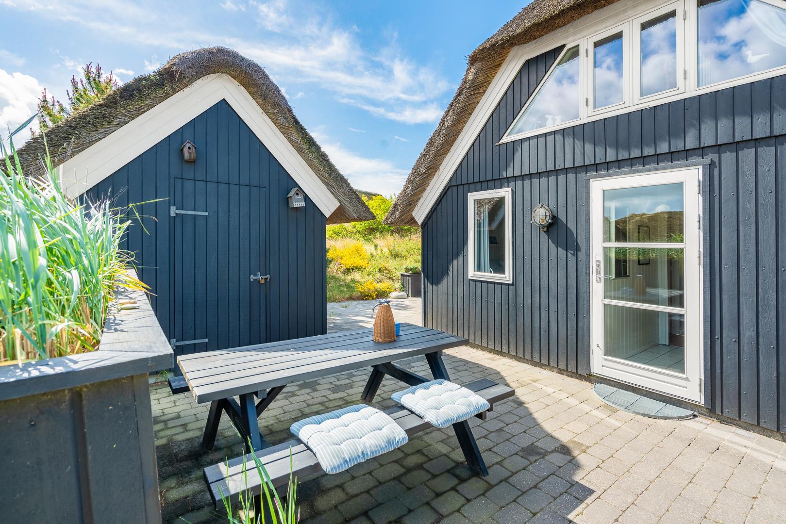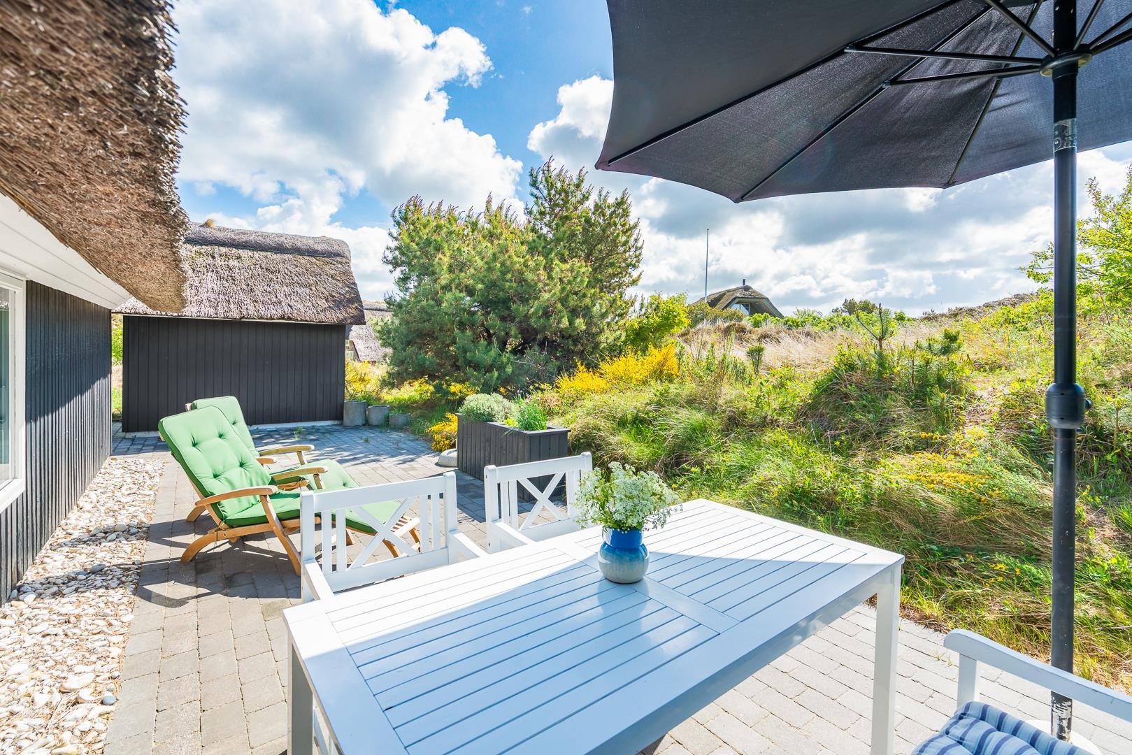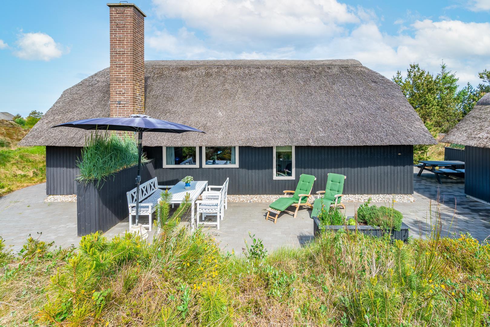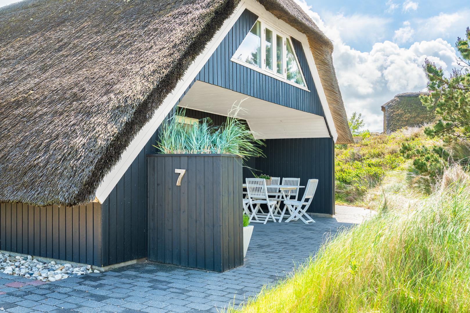 Sommerhus med stråtag og skøn terrasse ved havet