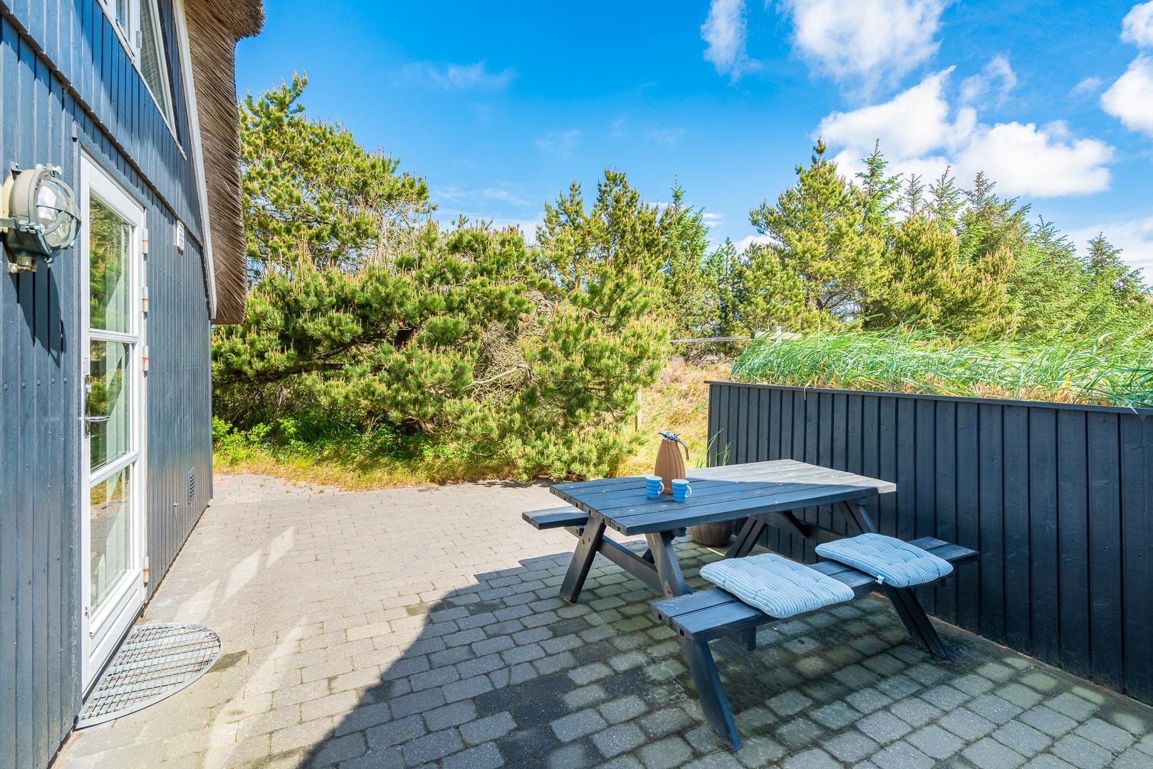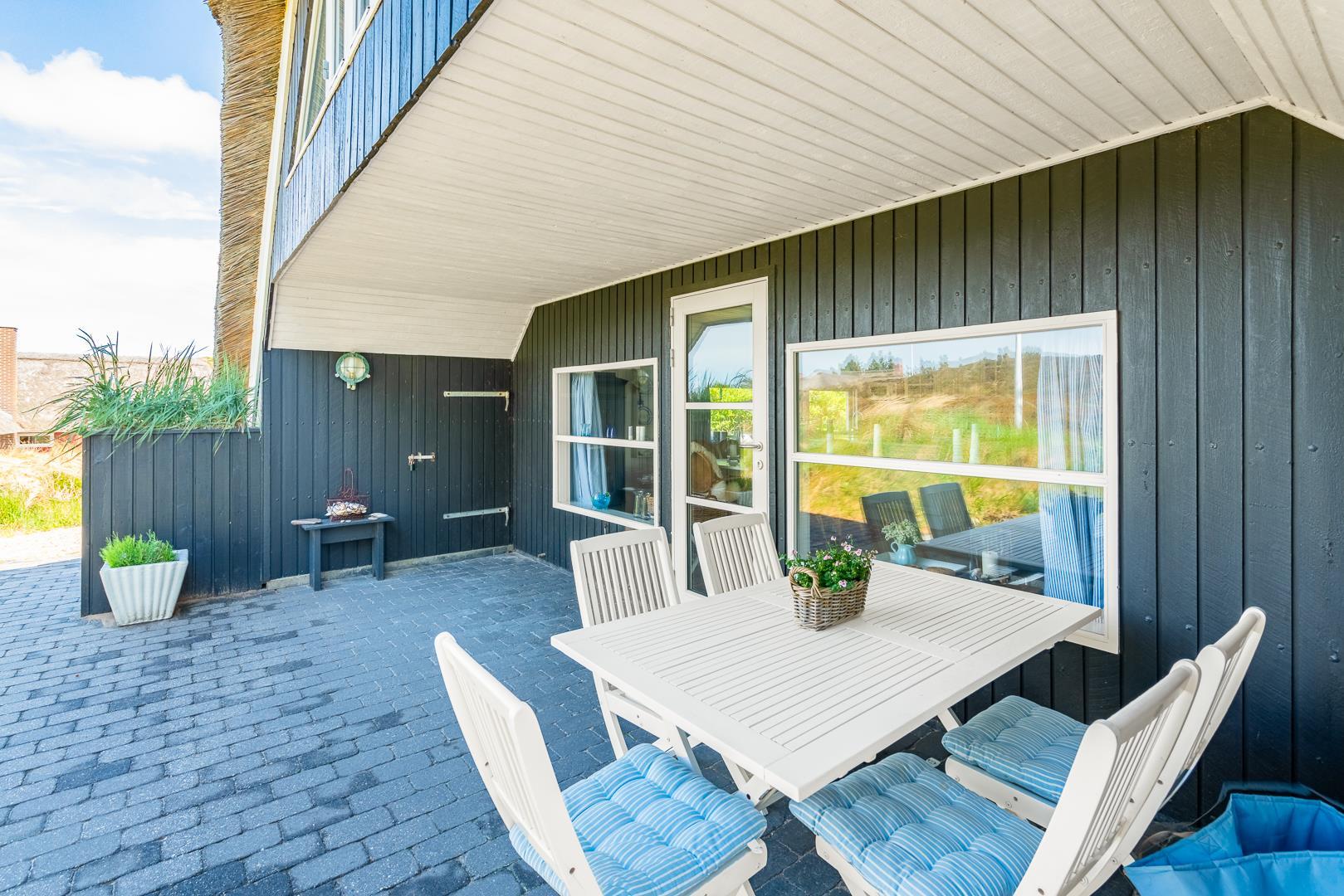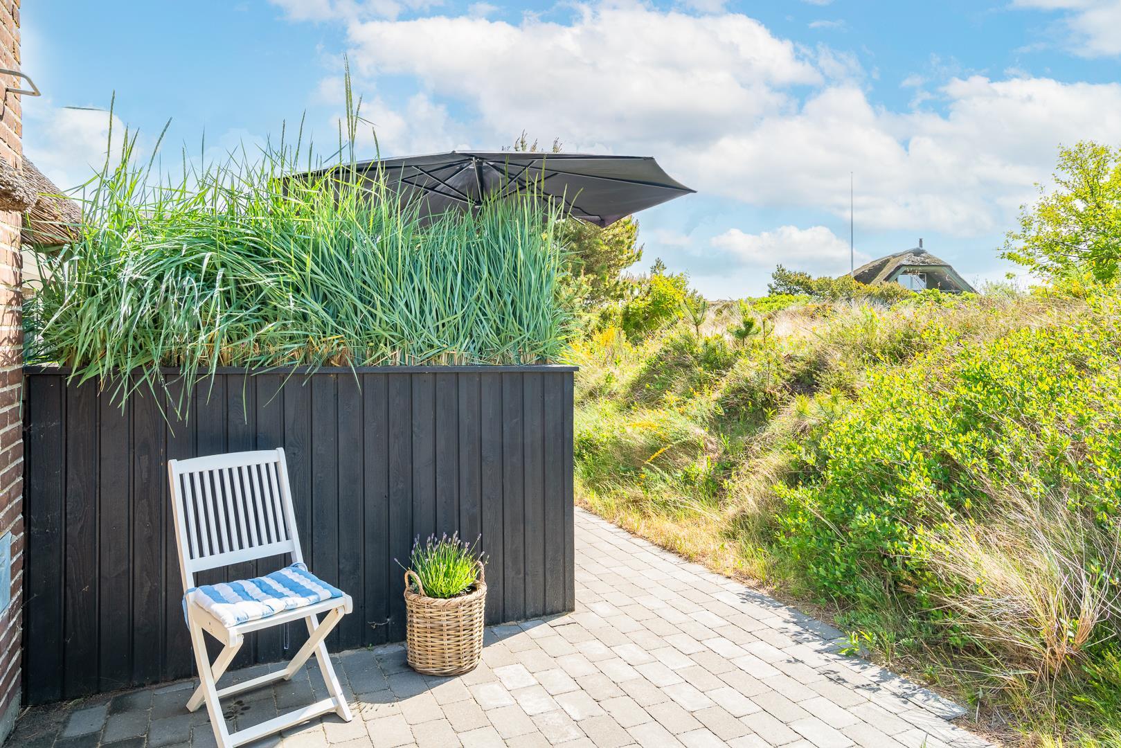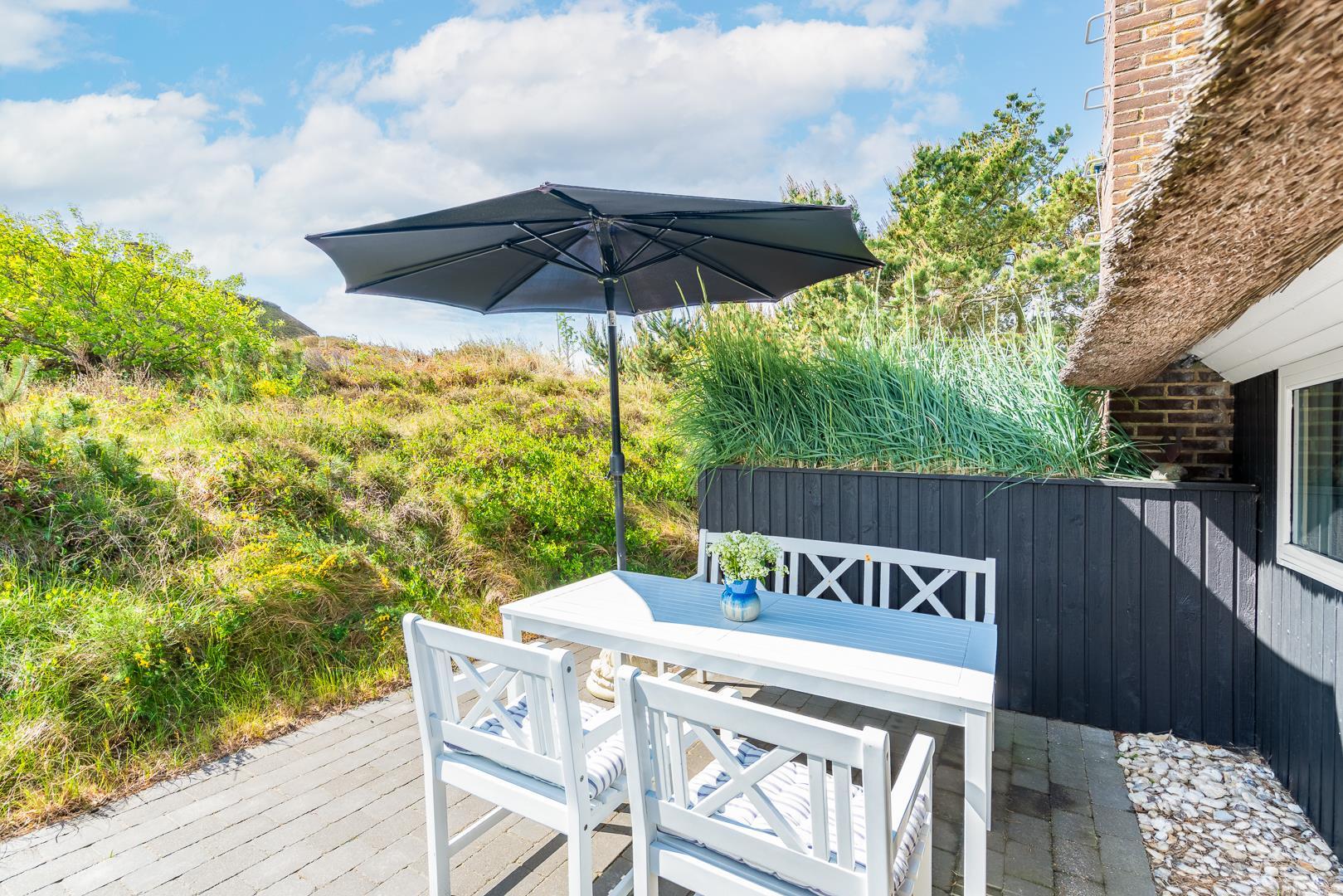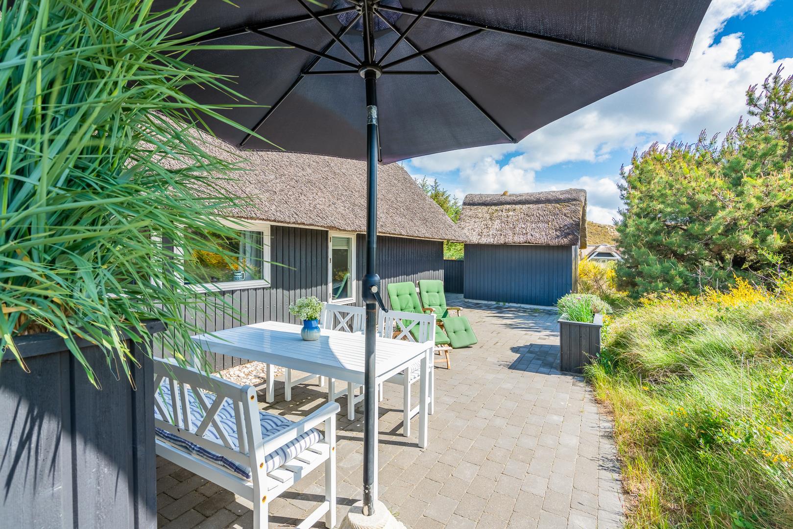 Sommerhus med stråtag og skøn terrasse ved havet