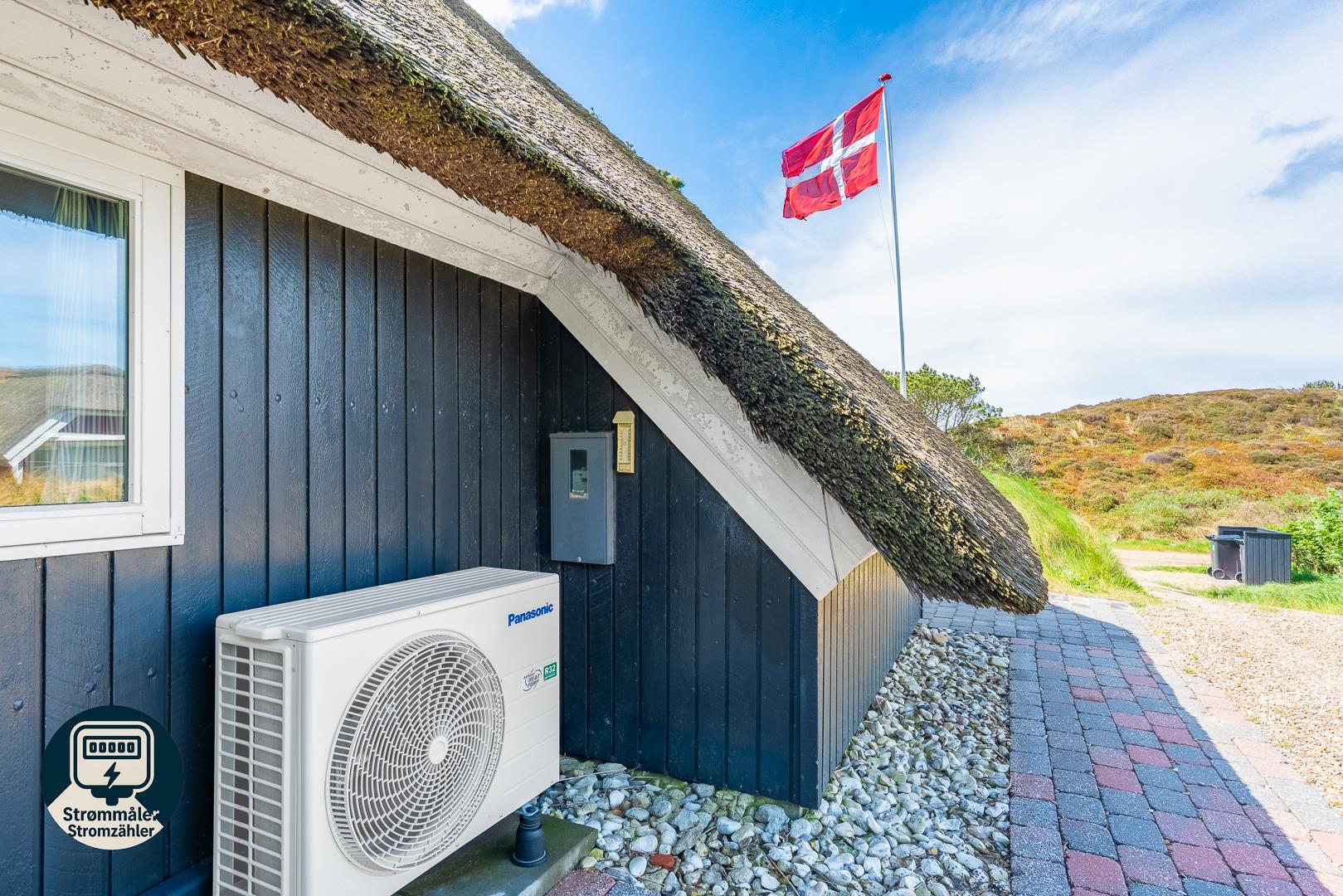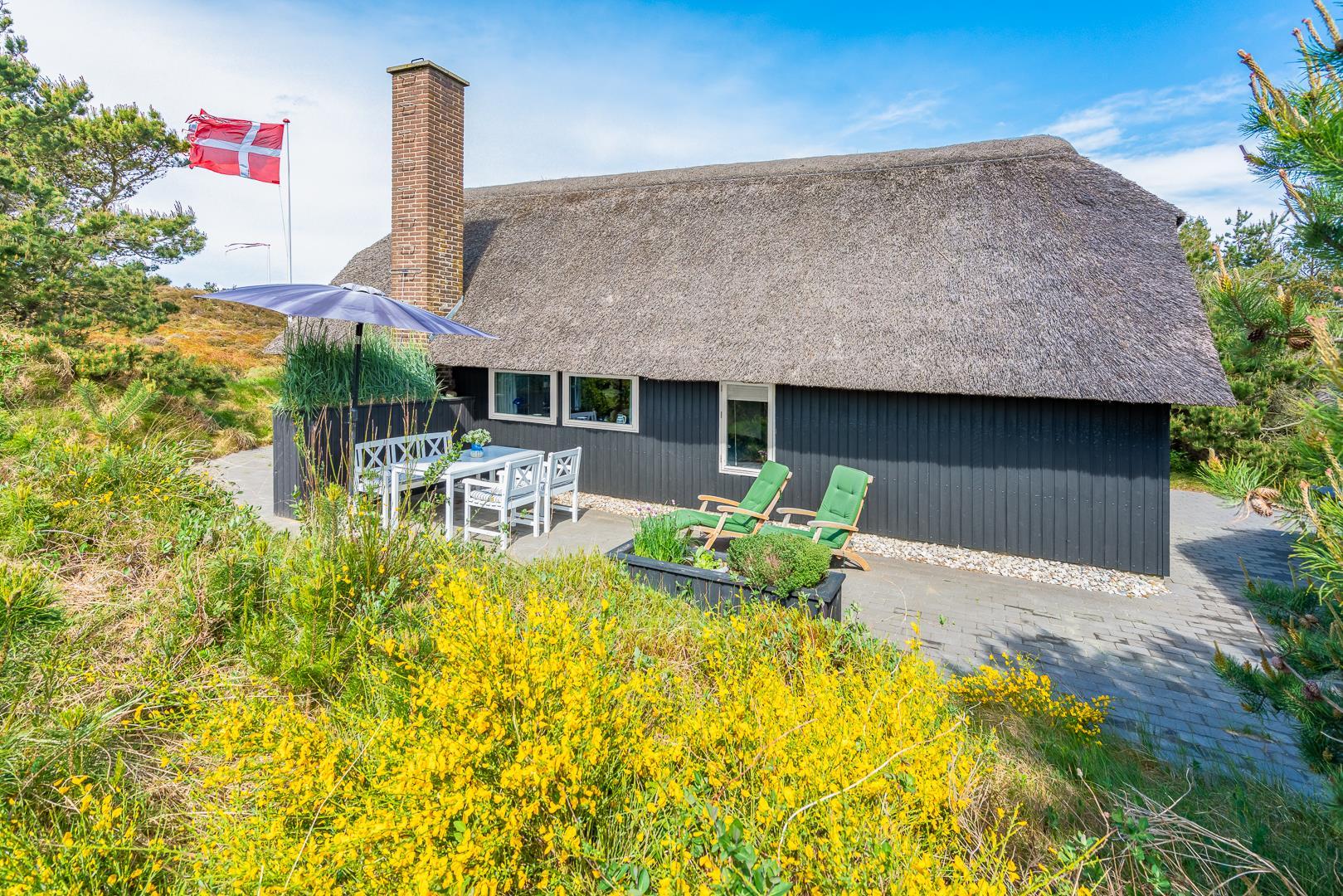 Hyggeligt dansk sommerhus med stråtag, flere terrasser og kun 700 m til havet i Henne Strand.