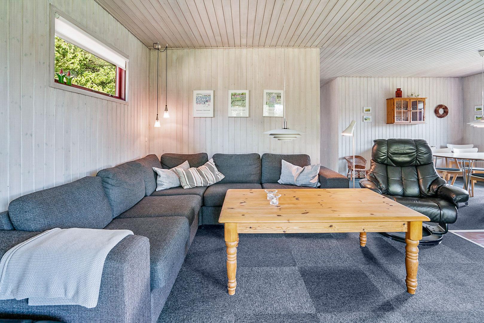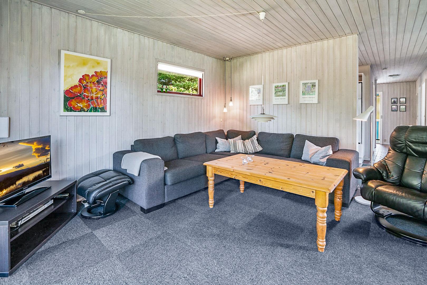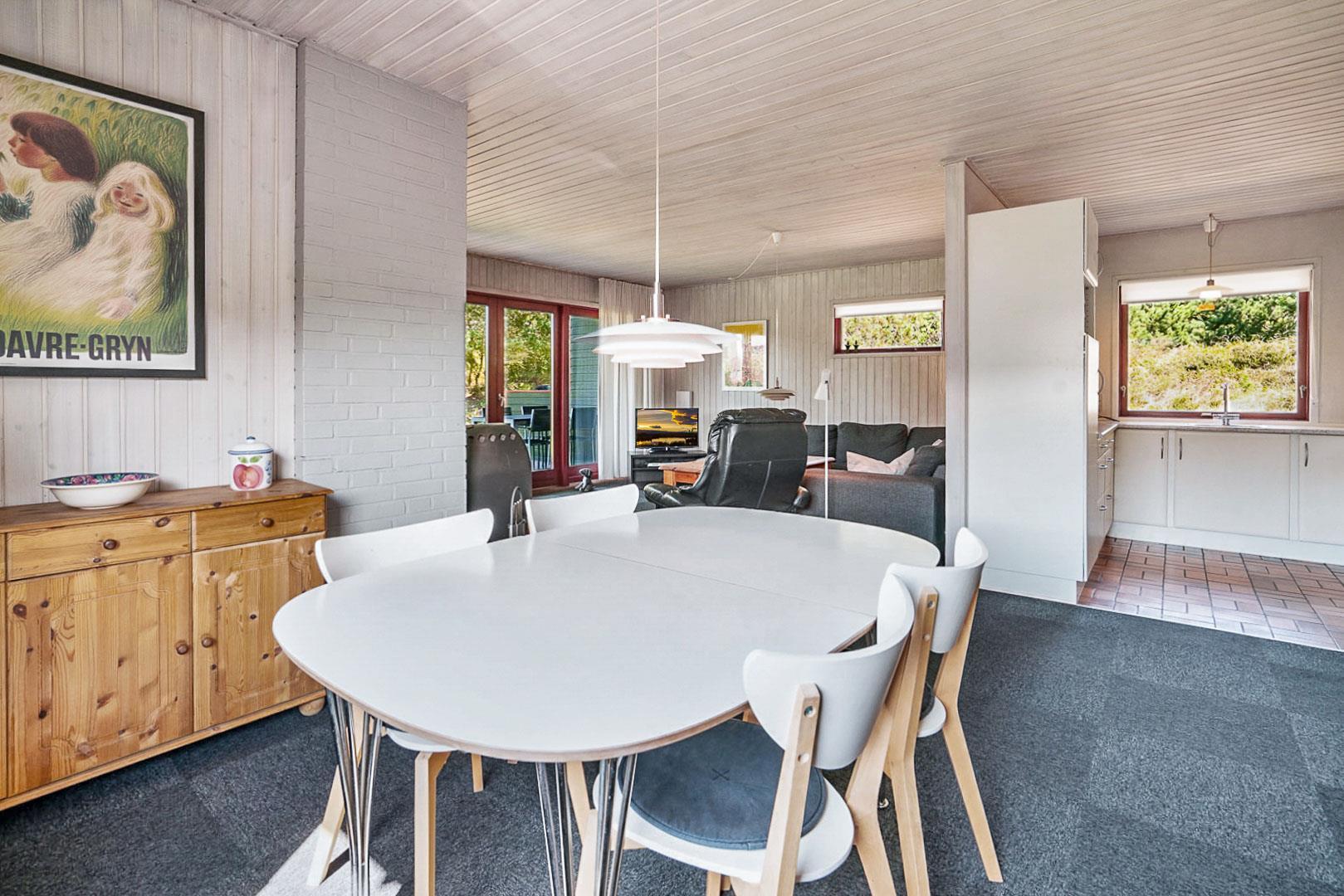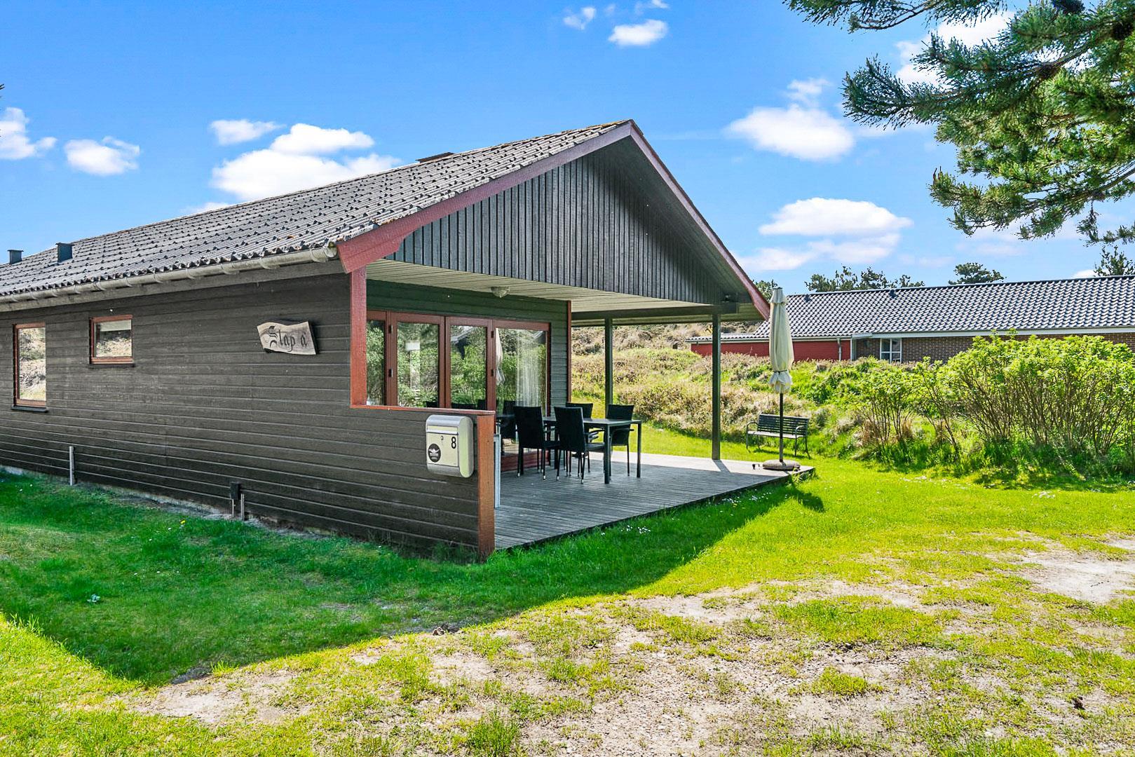Velholdt feriehus beliggende på en dejlig ugeneret naturgrund for enden af en blind vej. Feriehuset er løbende blevet moderniseret med nye møbler, tæpper og malet i lyser farver. Nyere lyst køkken. Hyggelig stue med brændeovn og varmepumpe. Der er direkte udgang til syd-vest vendt delvis overdækket og ugeneret terrasse. Et meget velpasset og smagfuld indrettet feriehus.