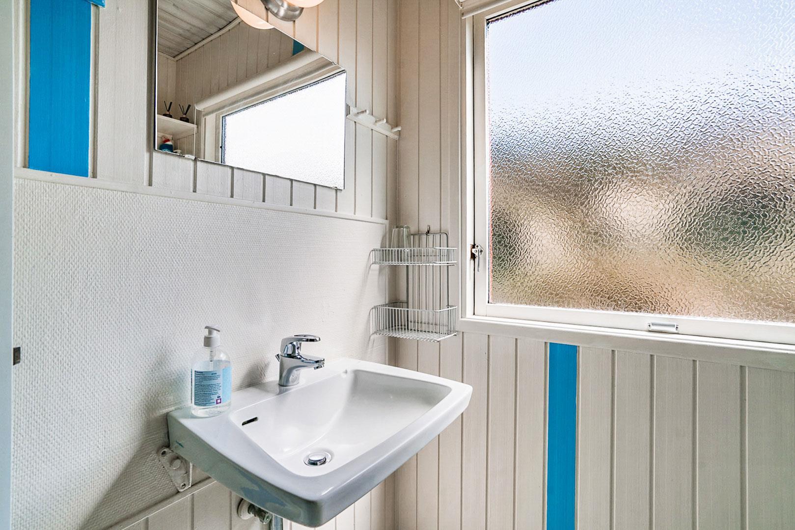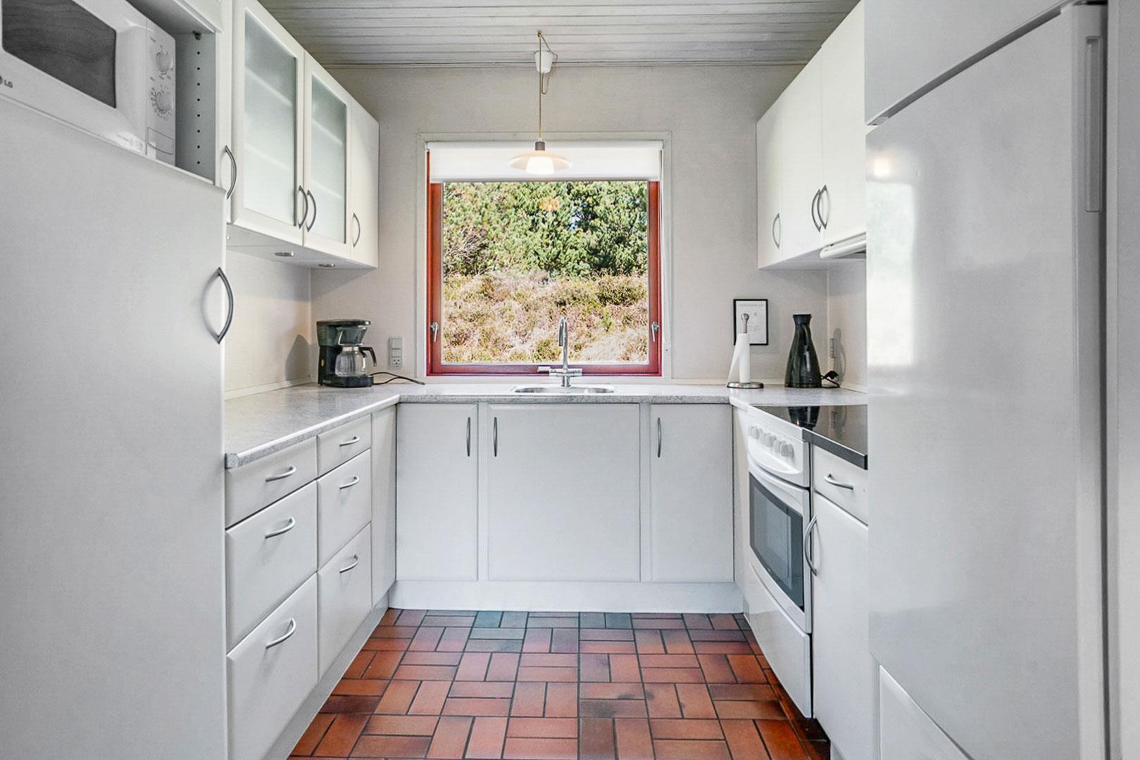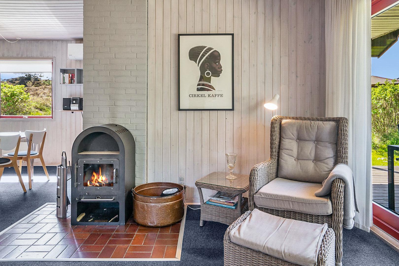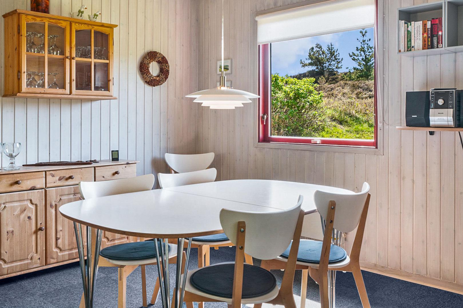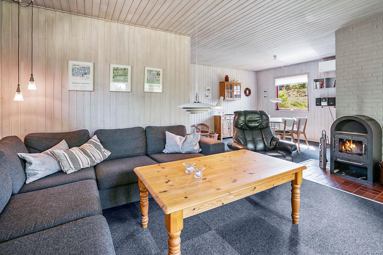 Velholdt feriehus beliggende på en dejlig ugeneret naturgrund for enden af en blind vej. Feriehuset er løbende blevet moderniseret med nye møbler, tæpper og malet i lyser farver. Nyere lyst køkken. Hyggelig stue med brændeovn og varmepumpe. Der er direkte udgang til syd-vest vendt delvis overdækket og ugeneret terrasse. Et meget velpasset og smagfuld indrettet feriehus.