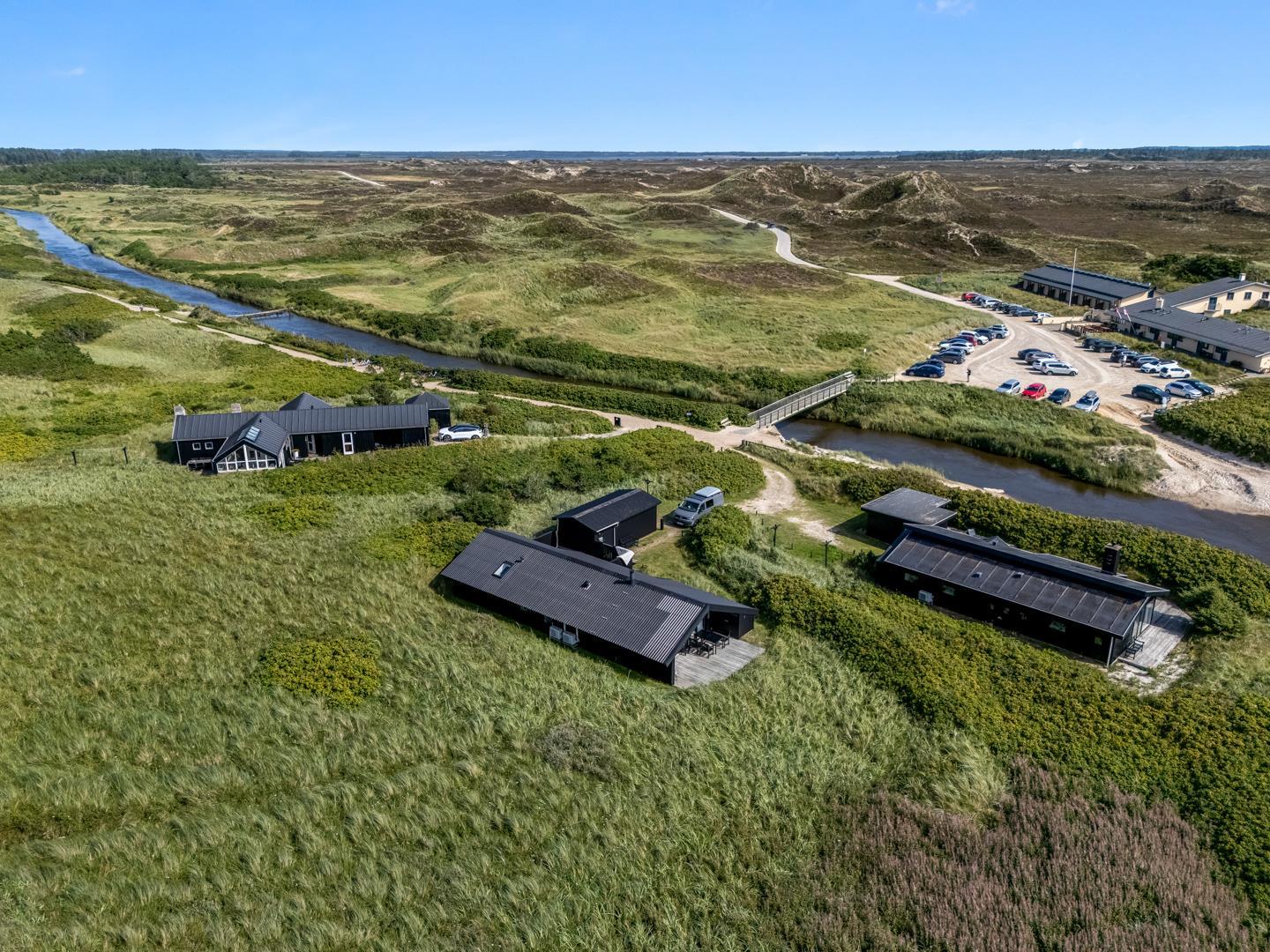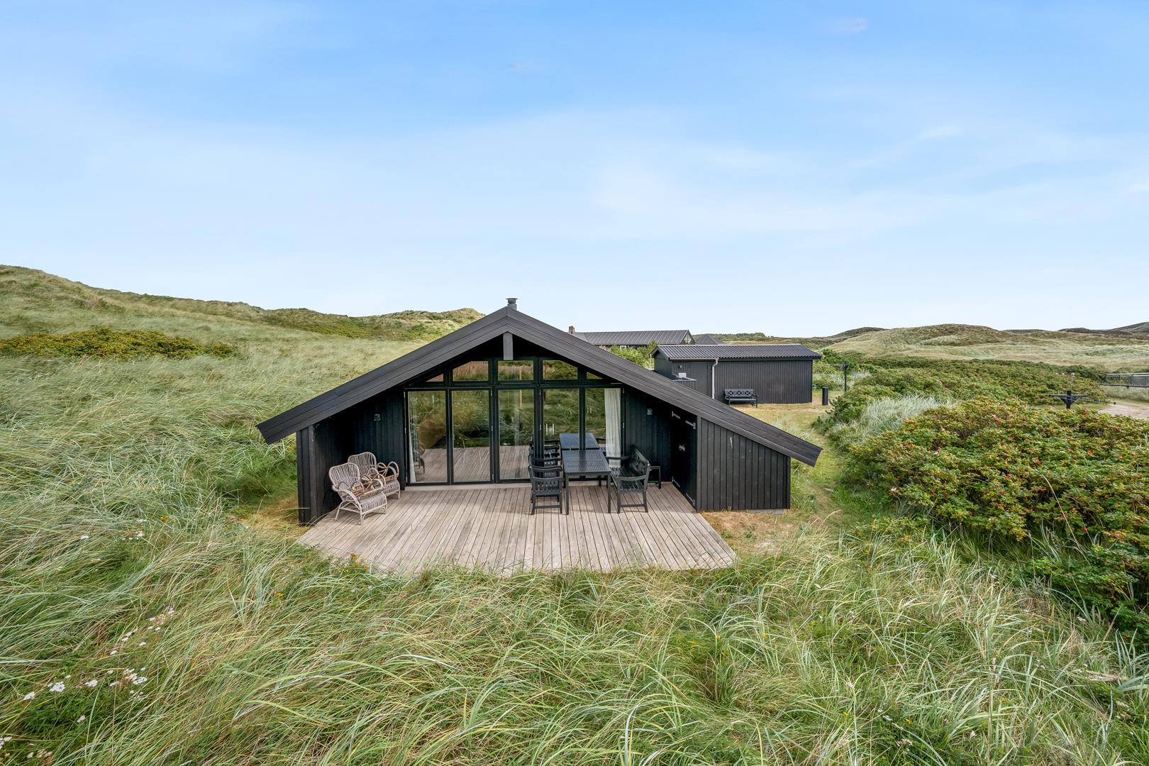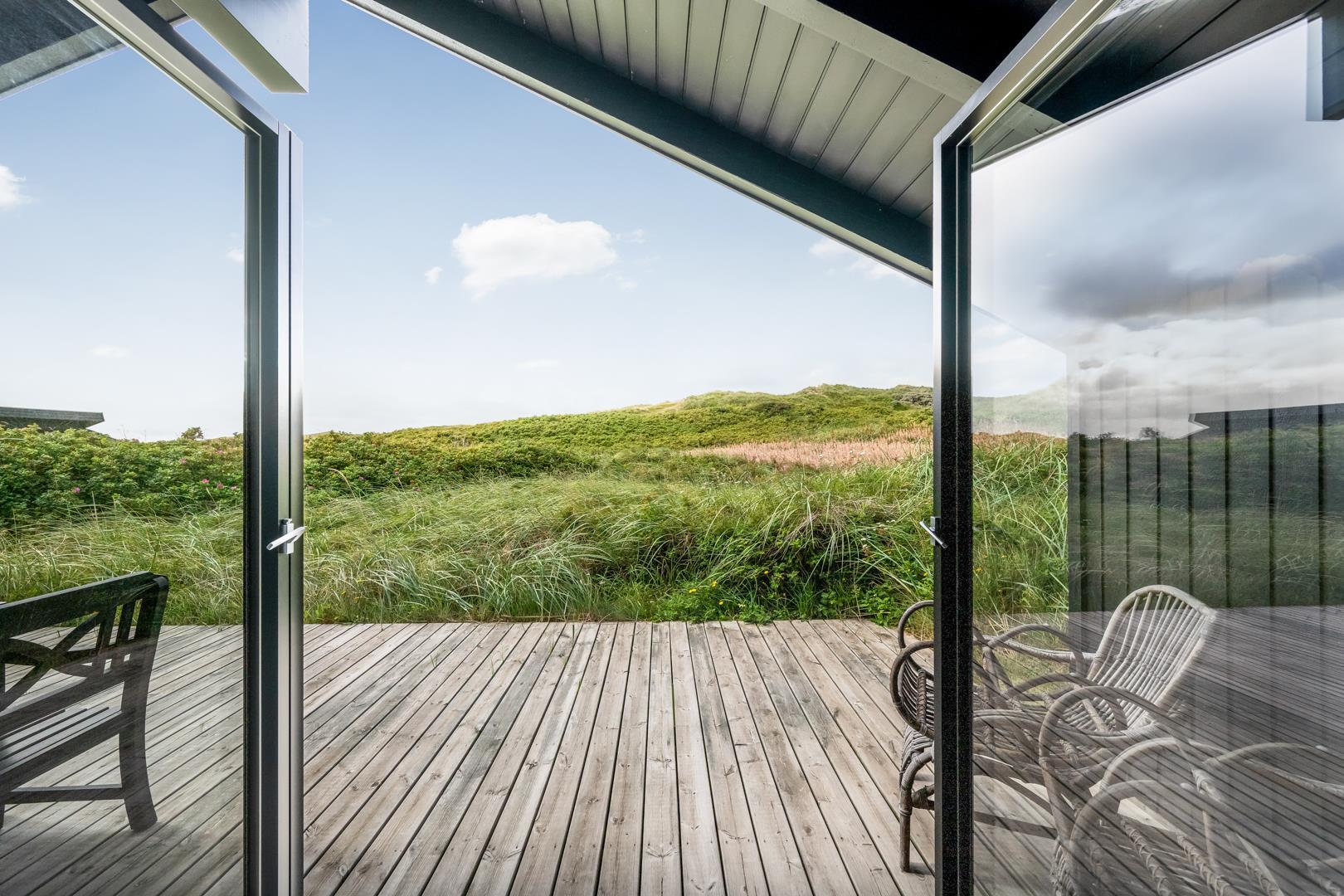 Rundt om sommerhuset og på naturgrunden inviterer flere beskyttede og solrige terrasser til afslapning. Fra den ugenerede, delvist overdækkede vestterrasse er der en fantastisk udsigt over det omkringliggende klitlandskab – her kan I opleve Henne Strands smukkeste solnedgange.