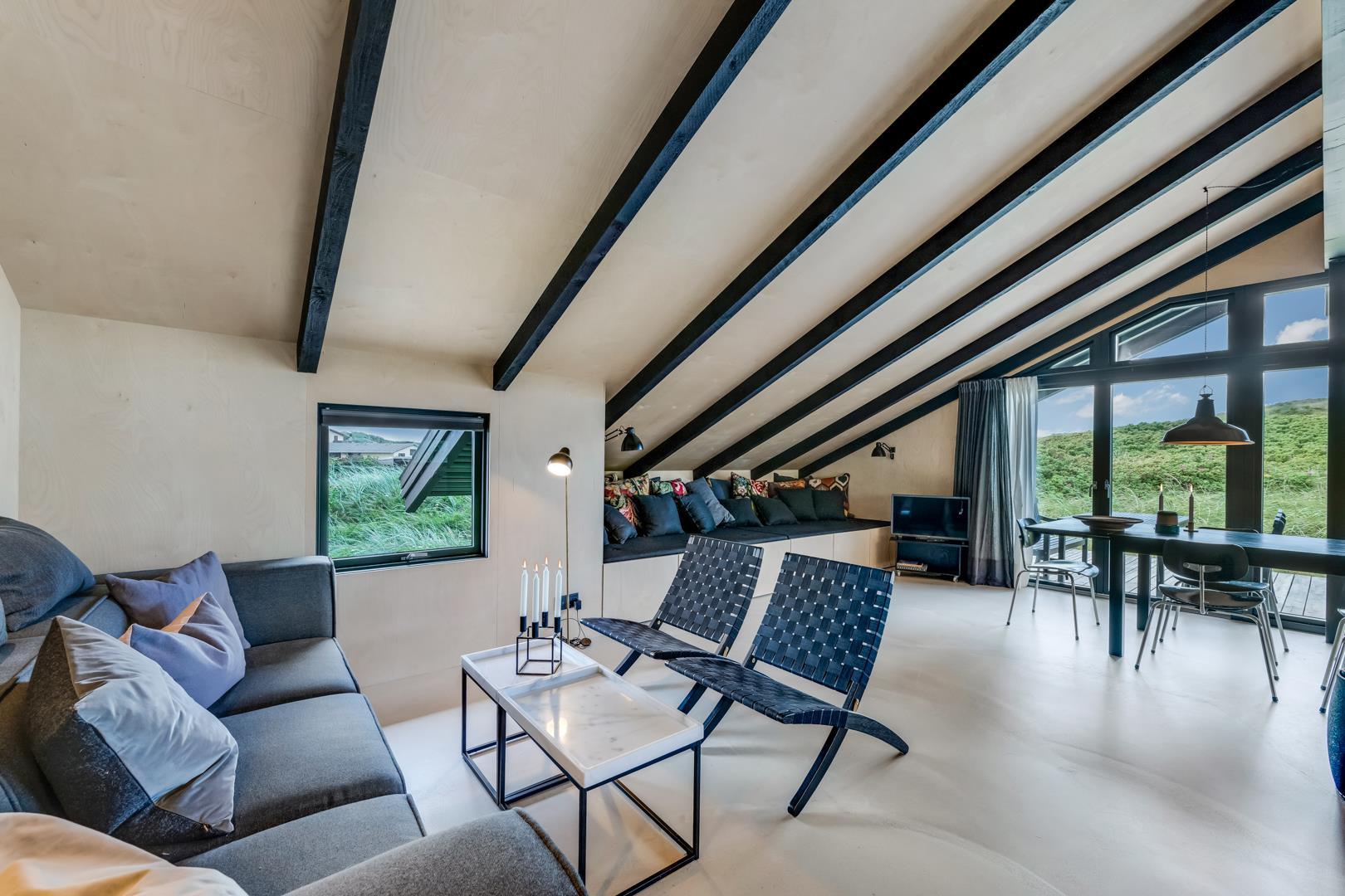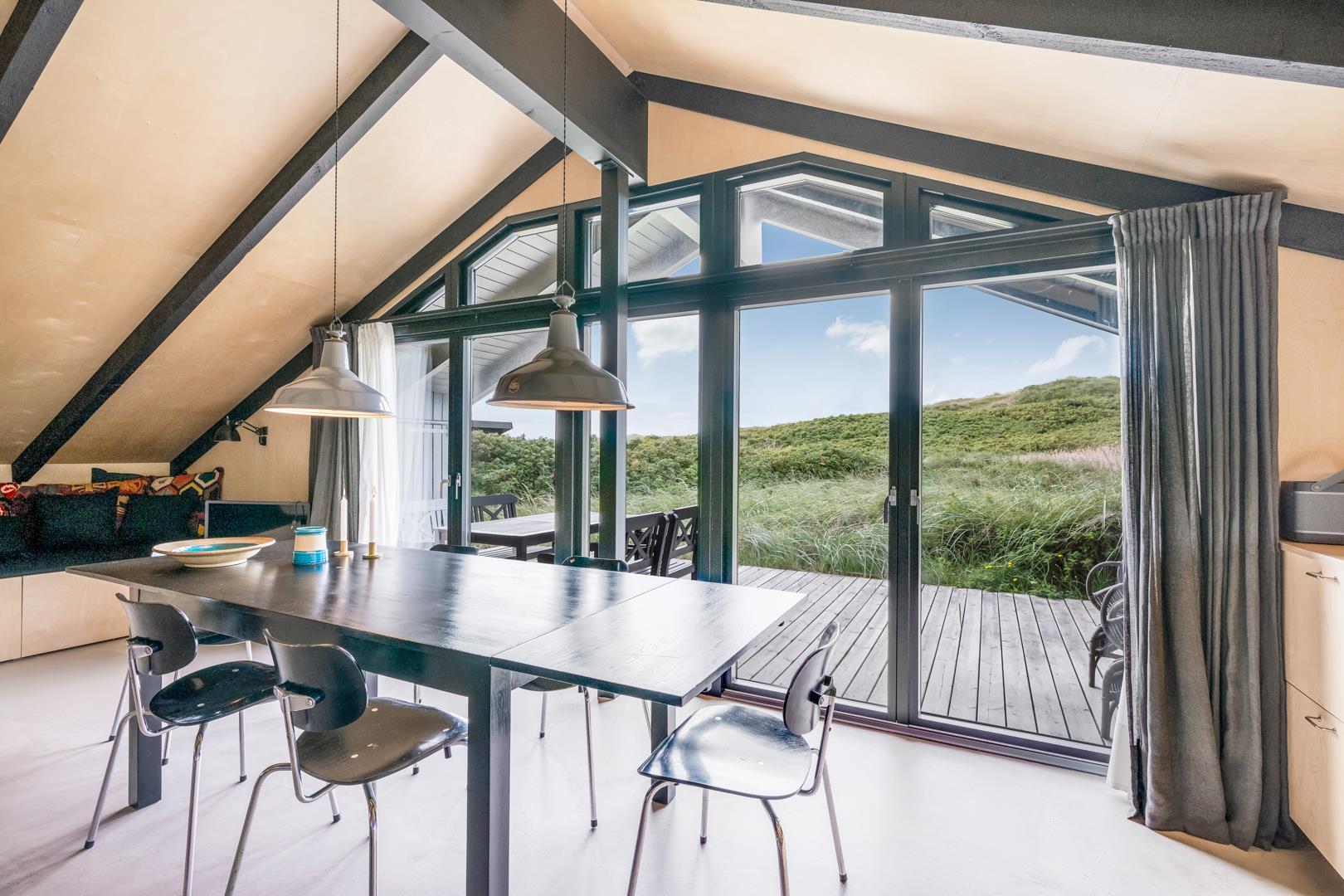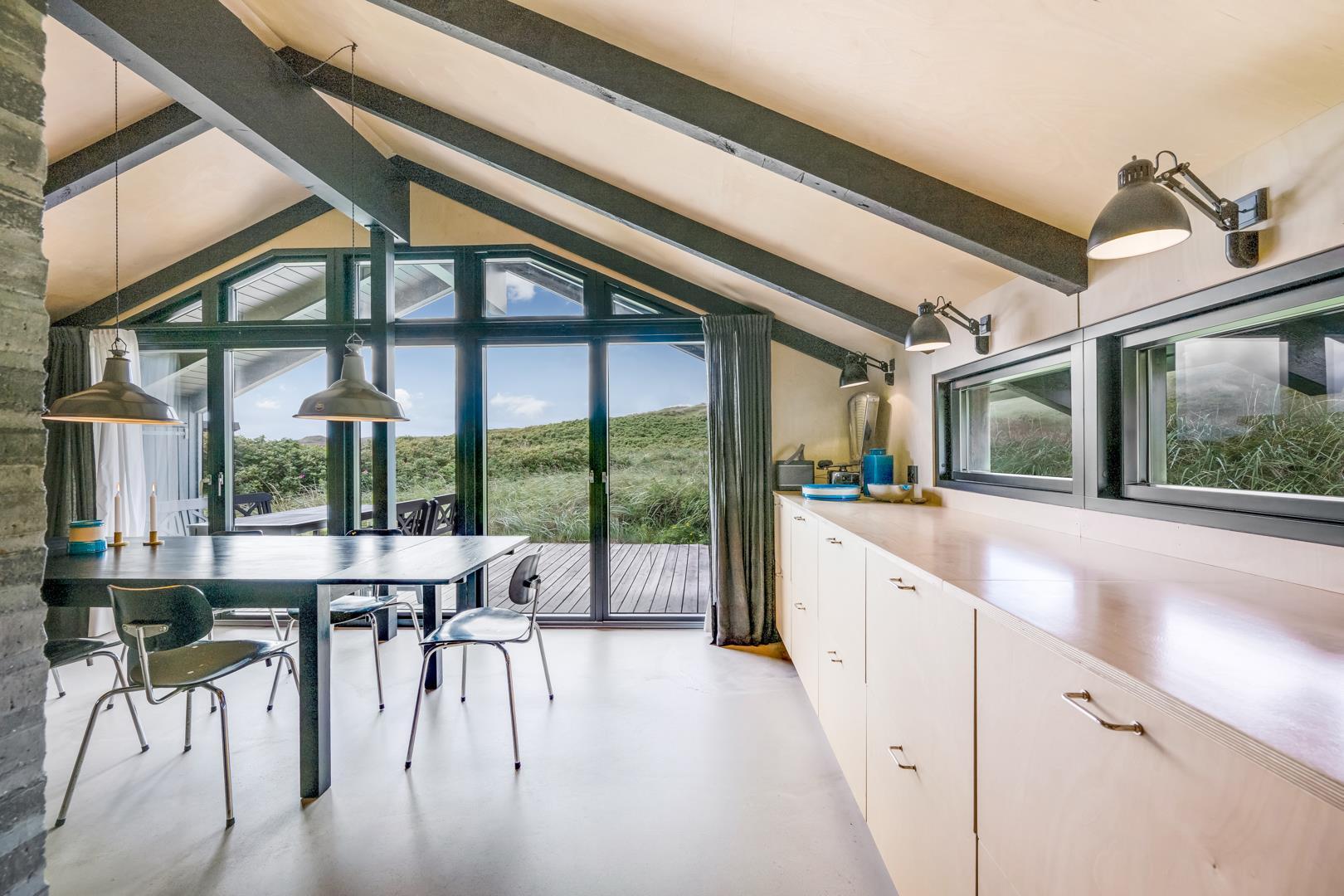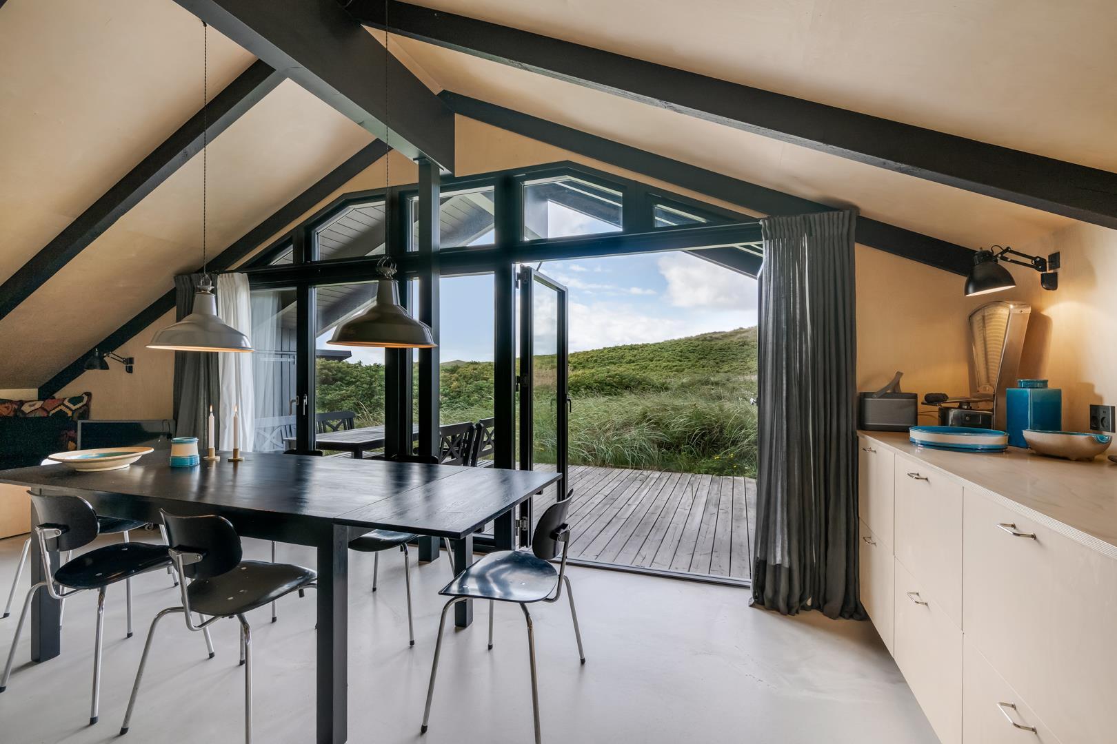 Den åbne stue med brændeovn og varmepumpe skaber en hyggelig atmosfære – ideelt for familier eller par, der søger et sommerhus ved Vesterhavet. Store vinduer og direkte adgang til vestterrassen lukker masser af lys og klitlandskab ind i rummet.