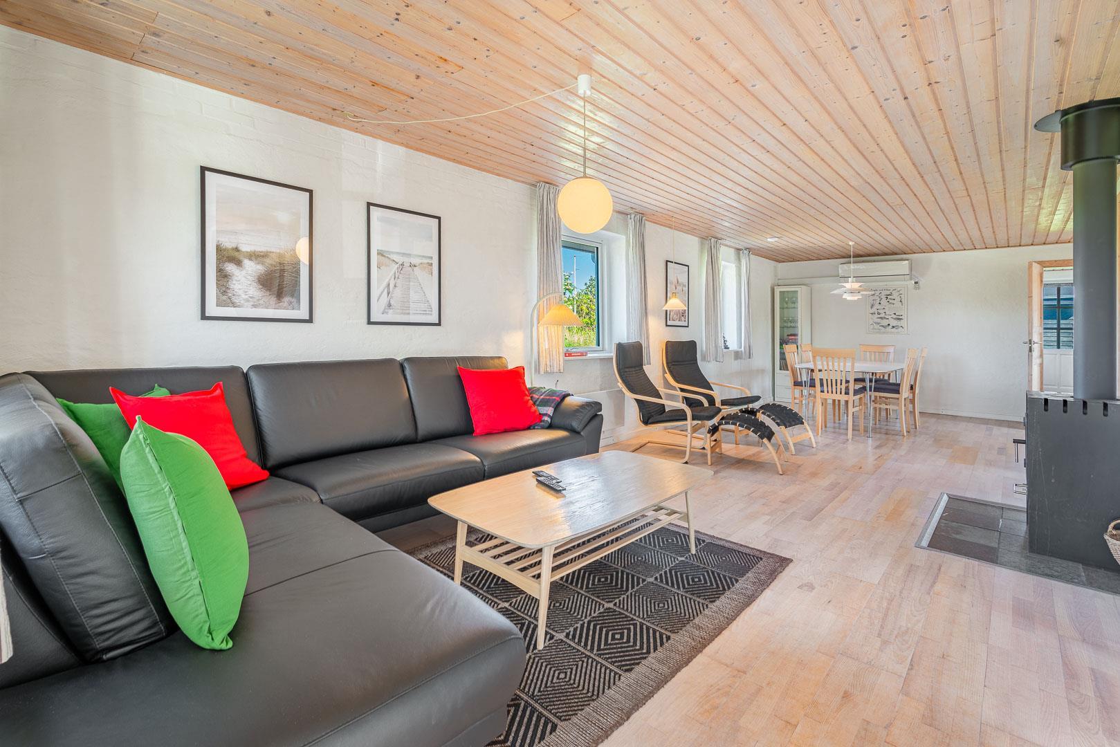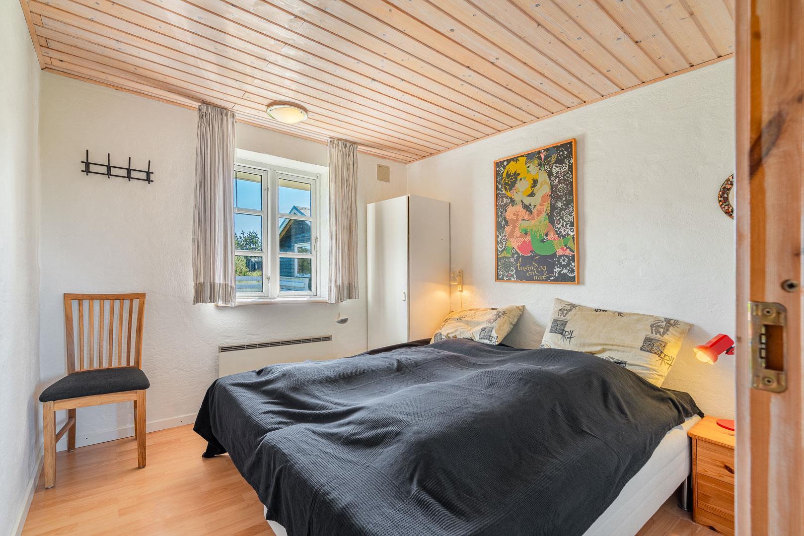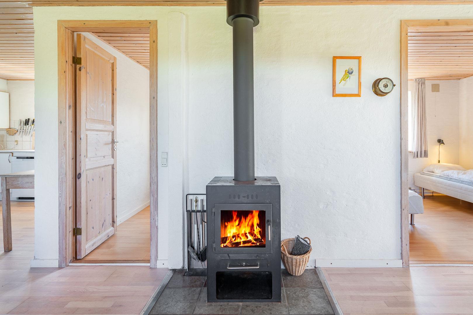 Når du træder ind i sommerhusets entré, har du adgang til et lyst soverum med en komfortabel dobbeltseng samt et badeværelse og et ekstra gæstetoilet. Fra entreen føres du videre ind i det indbydende køkken-alrum, som er designet med lyse trægulve og trælofter, hvilket skaber en varm og behagelig atmosfære. Stuen er rummelig og lys og fungerer som et skønt opholdsrum til hele familien. Her finder du en hyggelig brændeovn, der særligt vil være værdsat på kølige aftener og i vintermånederne, hvor den spreder en særlig varme og stemning i rummet.