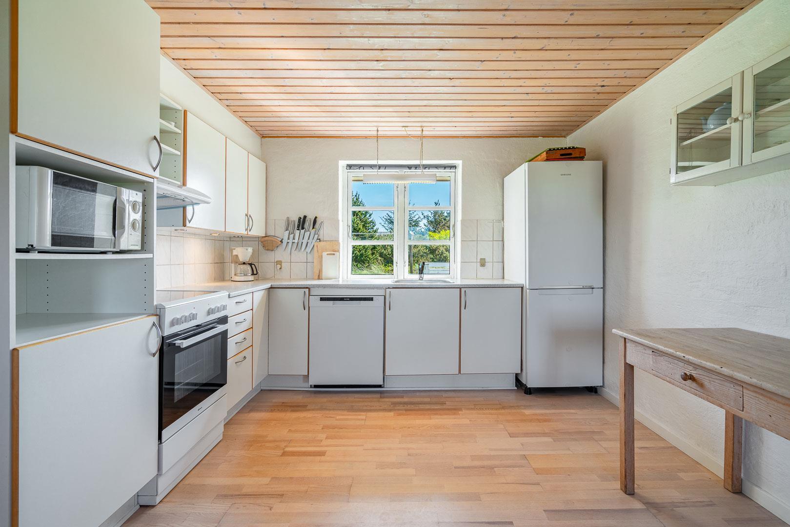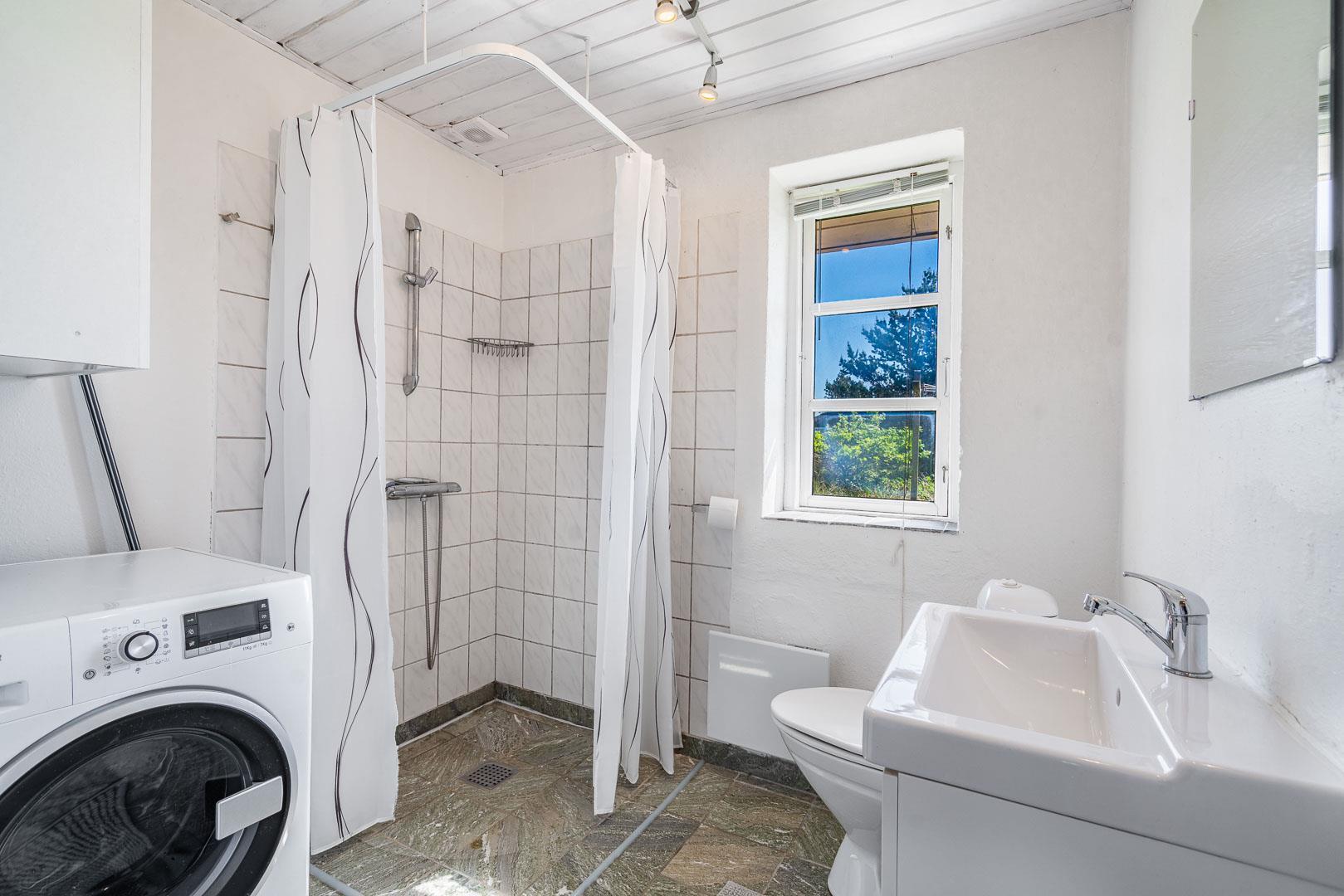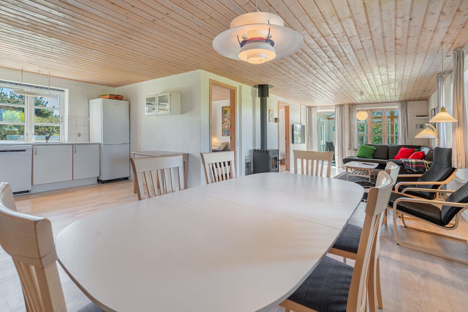 Når du træder ind i sommerhusets entré, har du adgang til et lyst soverum med en komfortabel dobbeltseng samt et badeværelse og et ekstra gæstetoilet. Fra entreen føres du videre ind i det indbydende køkken-alrum, som er designet med lyse trægulve og trælofter, hvilket skaber en varm og behagelig atmosfære. Stuen er rummelig og lys og fungerer som et skønt opholdsrum til hele familien. Her finder du en hyggelig brændeovn, der særligt vil være værdsat på kølige aftener og i vintermånederne, hvor den spreder en særlig varme og stemning i rummet.