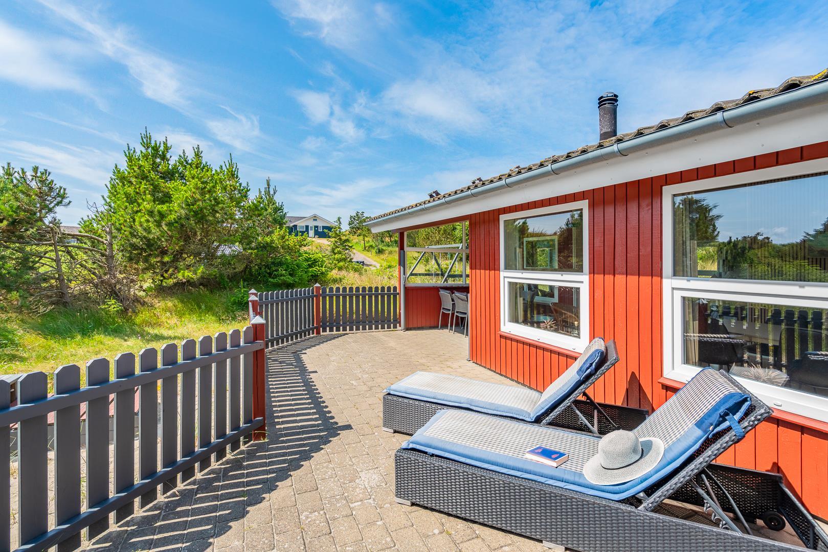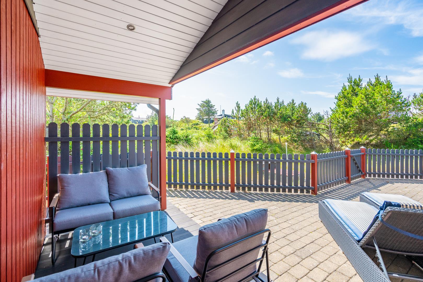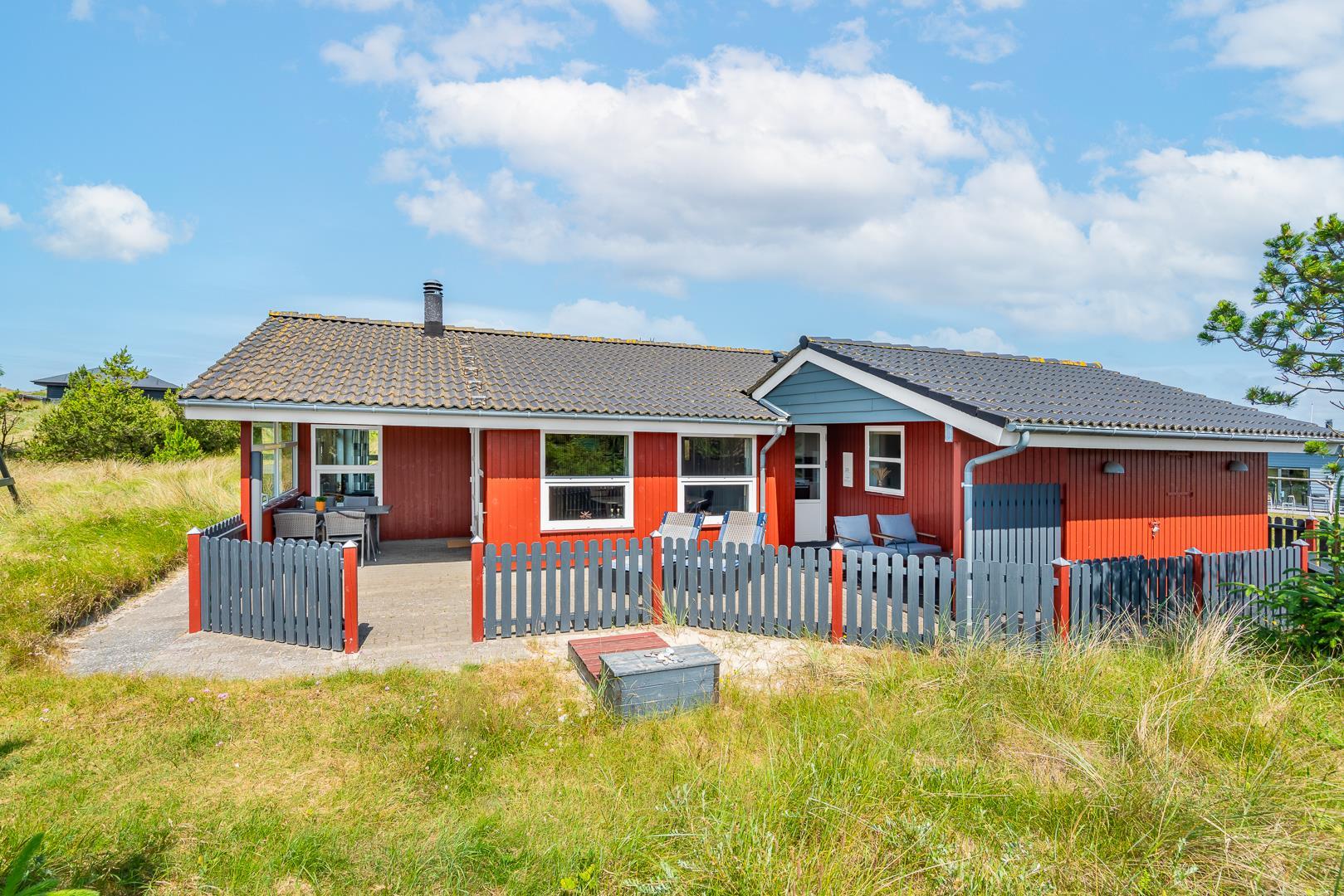 Hyggeligt feriehus på stor, ugeneret klitgrund tæt på Henne Strand med sauna og delvis overdækket terrasse.