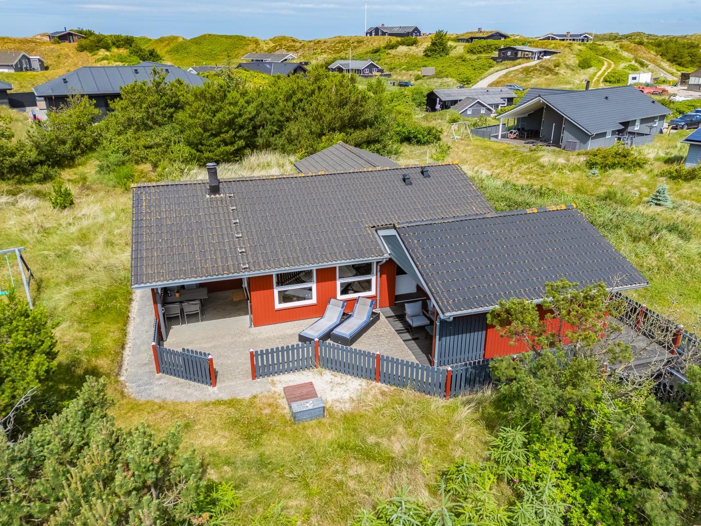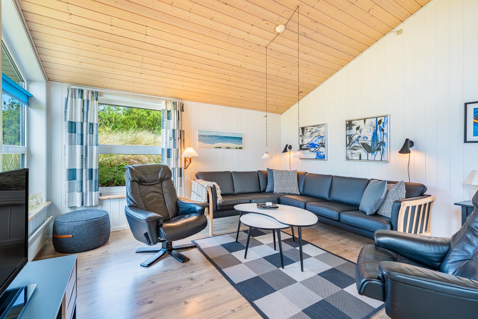 Dejligt feriehus beliggende på en pragtfuld ugeneret klitgrund med gåafstand til Henne Strand by. Feriehuset er indrettet mede indgangsparti med plads til sko og overtøj. Flot køkken i åben forbindelse til stor spiseafdeling. Herfra udgang til delvis overdækket terrasse. Flot badeværelse med gulvvarme og adgang til sauna. Ekstra toilet og håndvask. Flot møbleret stue. 3 gode og rummelige soverum. Mellemgang med værelser og udgang til syd/vest vendt terrasse.