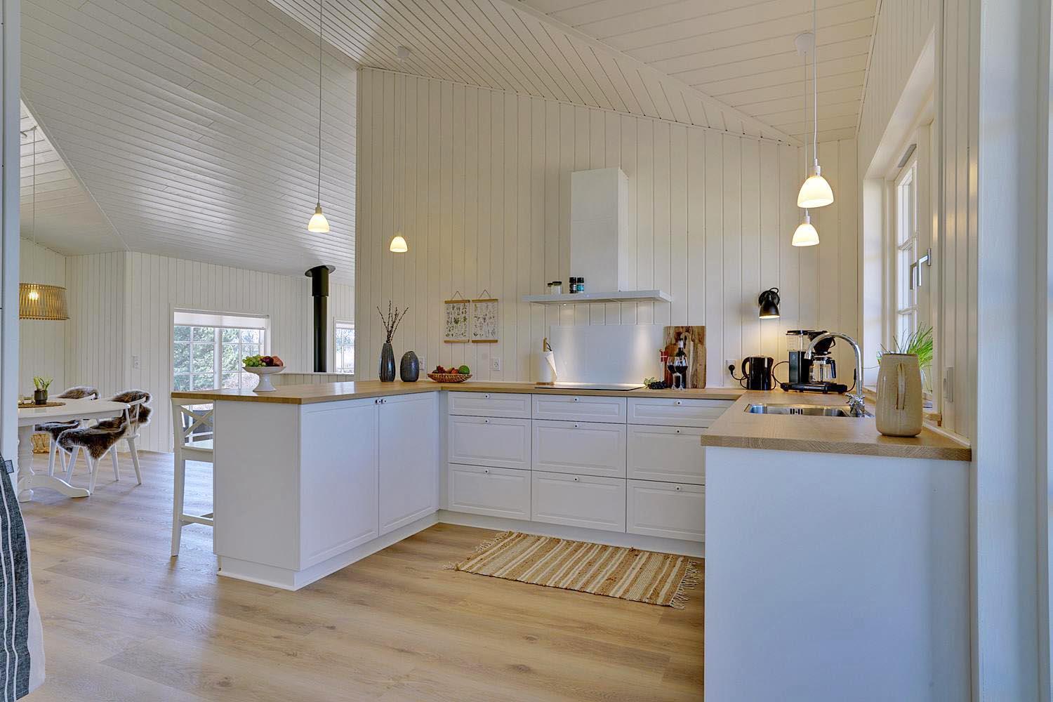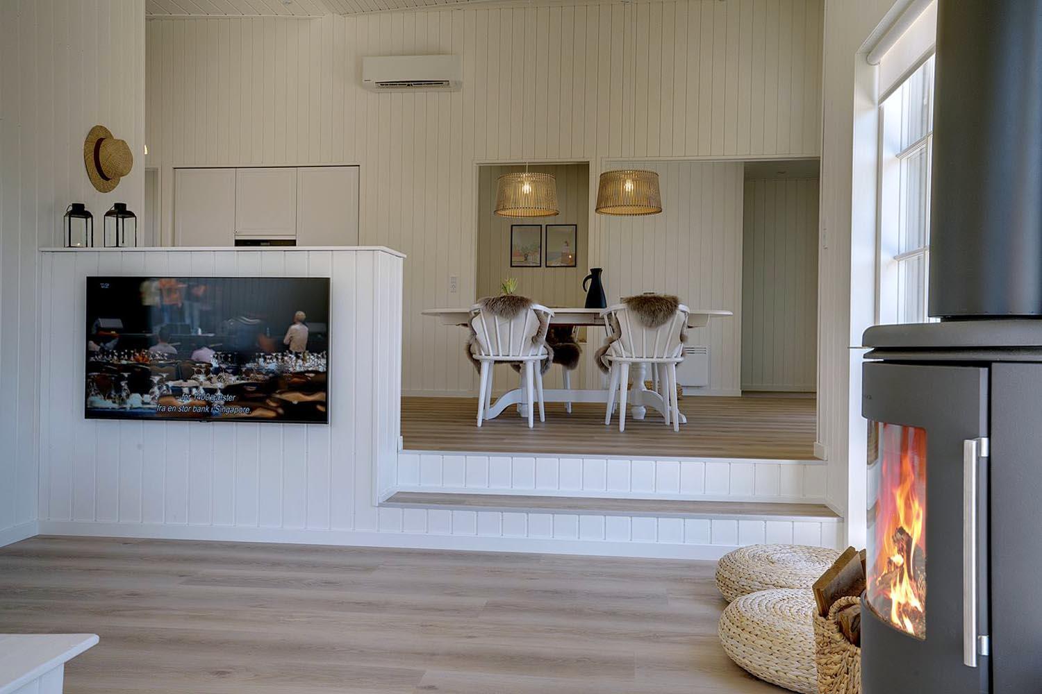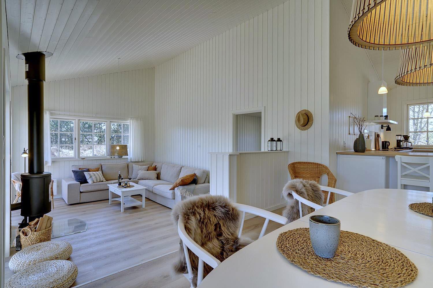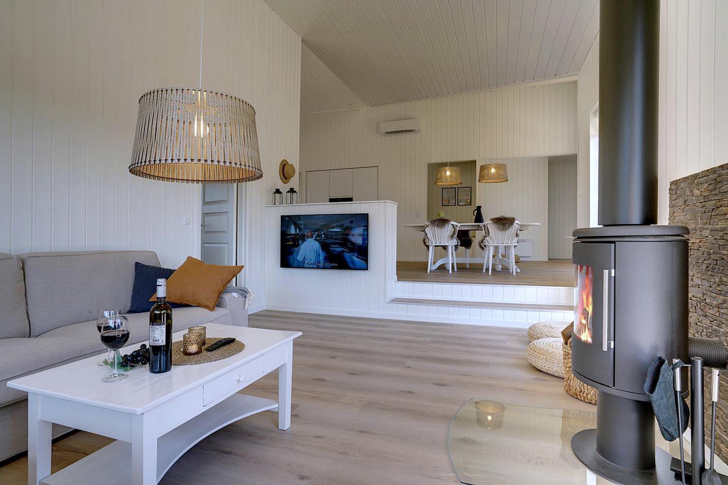 I det store opholdsrum kan I nyde hyggelige aftener foran brændeovnen, som skaber en varm og afslappet stemning. Det åbne køkken er moderne og fuldt udstyret – her er alt, hvad I behøver til fælles madlavning og hyggelige måltider.