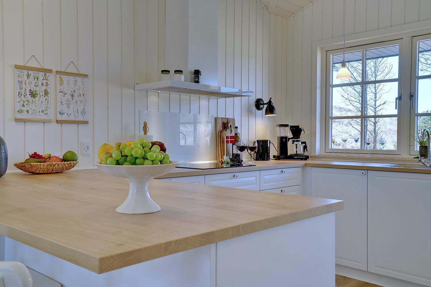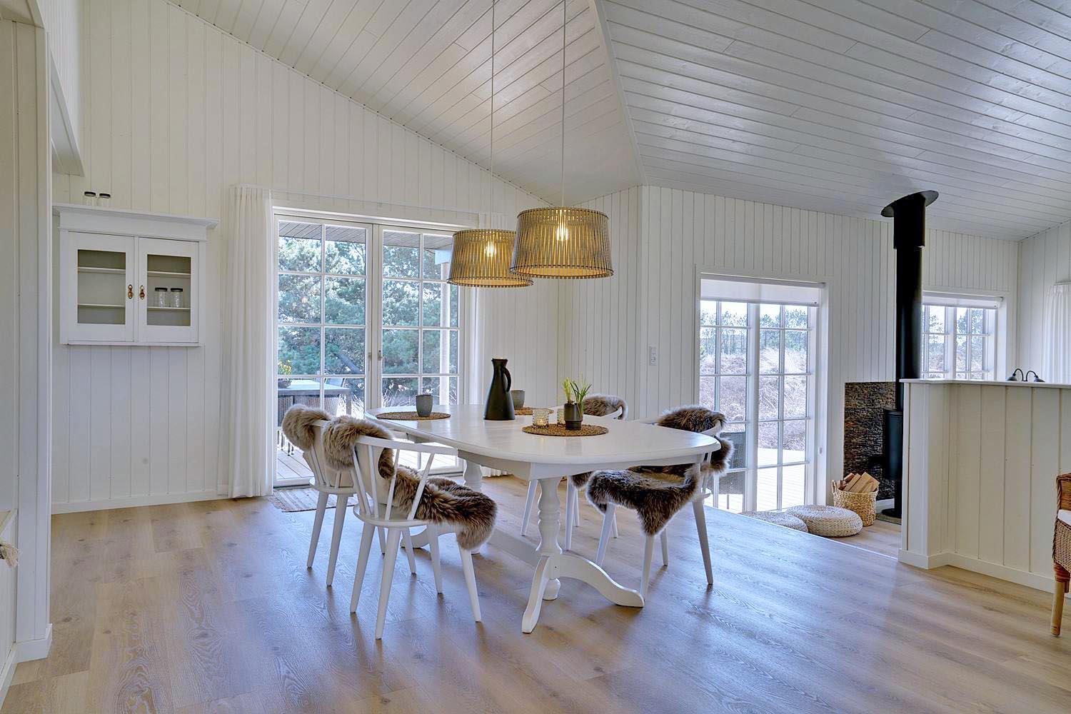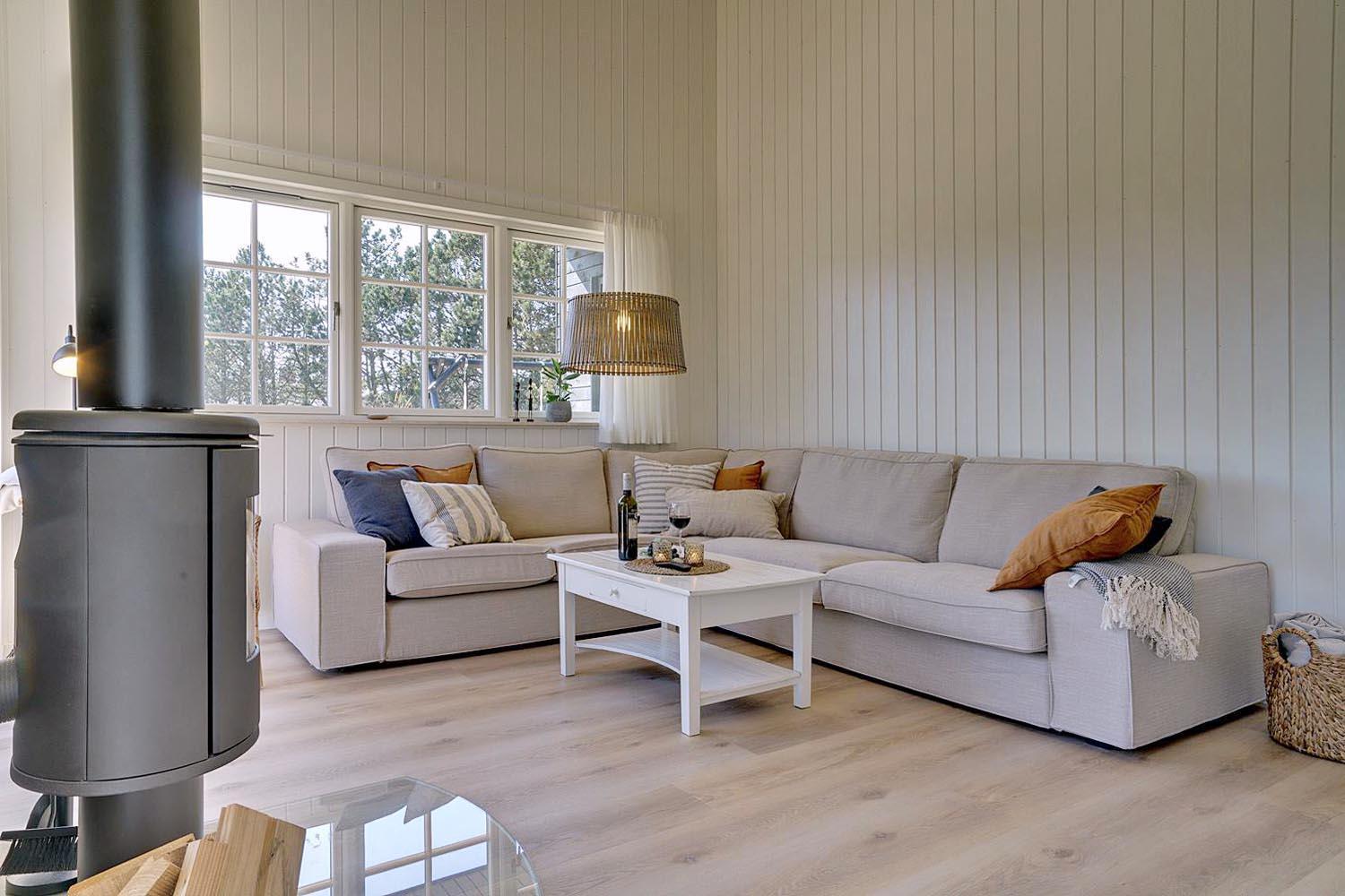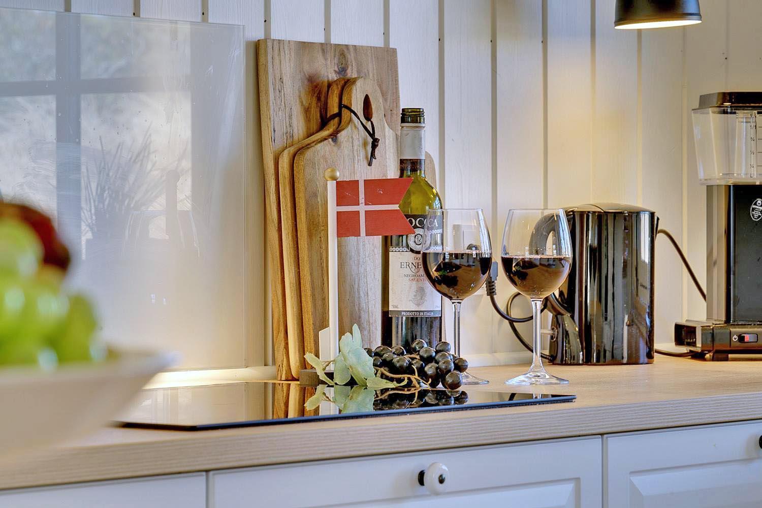 I det store opholdsrum kan I nyde hyggelige aftener foran brændeovnen, som skaber en varm og afslappet stemning. Det åbne køkken er moderne og fuldt udstyret – her er alt, hvad I behøver til fælles madlavning og hyggelige måltider.