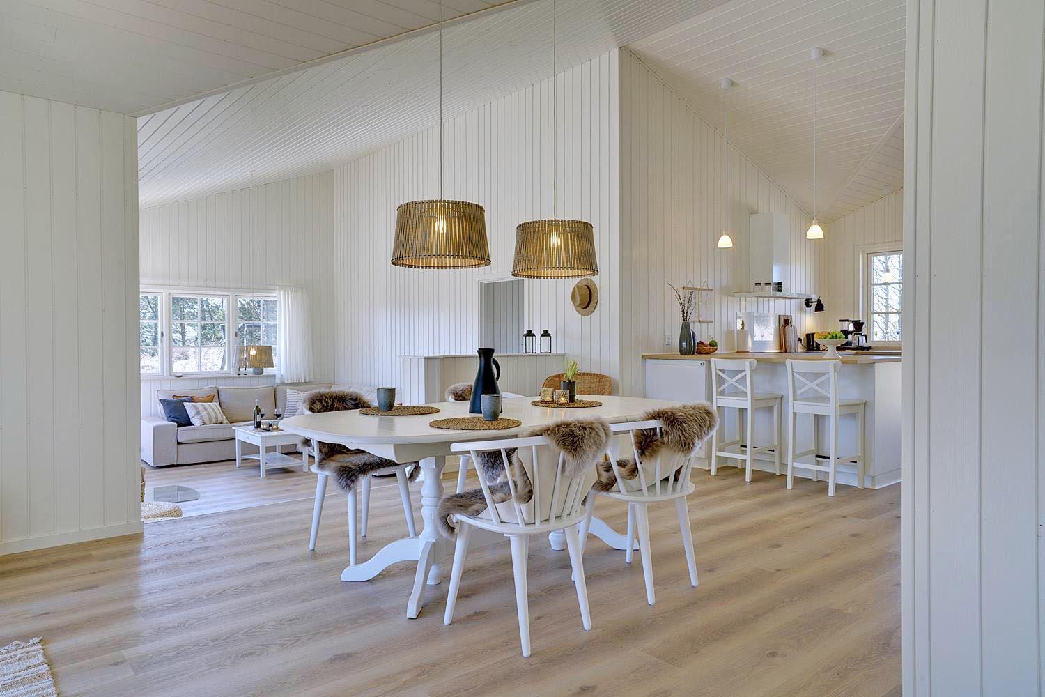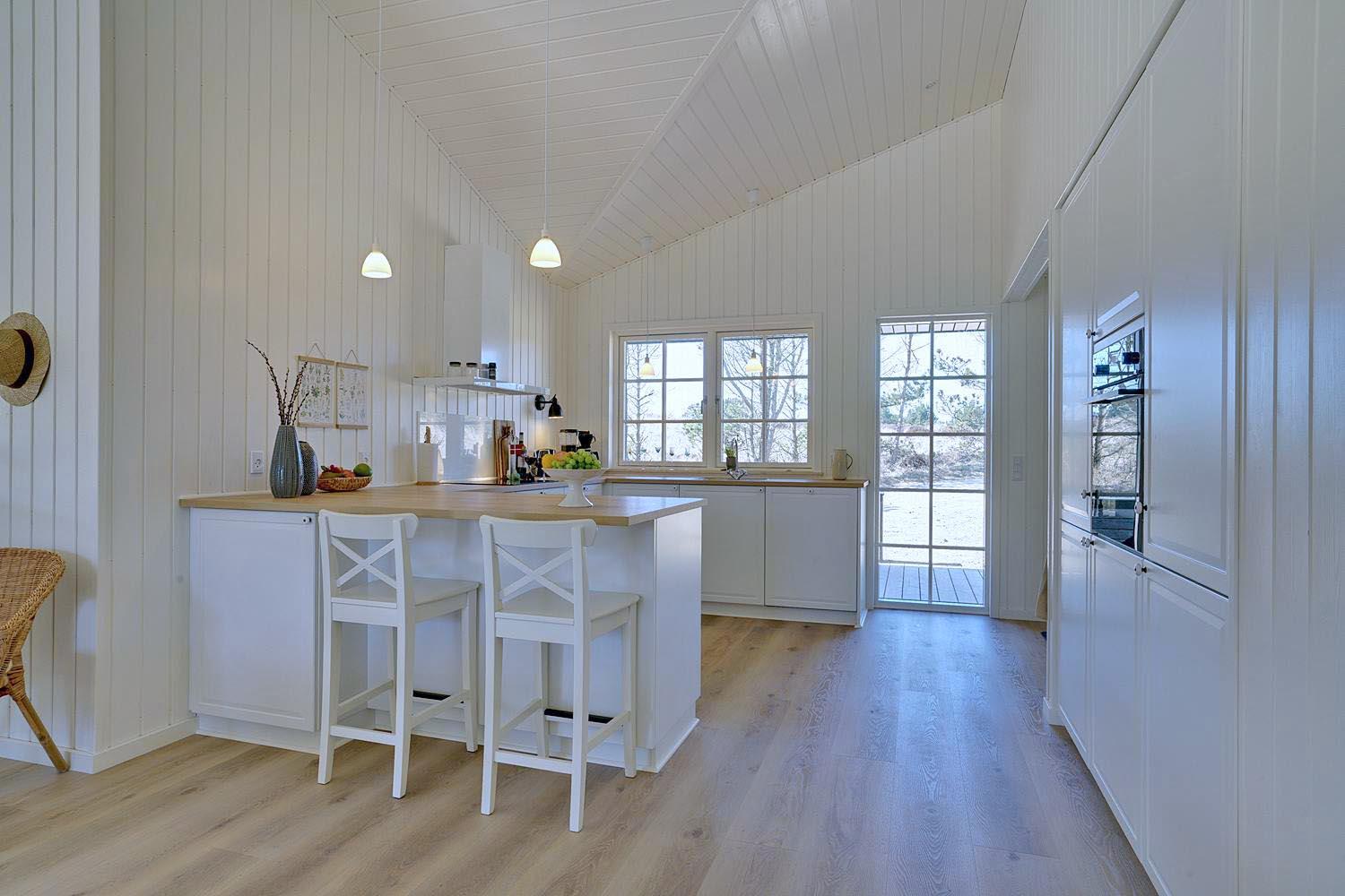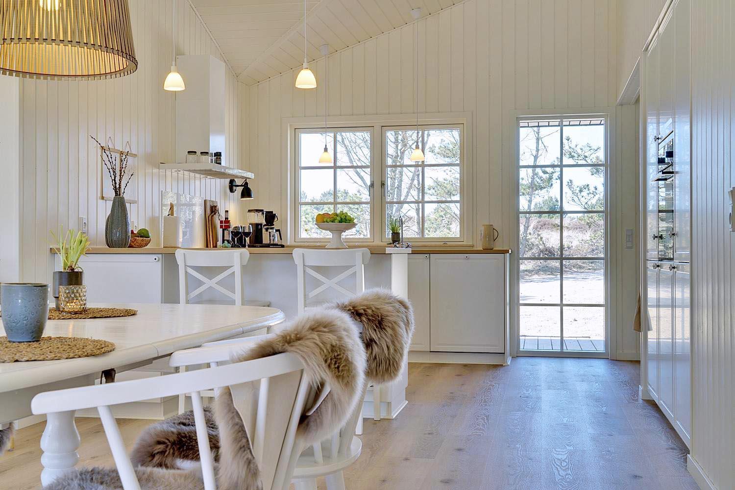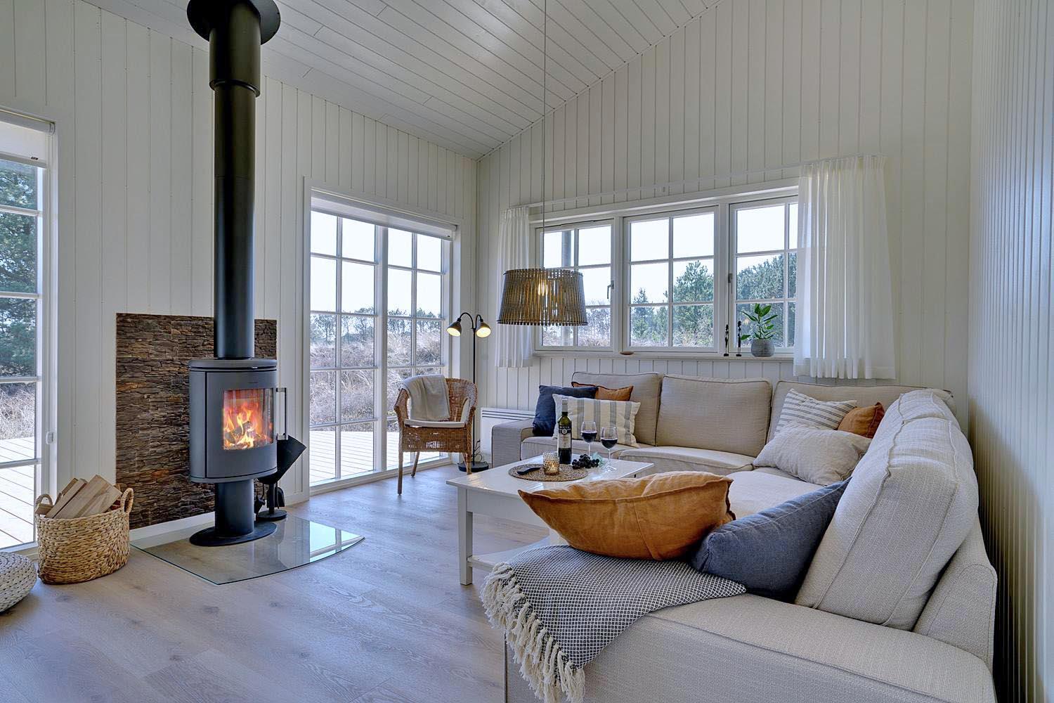 I det store opholdsrum kan I nyde hyggelige aftener foran brændeovnen, som skaber en varm og afslappet stemning. Det åbne køkken er moderne og fuldt udstyret – her er alt, hvad I behøver til fælles madlavning og hyggelige måltider.