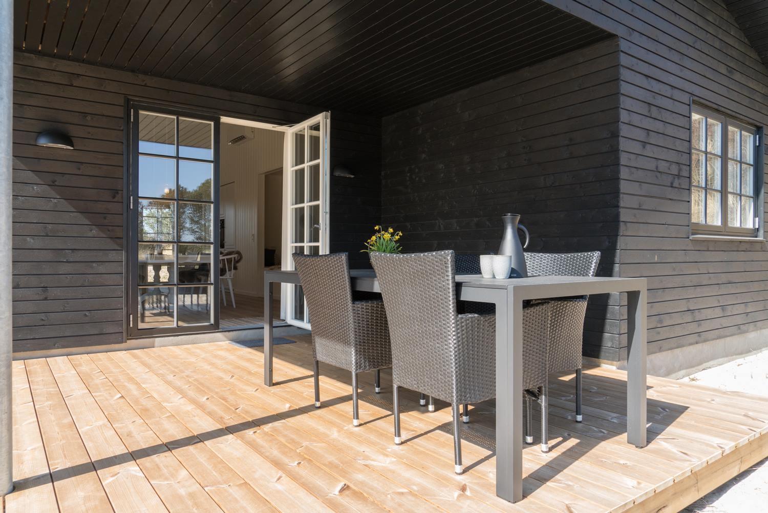 På den store grund er der både gynge og sandkasse – perfekt til familiens yngste. Den overdækkede terrasse giver mulighed for at nyde hyggelige aftener udendørs, uanset vejret.