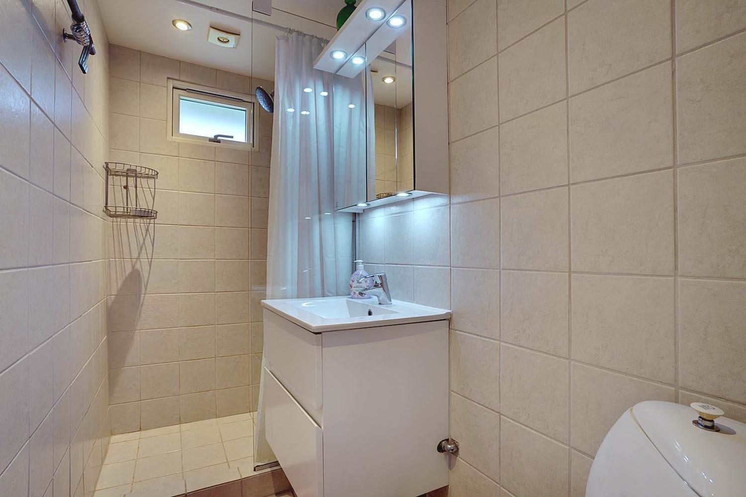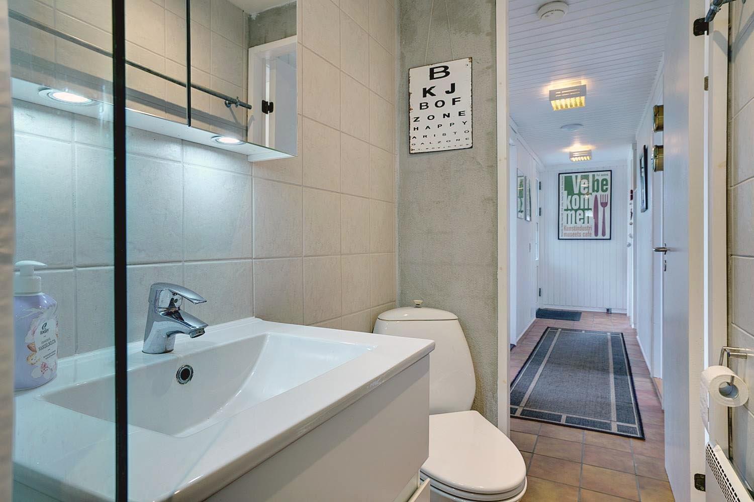 Badeværelset er praktisk og funktionelt indrettet med alt, hvad man har brug for til daglig.