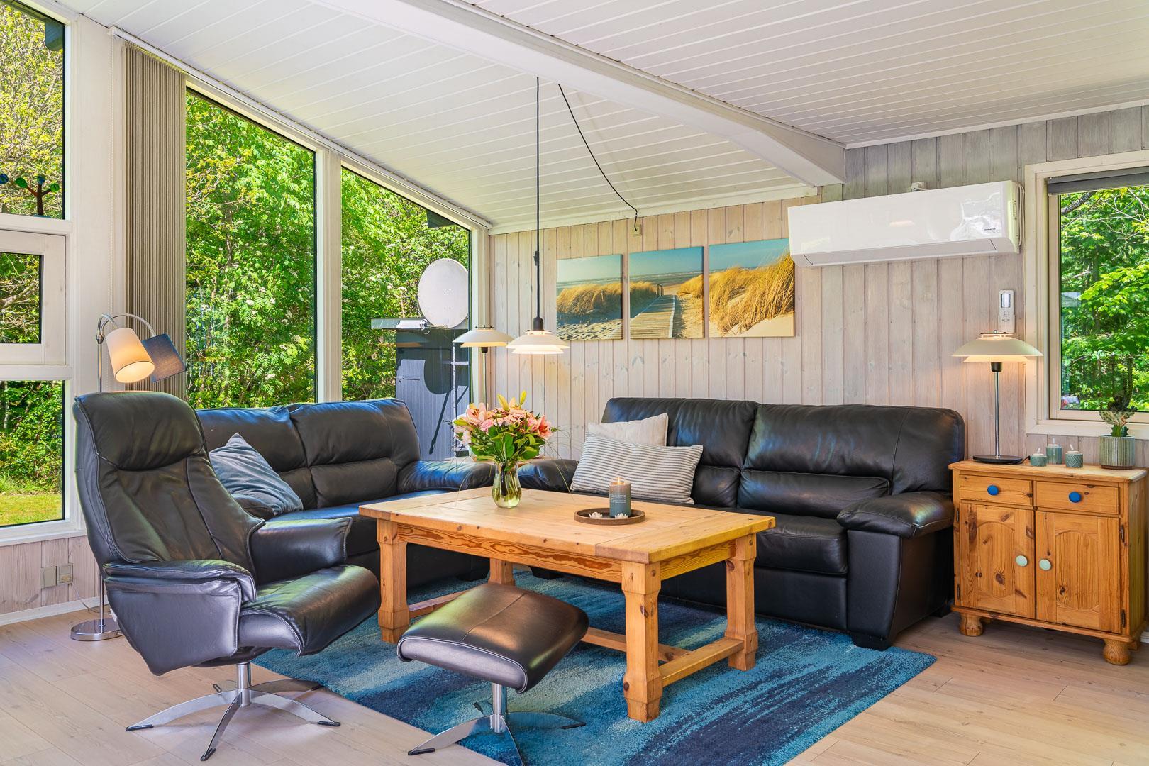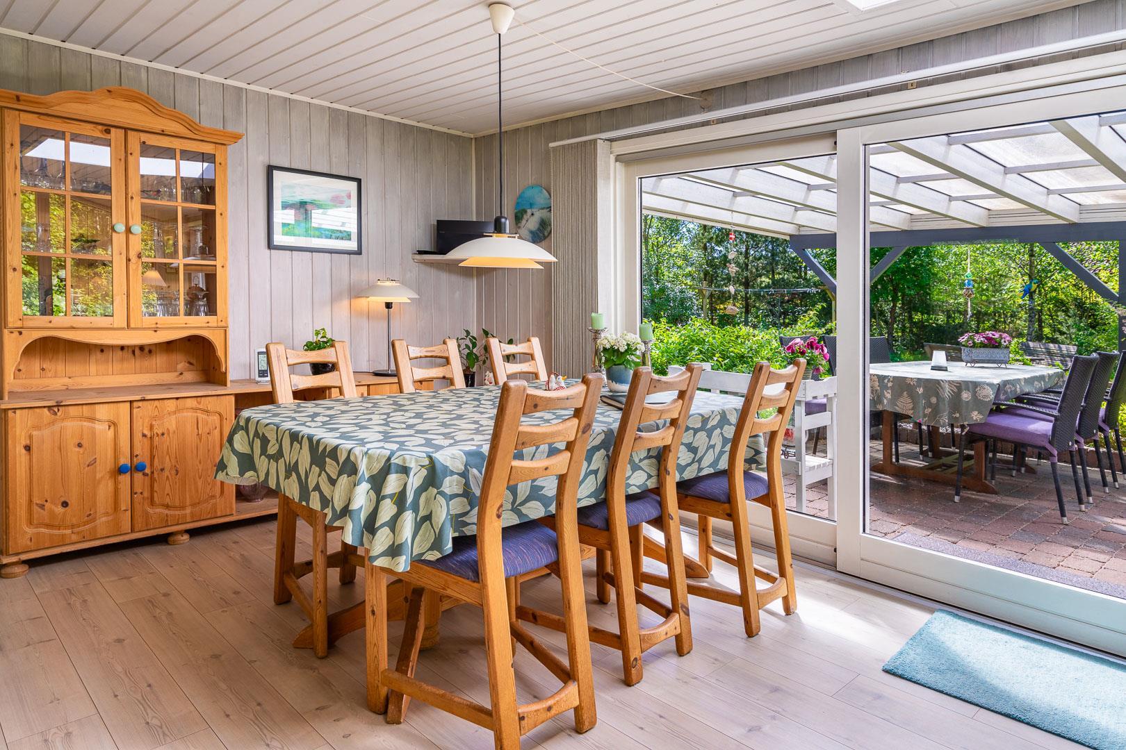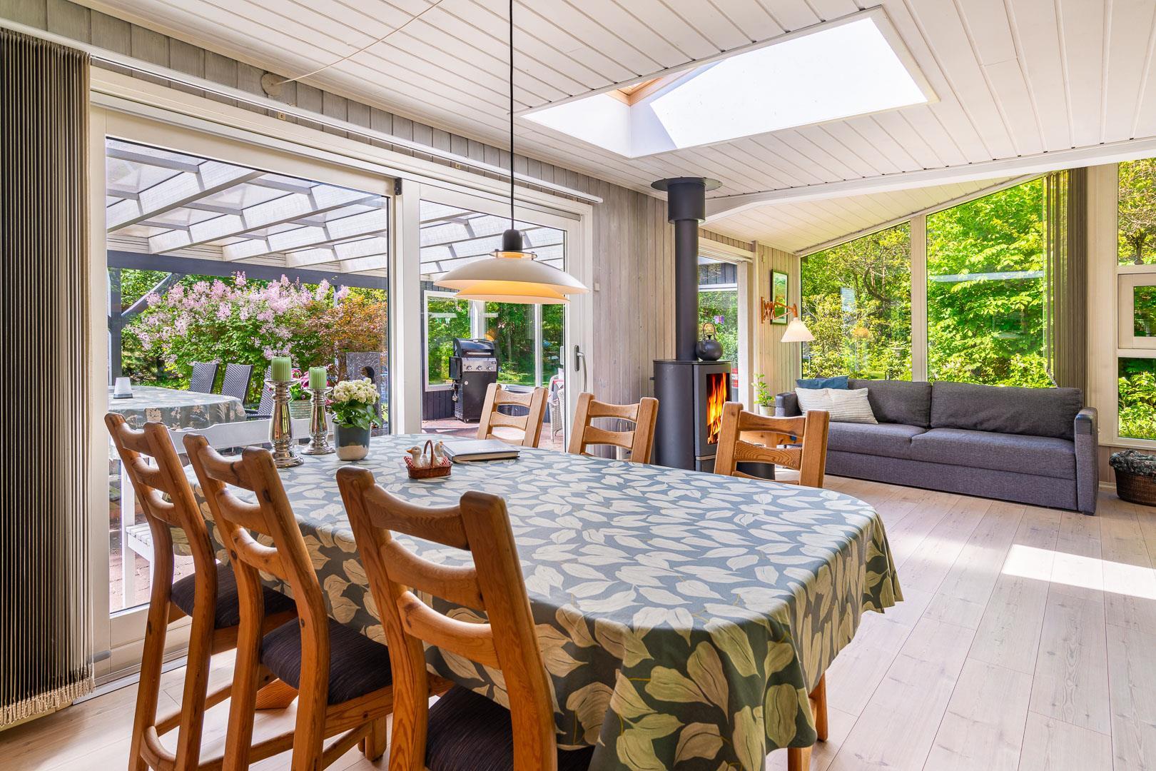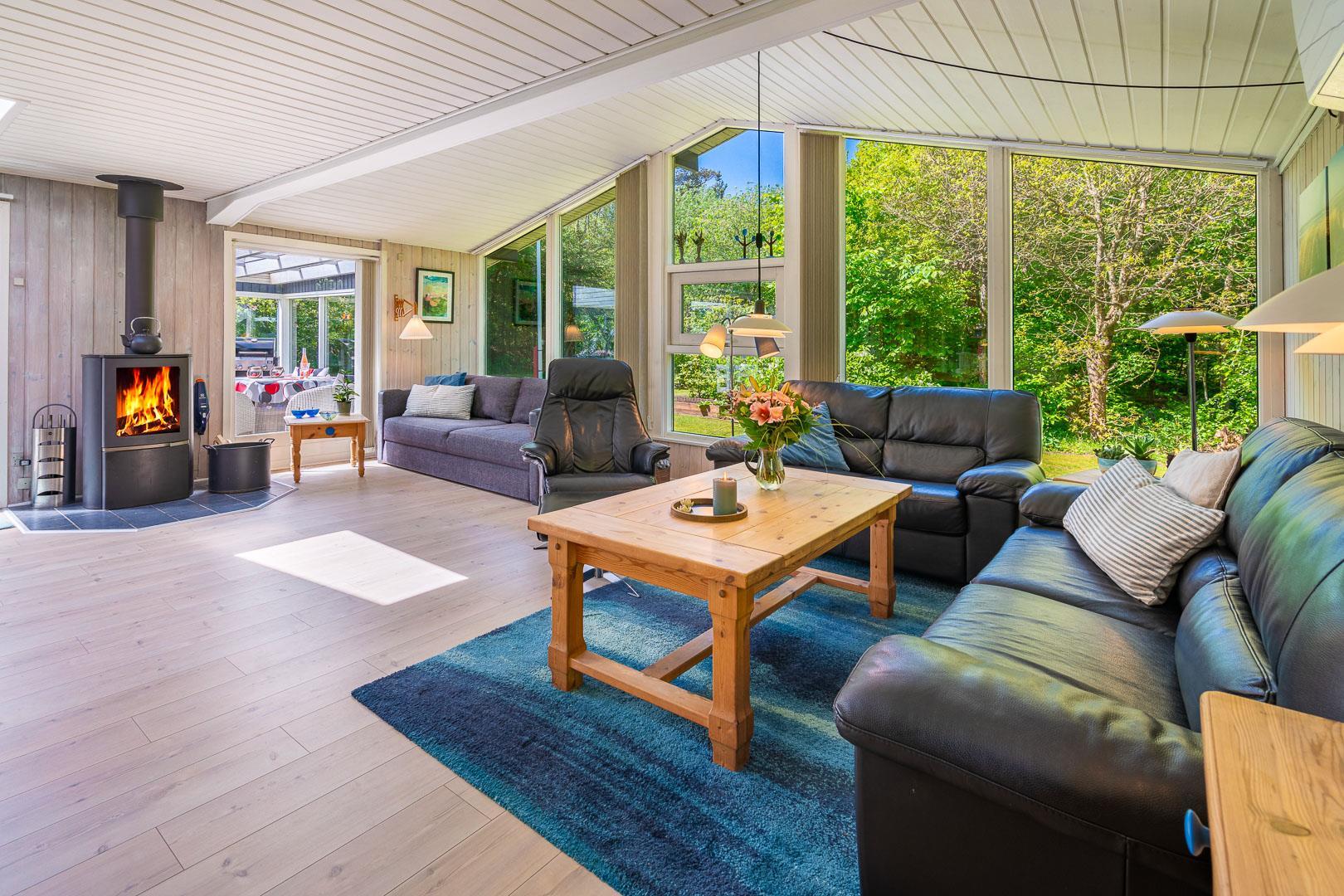 Træd ind i den rummelige og lyse stue, der smelter sammen med spisestuen og det veludstyrede køkken. Centralt placeret finder du en hyggelig brændeovn og en praktisk varmepumpe, der sikrer behagelige temperaturer uanset årstid. Fra stuen er der udgang til en særdeles skøn og overdækket terrasse, hvor du kan slappe af og nyde den betagende udsigt over den smukke naturgrund.