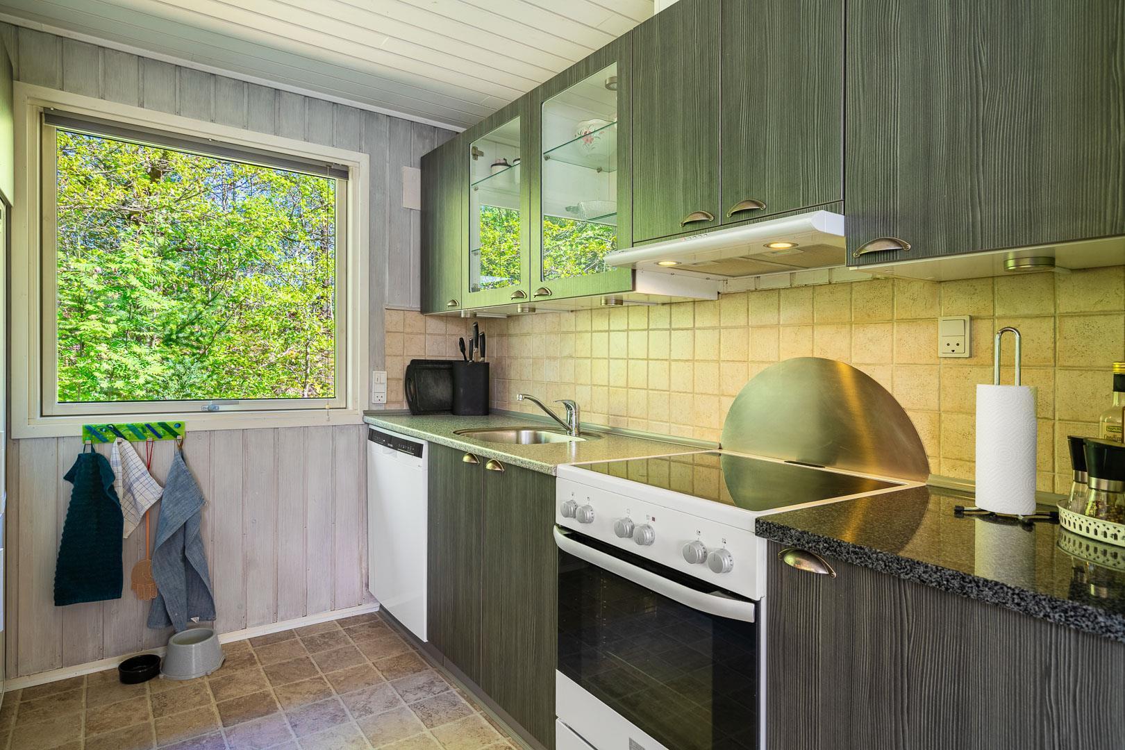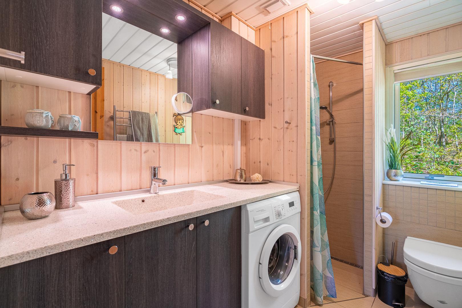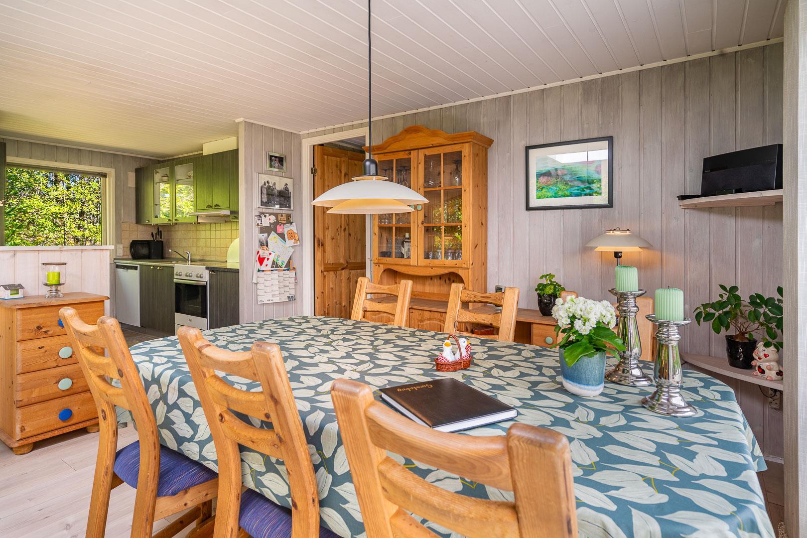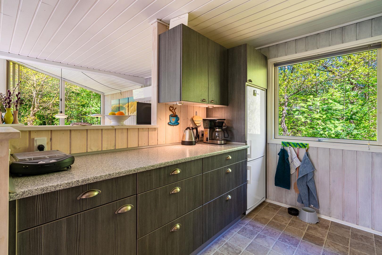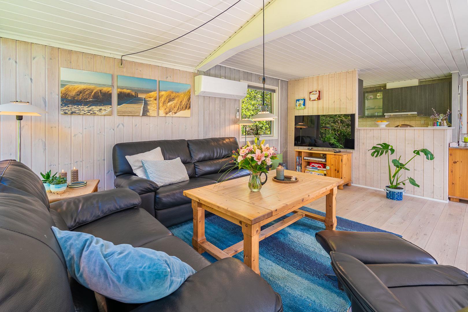 Træd ind i den rummelige og lyse stue, der smelter sammen med spisestuen og det veludstyrede køkken. Centralt placeret finder du en hyggelig brændeovn og en praktisk varmepumpe, der sikrer behagelige temperaturer uanset årstid. Fra stuen er der udgang til en særdeles skøn og overdækket terrasse, hvor du kan slappe af og nyde den betagende udsigt over den smukke naturgrund.