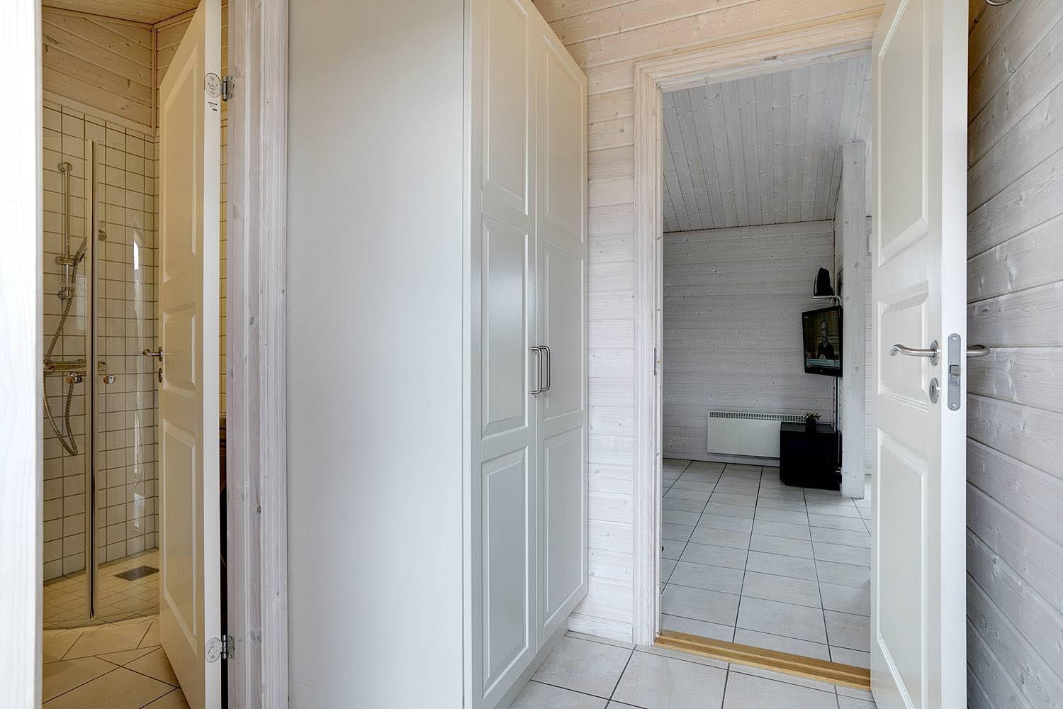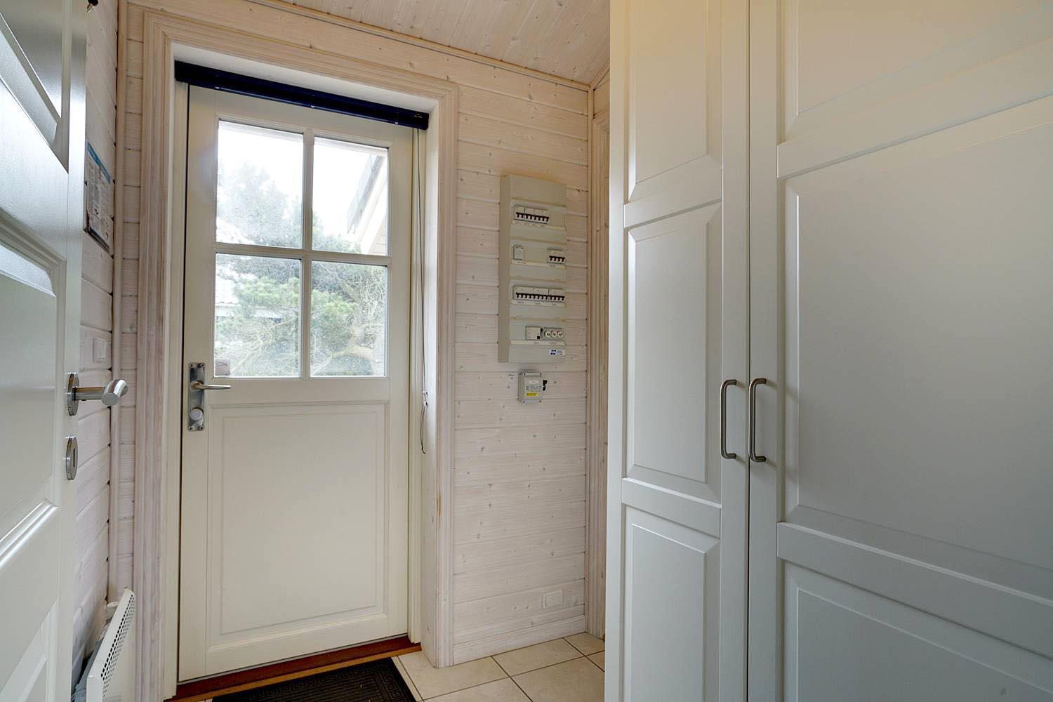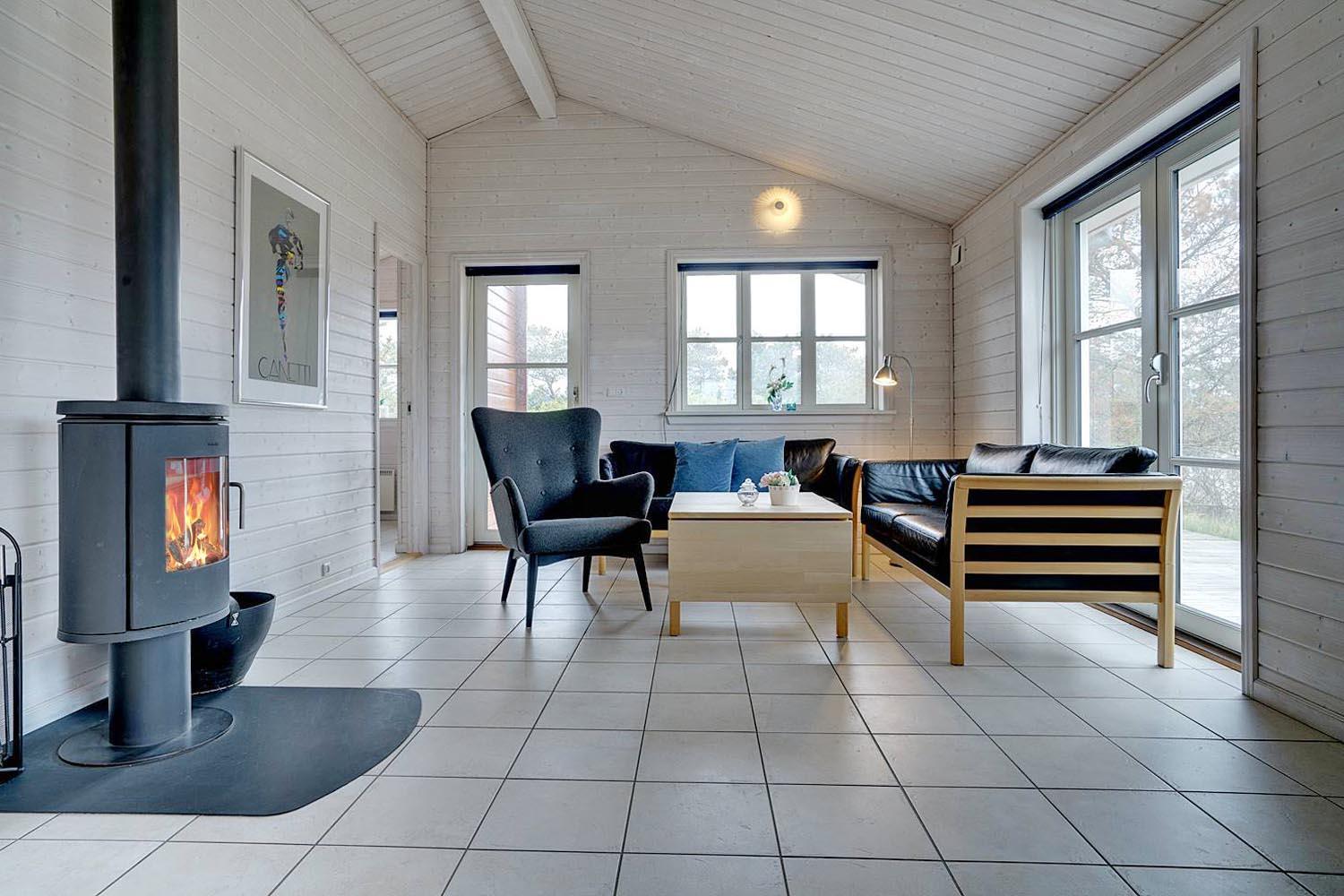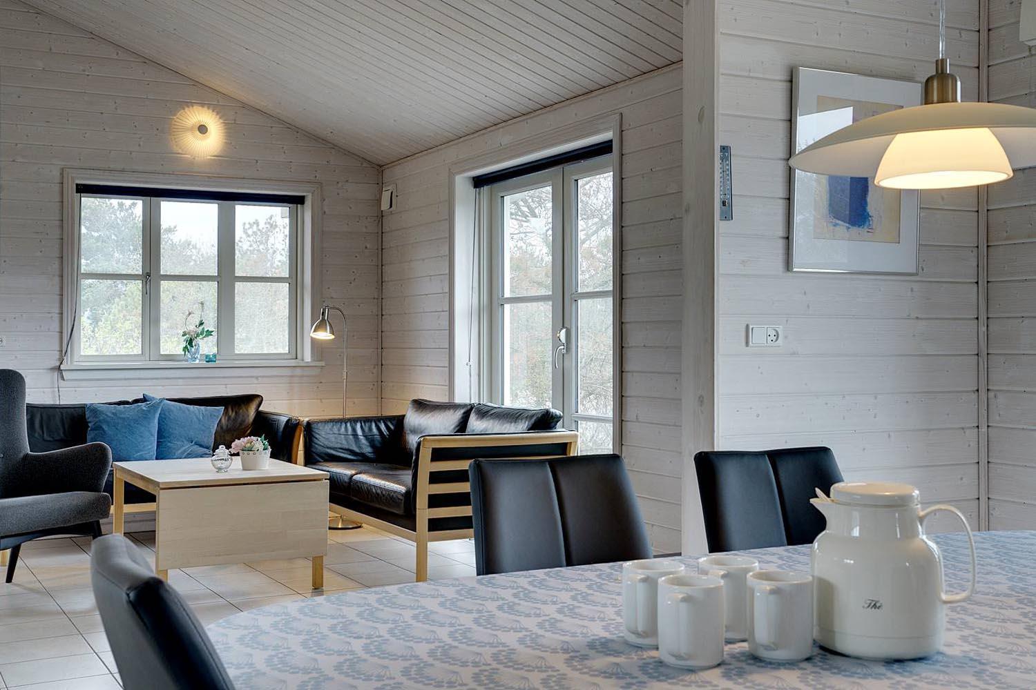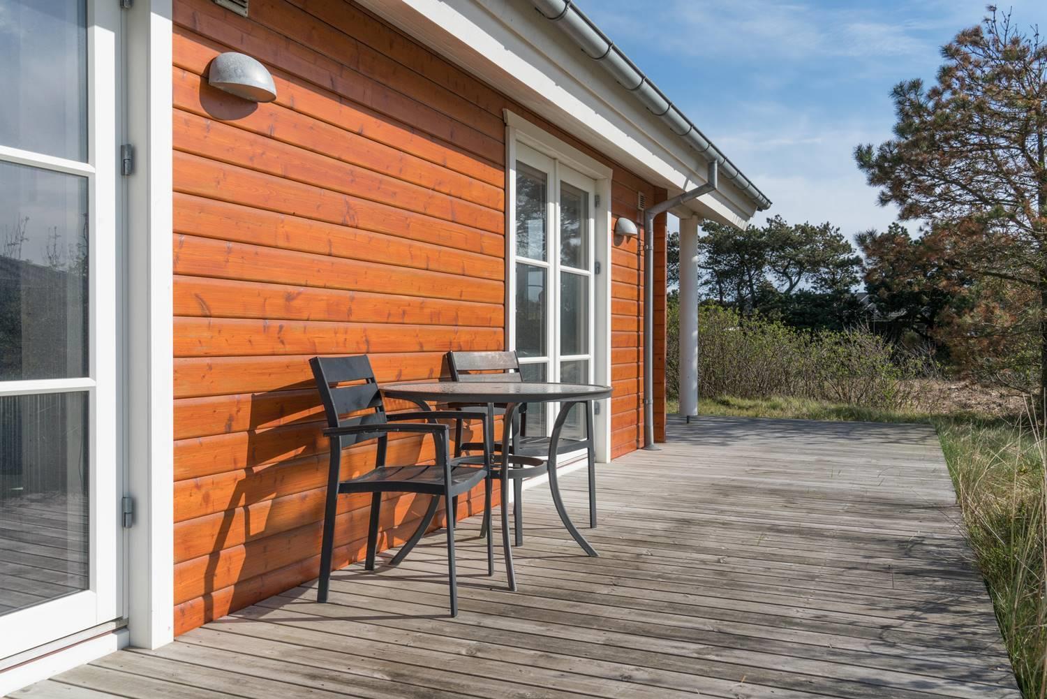 Herfra er der udgang til en dejlig lille træterrasse, hvor solen stråler og naturens lyde omgiver dig – et perfekt spot til at nyde en god bog eller slappe af med en dejlig kop kaffe. Sommerhuset er højisoleret og indrettet med lækre møbler, så du kan nyde komforten og roen i din ferie.