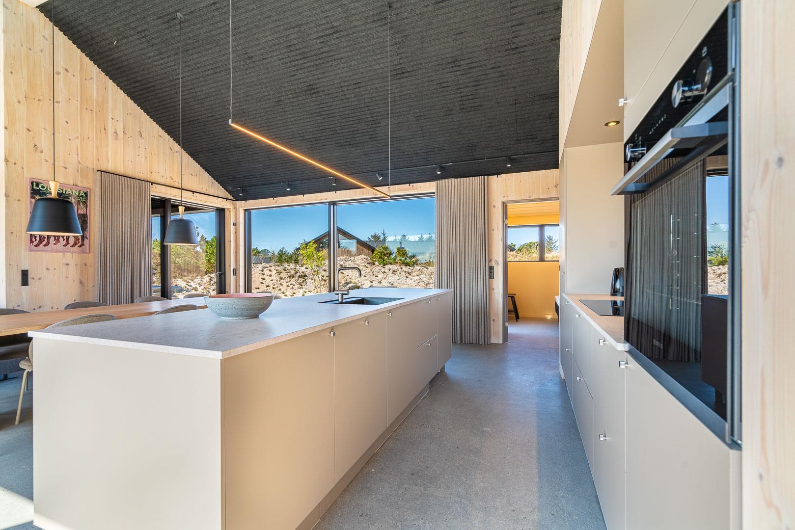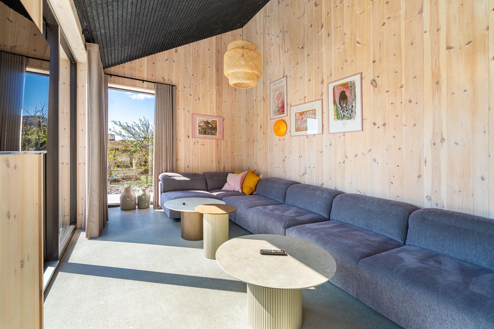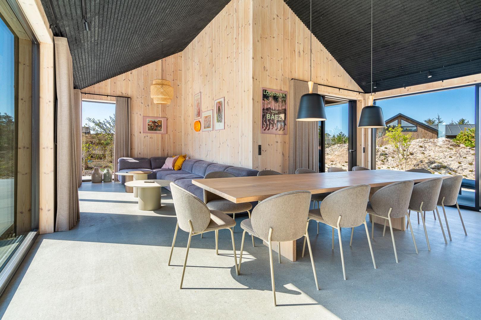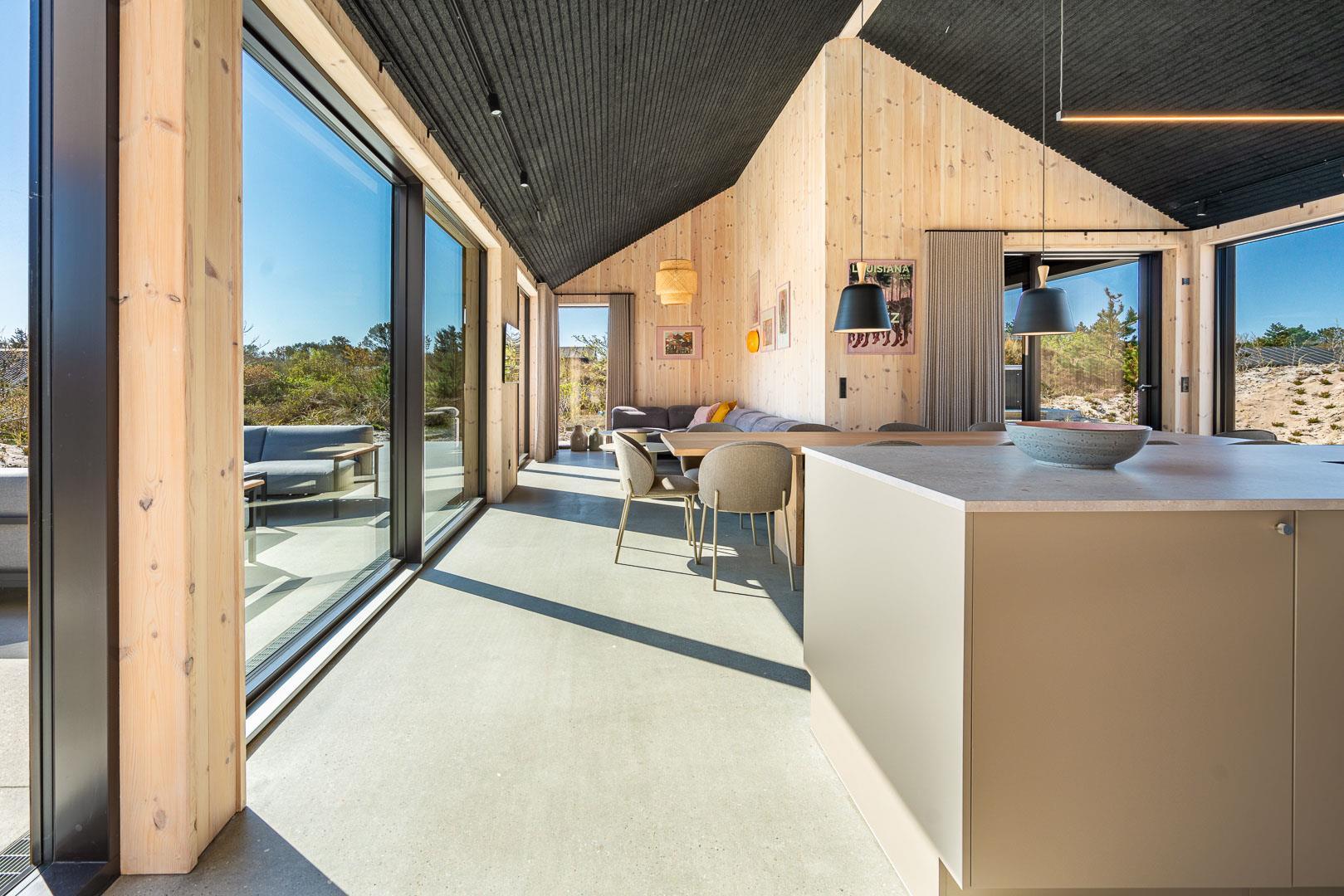 Sommerhuset har store vinduespartier, der giver masser af dagslys og forbinder stue, køkken og spiseafdeling i ét åbent og hyggeligt rum. Her kan I samles om madlavning, brætspil eller en rolig stund foran brændeovnen.