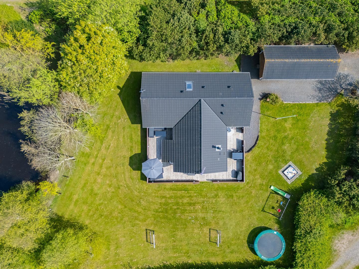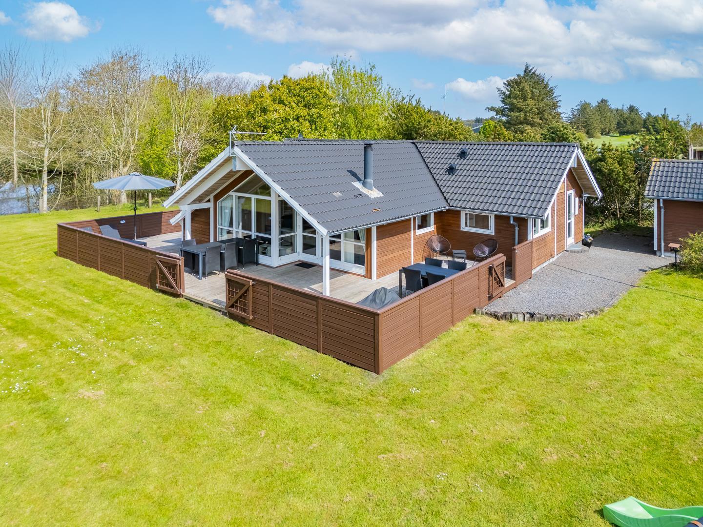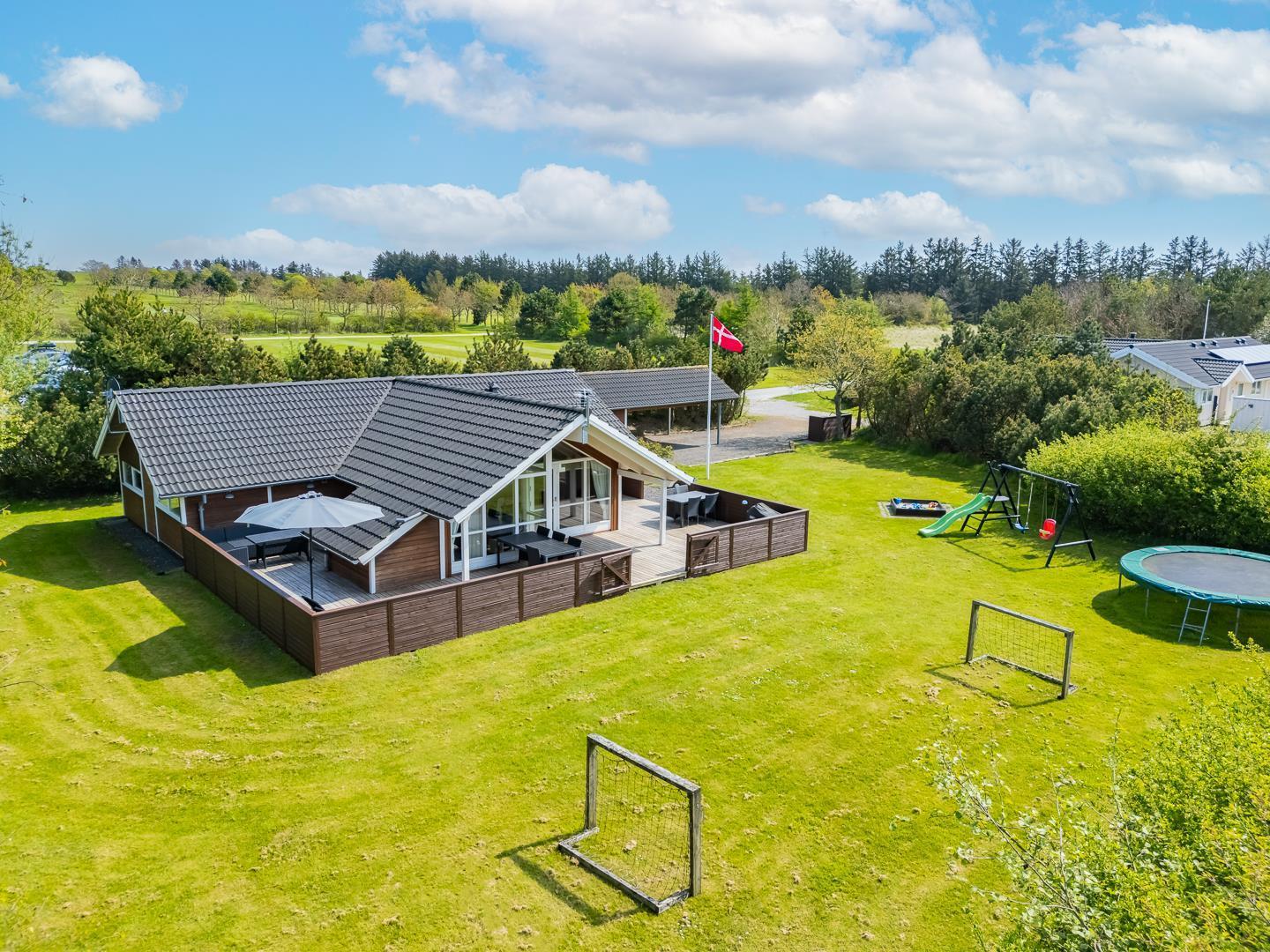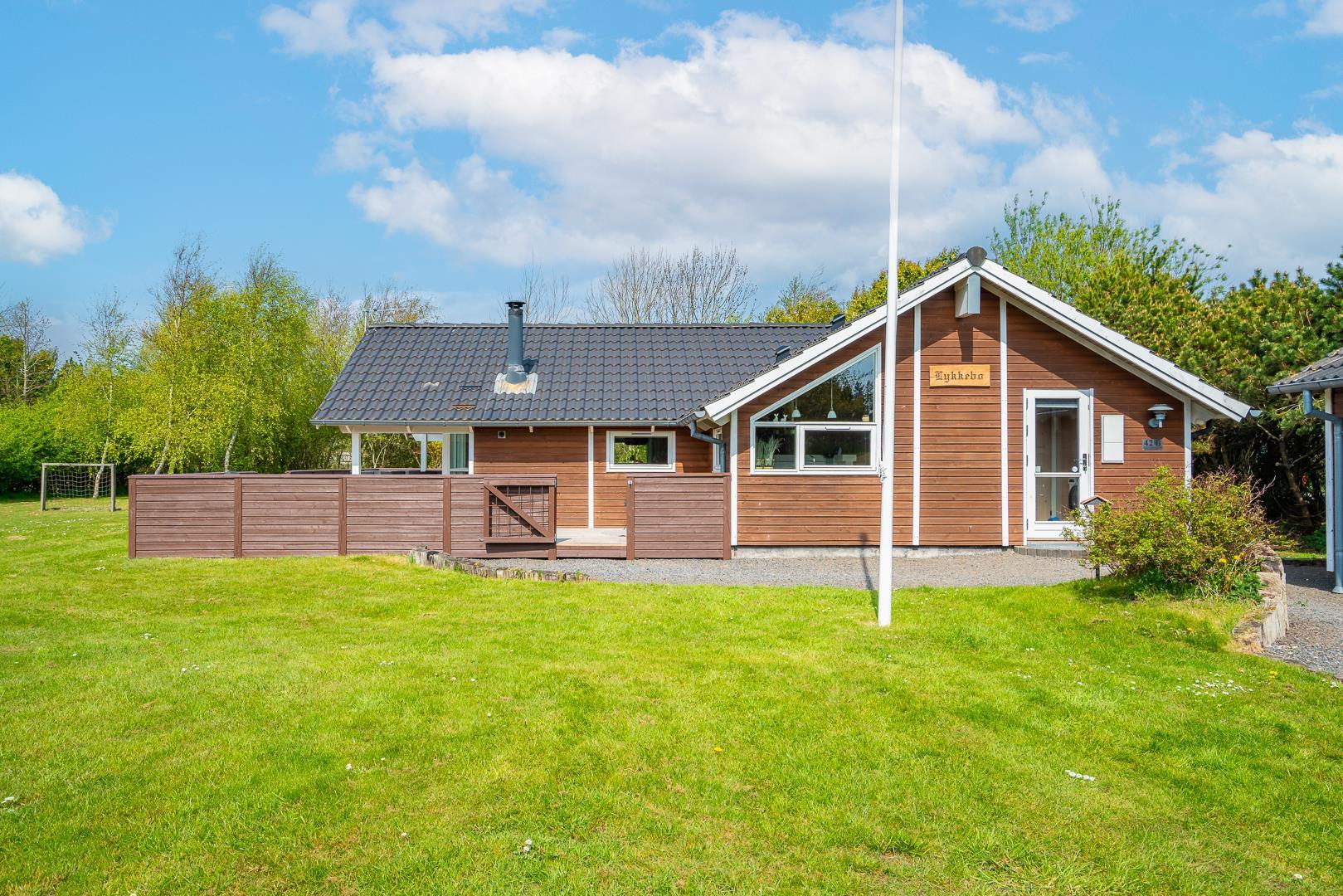 Lykkebo står der med sirlige bogstaver på et skilt, som pryder husets træbeklædte facade, og det navn er velvalgt, for det er svært at forestille sig en ferie her, der ikke byder på momenter af lykke: Lykke i form af en velgrillet bøf på terrassen en lun sommeraften. Lykke i form af det perfekte, snorlige drive på golfbanen. Eller lykke i form af børnenes latter, når de laver skruehop på trampolinen i haven.