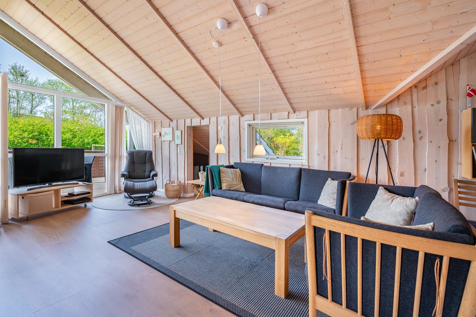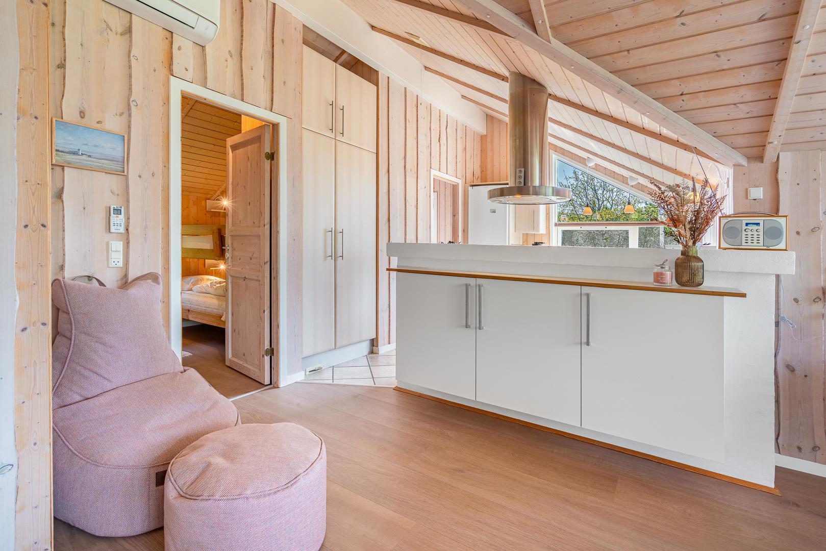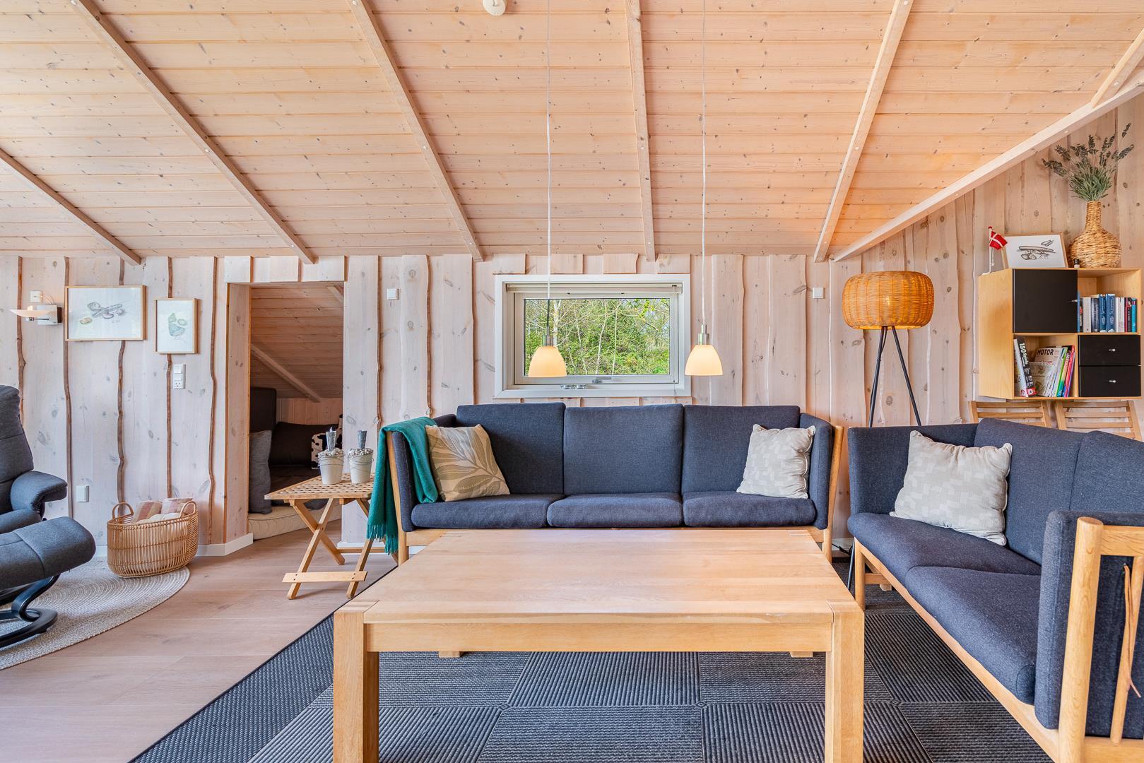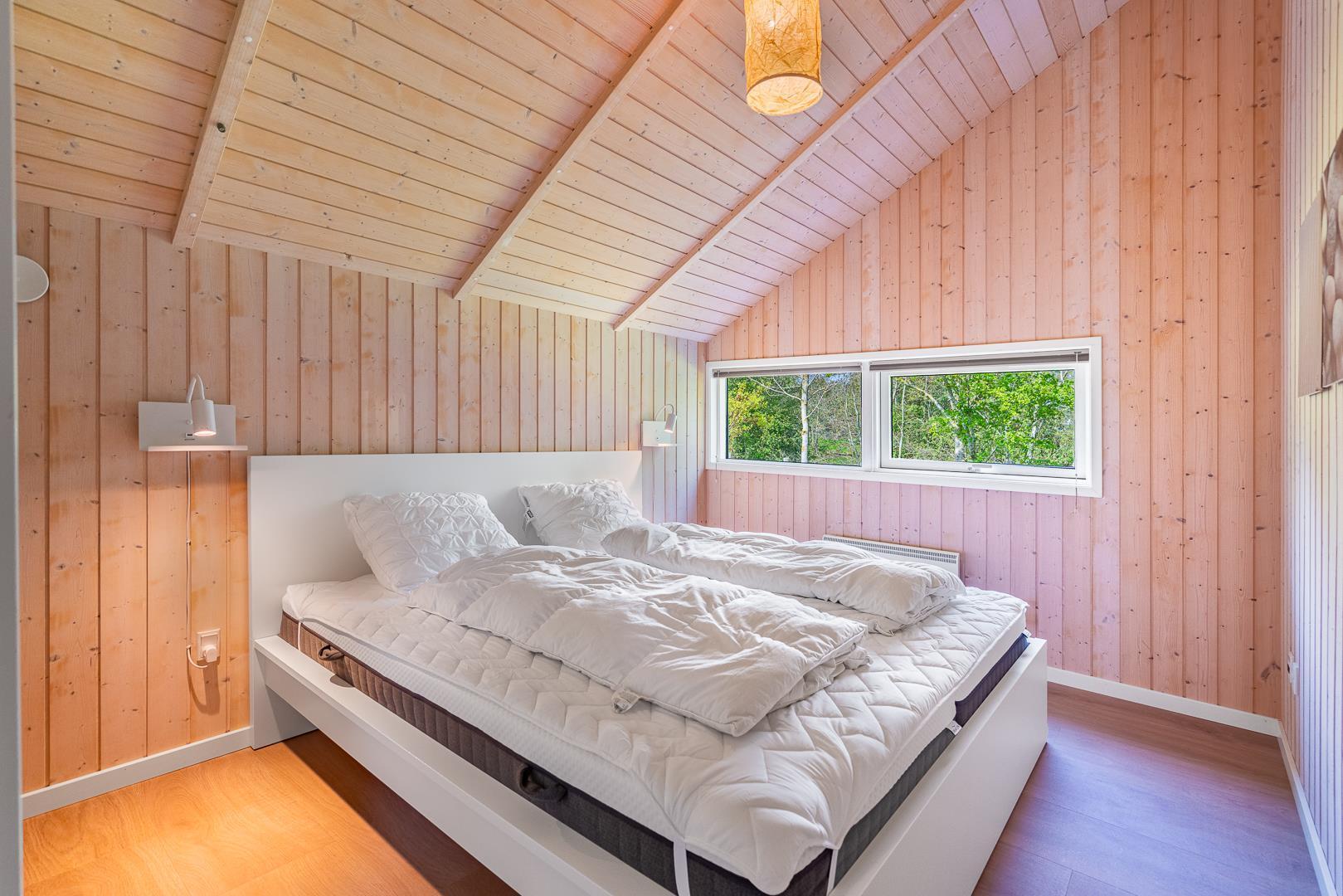 Huset byder blandt andet på brændeovn, vaskefaciliteter, centralstøvsuger og gratis Wi-Fi, og det har har i alt syv sovepladser fordelt på tre soveværelser to med dobbeltsenge, et med enkeltseng samt en alkove og et værelse med køjesenge. Der er både toilet og badeværelse i huset sidstnævnte med både spa og sauna.