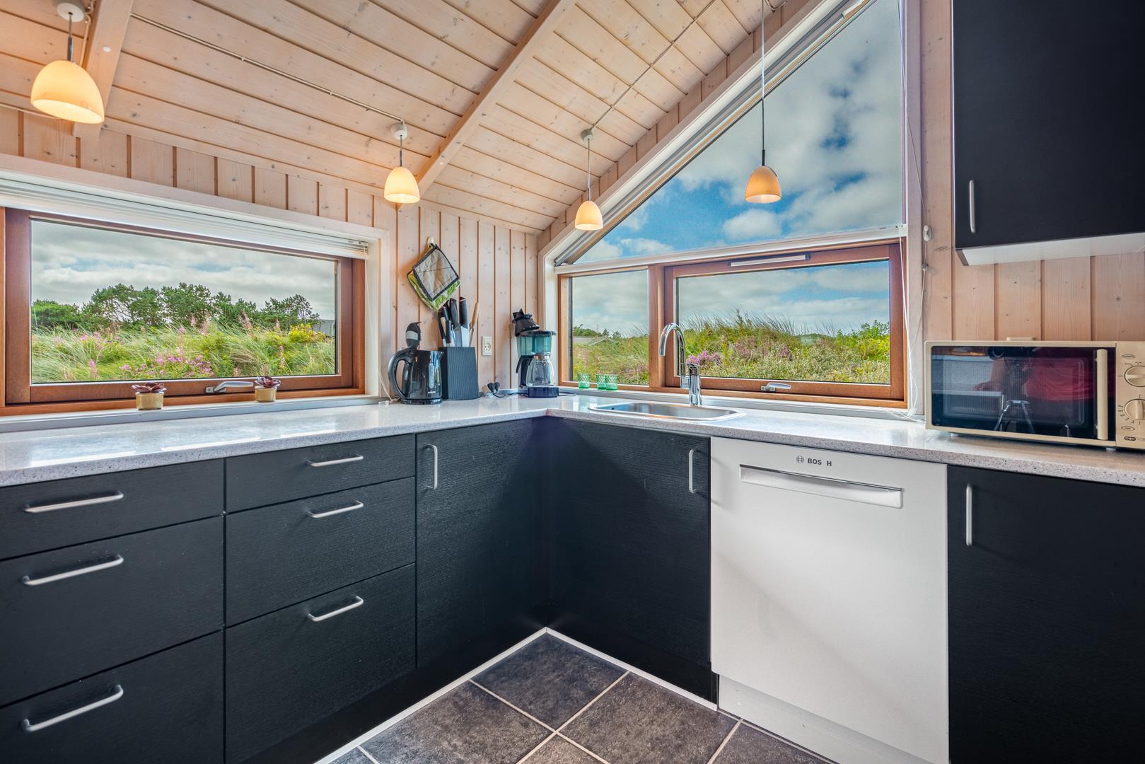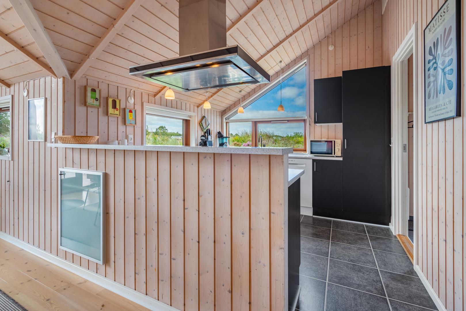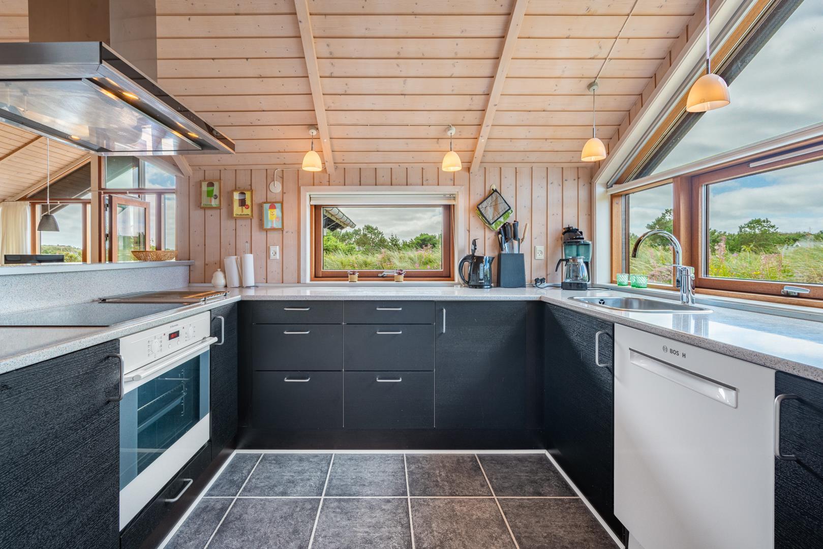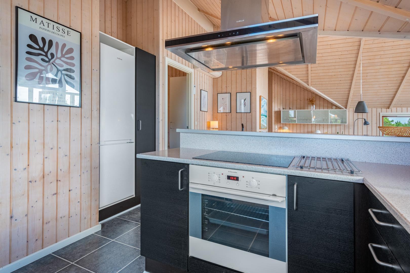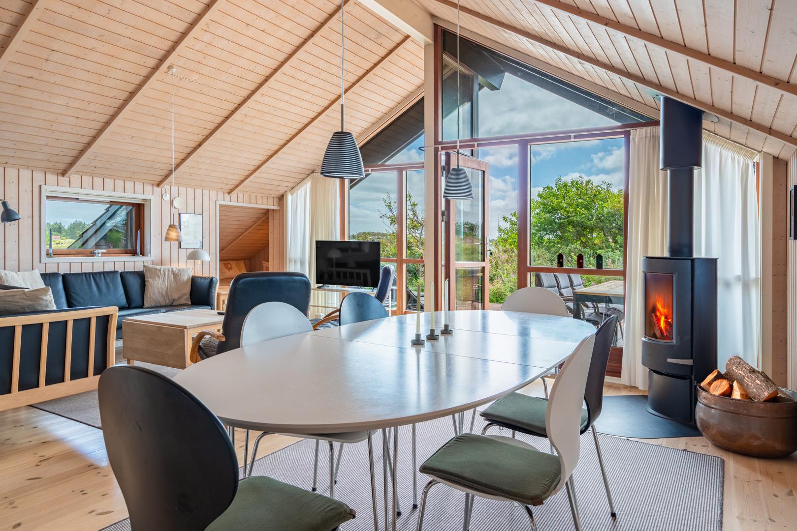 Det lyse opholdsområde med brændeovn skaber ægte hygge – især efter lange gåture på stranden. Den energibesparende varmepumpe sikrer behagelige temperaturer året rundt, og det åbne, moderne køkken med opvaskemaskine gør fælles madlavning nem og hyggelig.