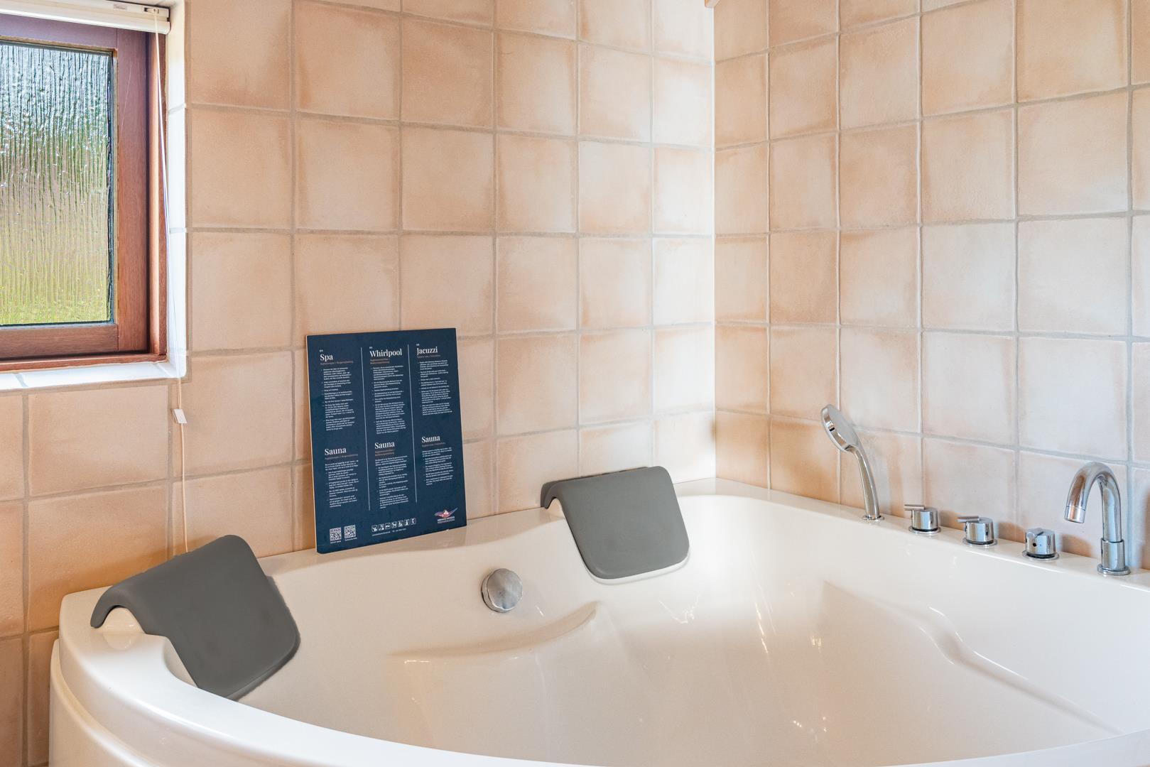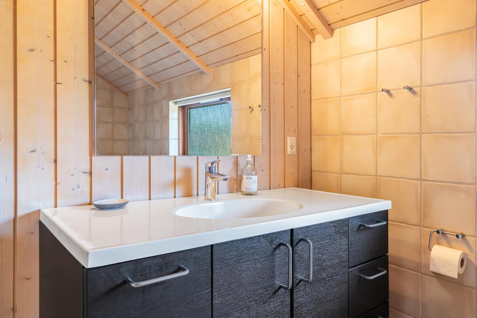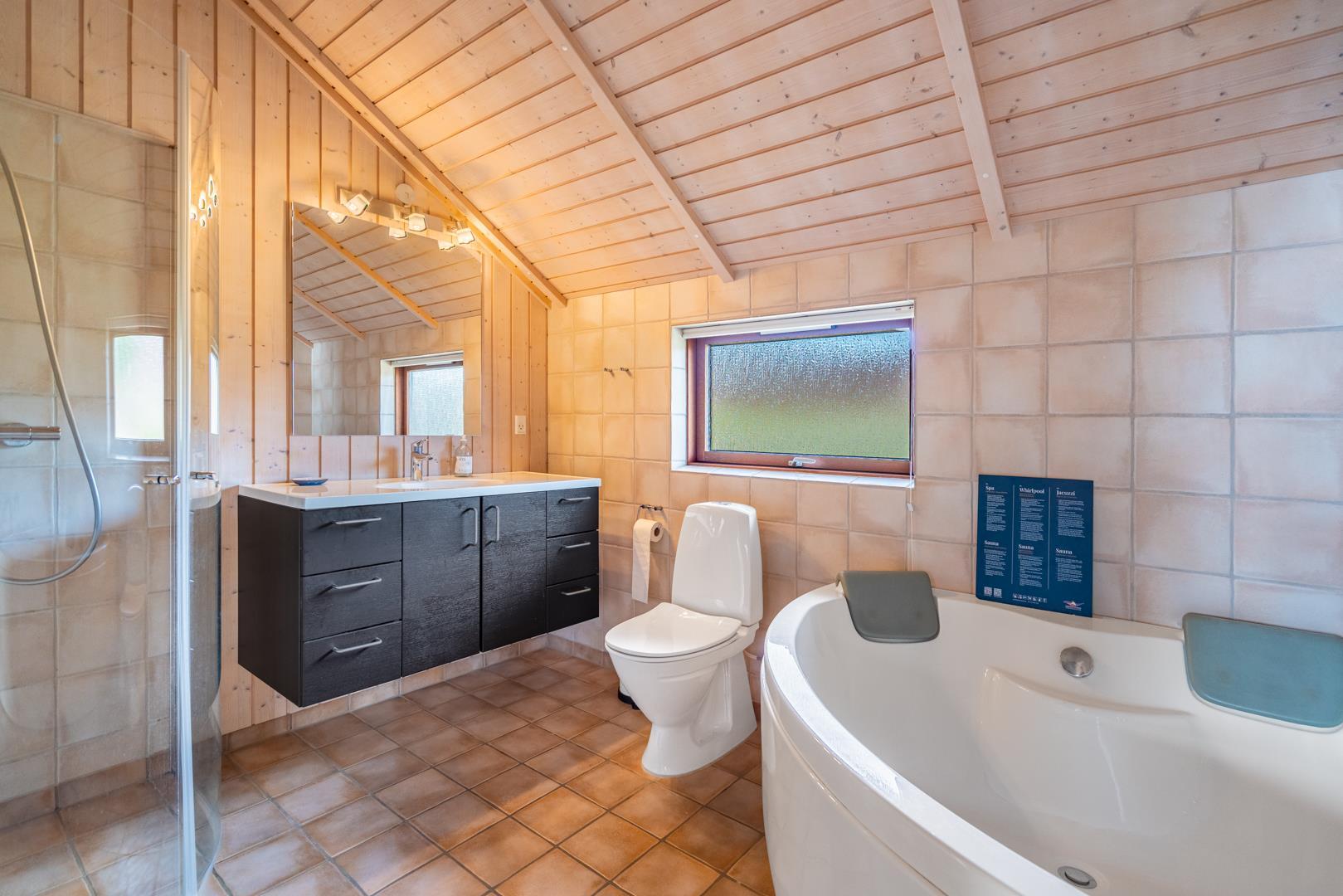 På badeværelset venter ren komfort: Gulvvarme, badekar og en privat sauna gør dette sommerhus i Henne Strand til det perfekte valg til afslapning – også uden for sommermånederne.